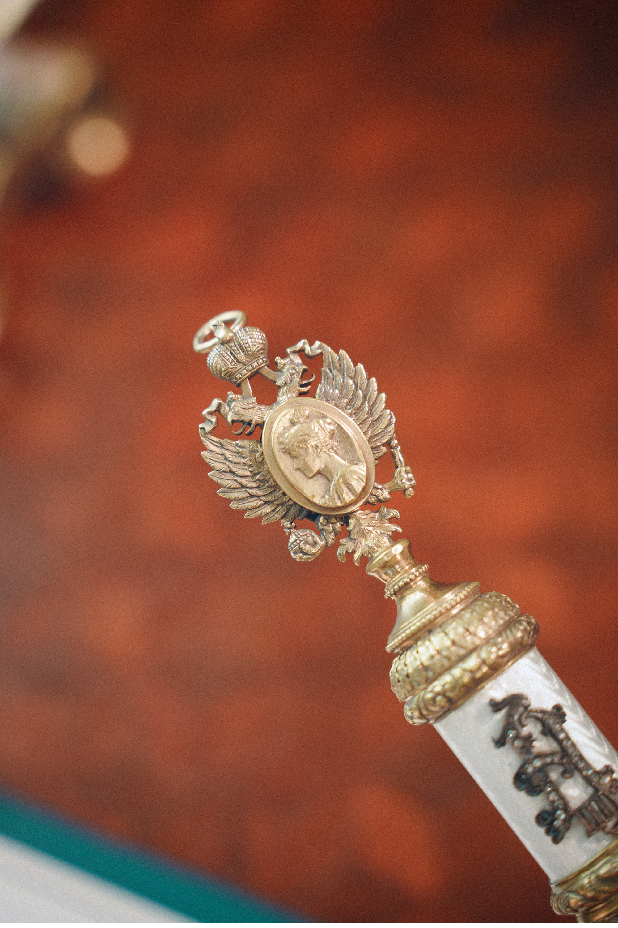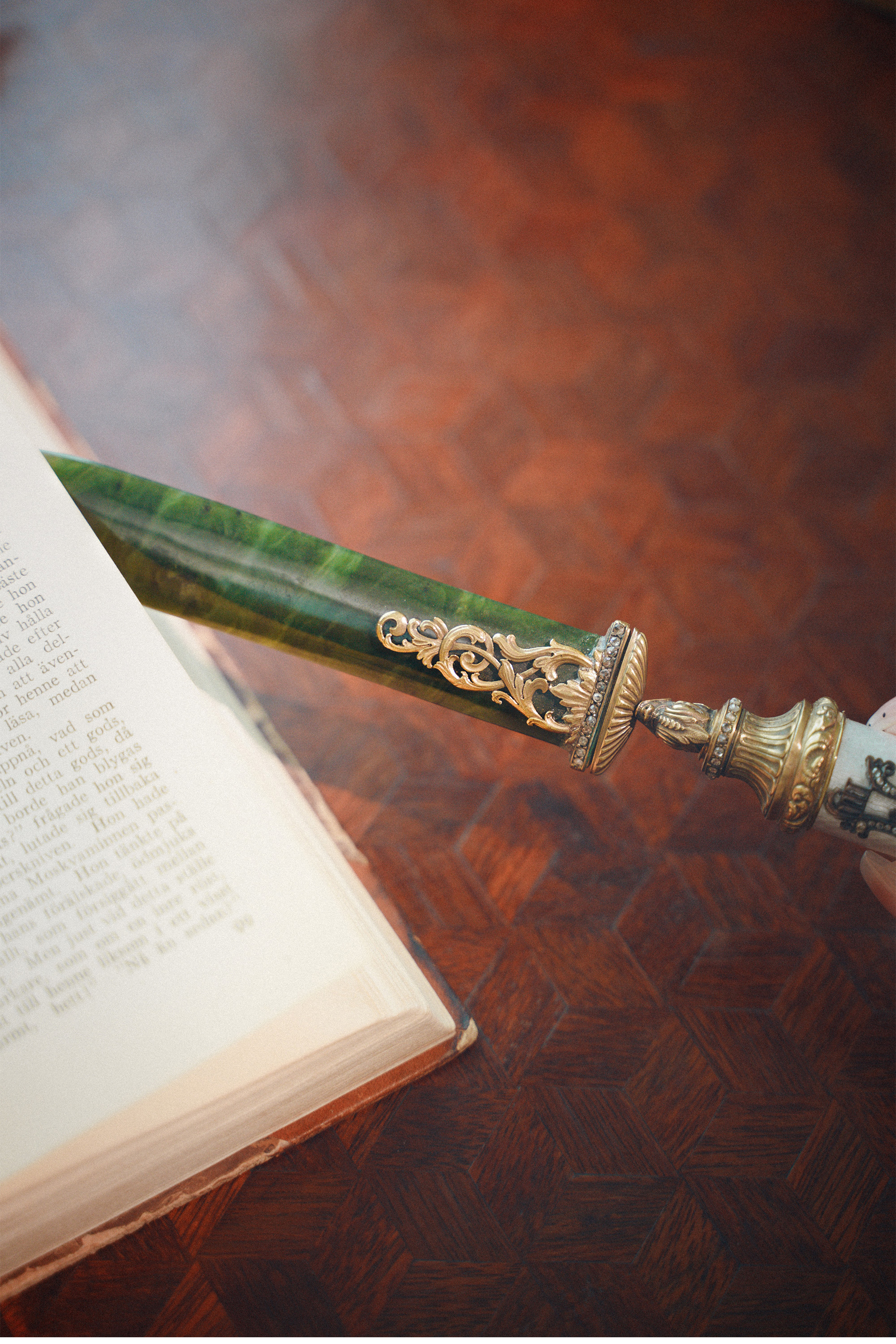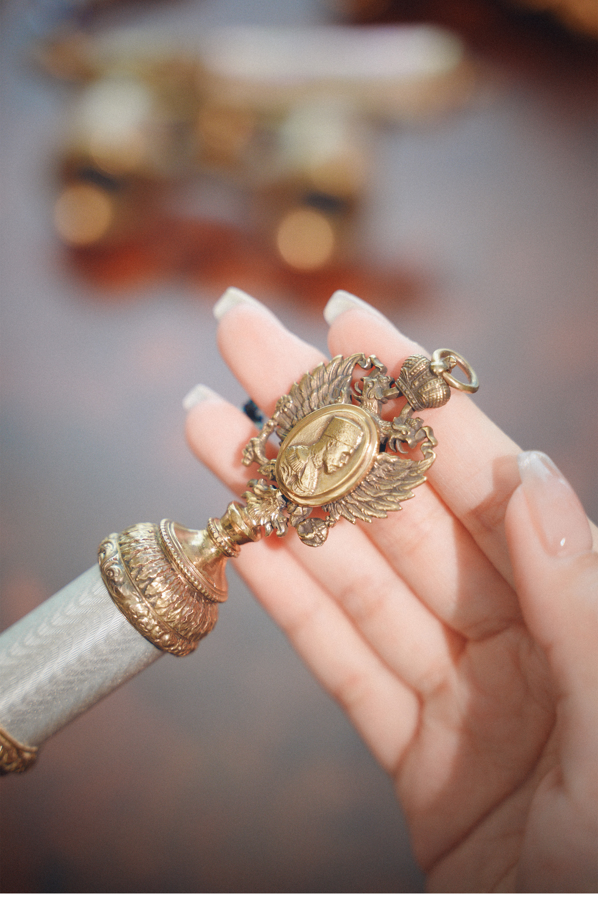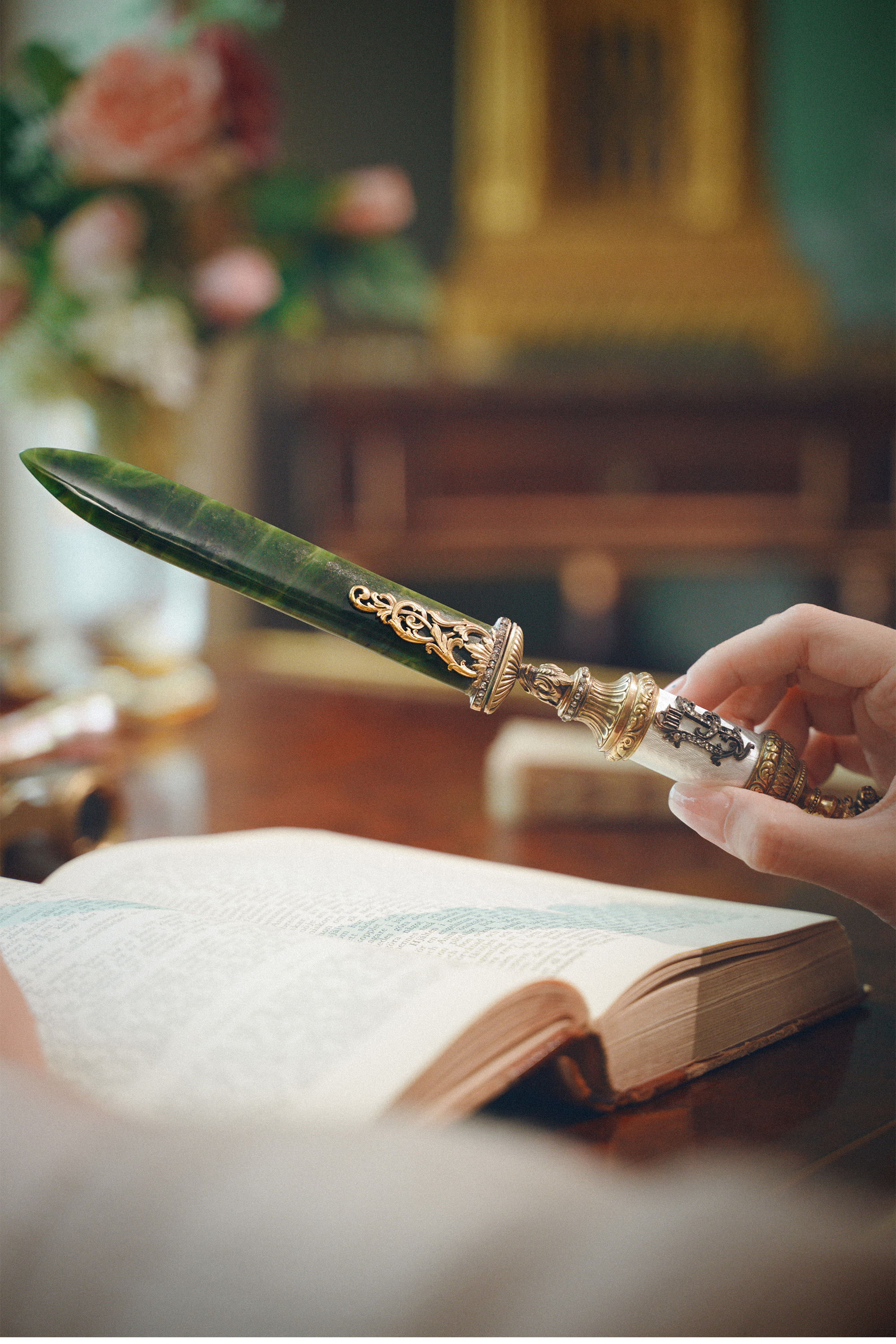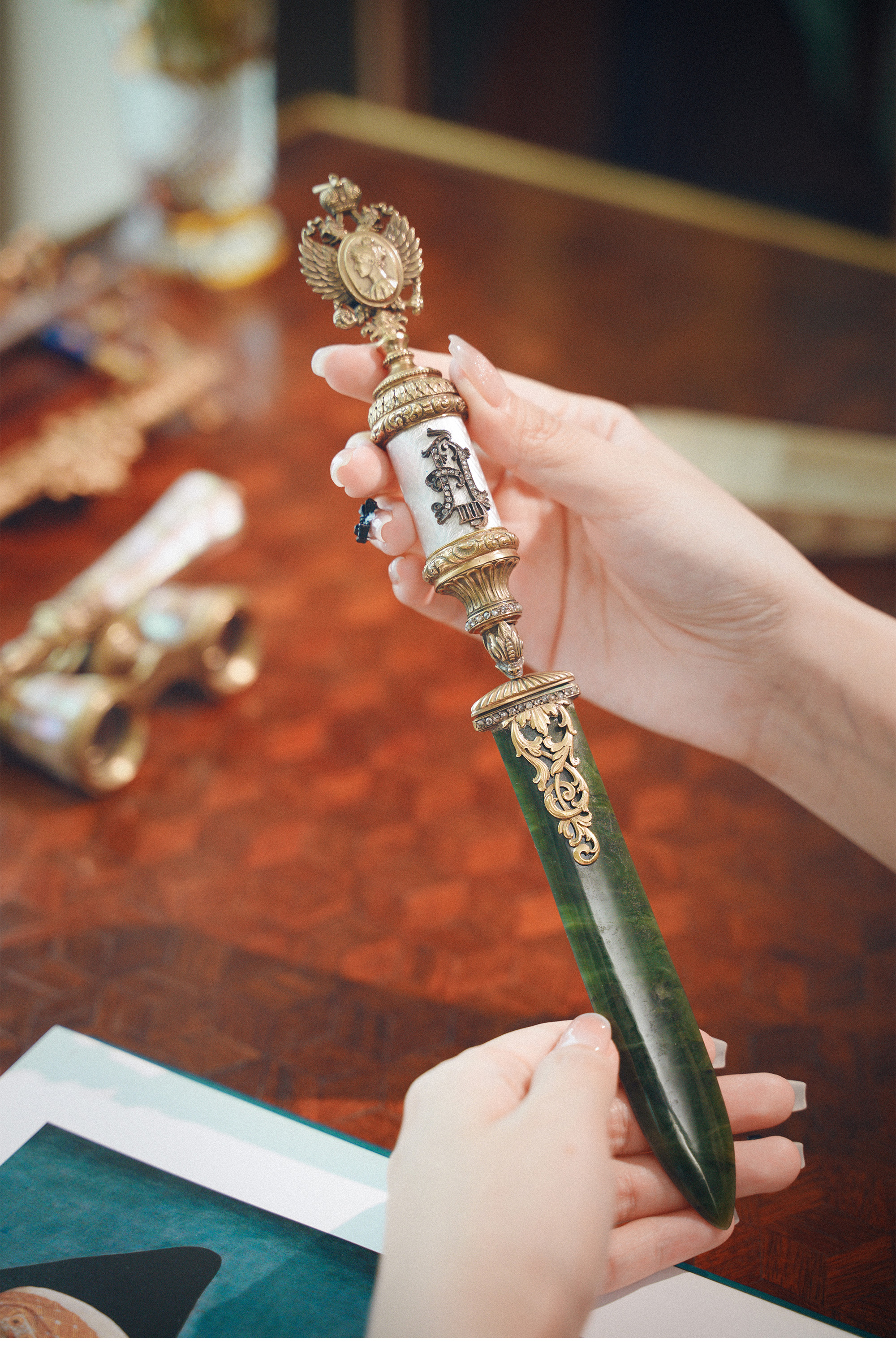19世纪俄罗斯出品纯银镀金贵族双面肖像镶嵌钻石白色玑镂珐琅碧玉翻书杖