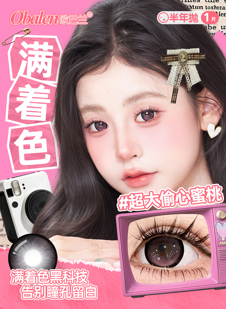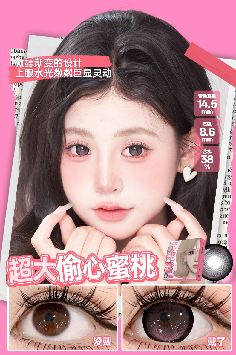 新品【超大满着色】方盒系列Obalen欧巴兰扩瞳显色【超大偷心蜜桃】14.5大直径蜜桃玻璃珠自带温柔滤镜半年抛美瞳非离子隐形眼镜2片装