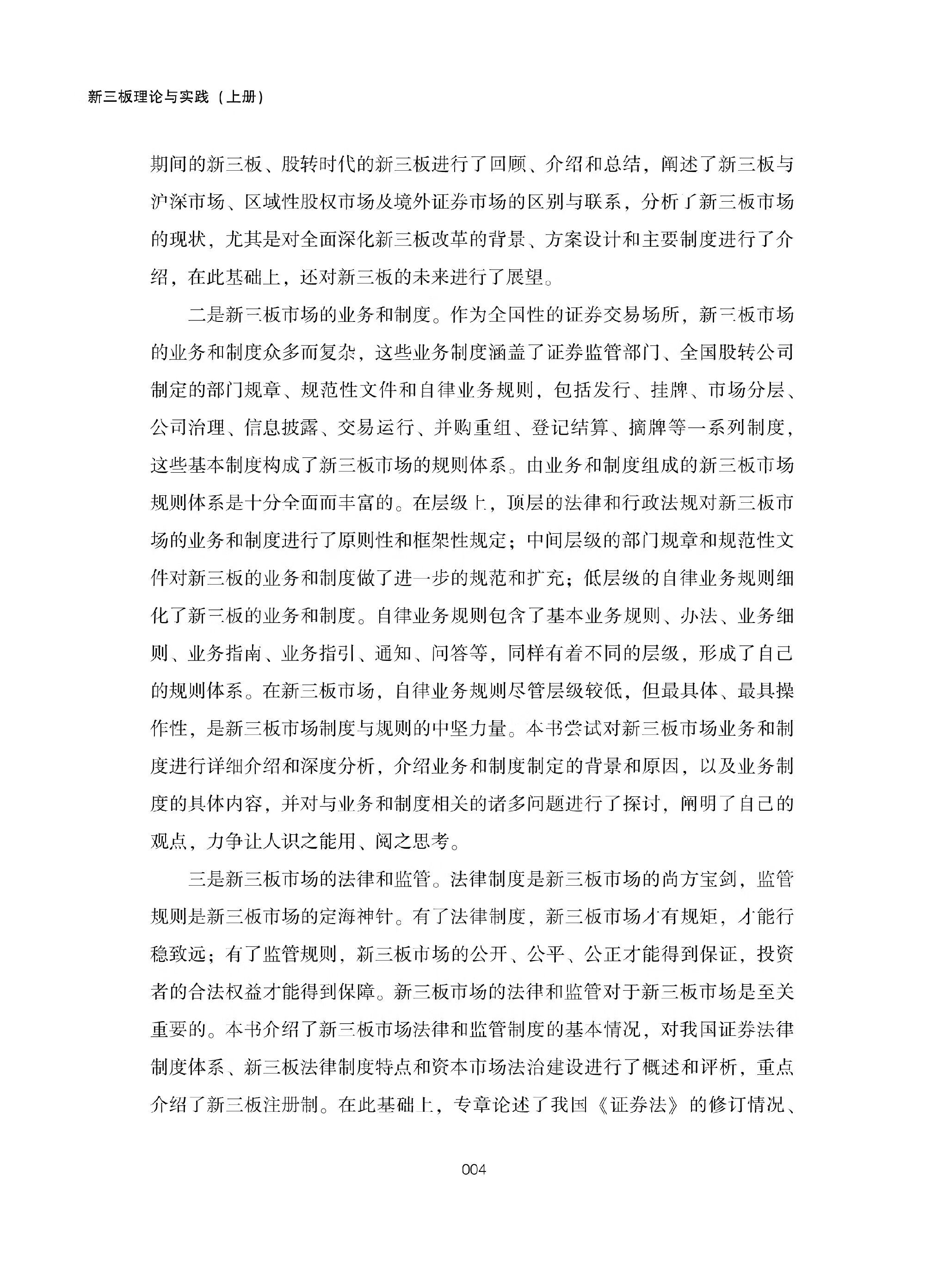 本套书下册介绍了新三板市场法律和监管制度的基本情况,对我国证券法律制度体系、新三板法律制度特点和资本市场法治建设进行了概述和评析。在此基础上,专章论述了我国《证券法》的修订情况、修订内容和修订亮点以及新《证券法》中的新三板内容。对新三板的监管制度进行了论述,探讨了证券监管的目标、构架,监管措施和法律责任以及证券监管中的相关问题,新三板监管的依据,新三板的行政监管和自律监管等。讨论了新三板的投资者保护问题,对投资者保护的成绩与不足、投资者保护的相关问题、投资者保护机构、持股行权、纠纷调解、支持诉讼和示范判决、先行赔付等投资者保护的主要制度进行了介绍。