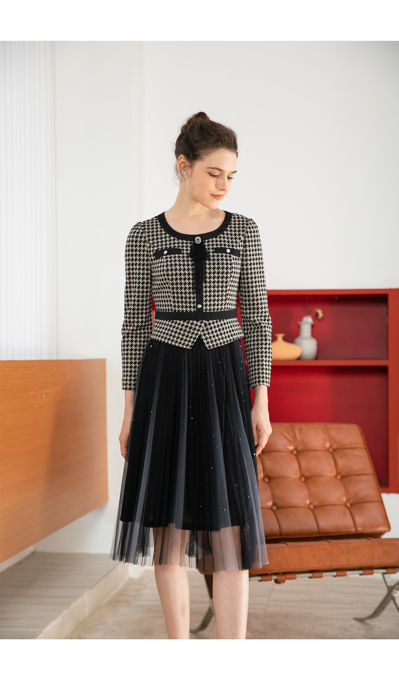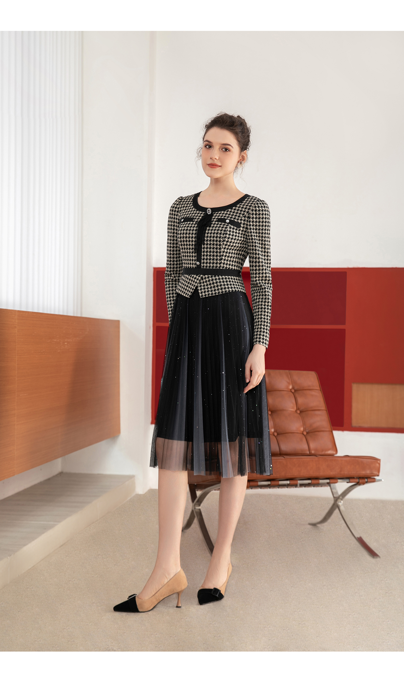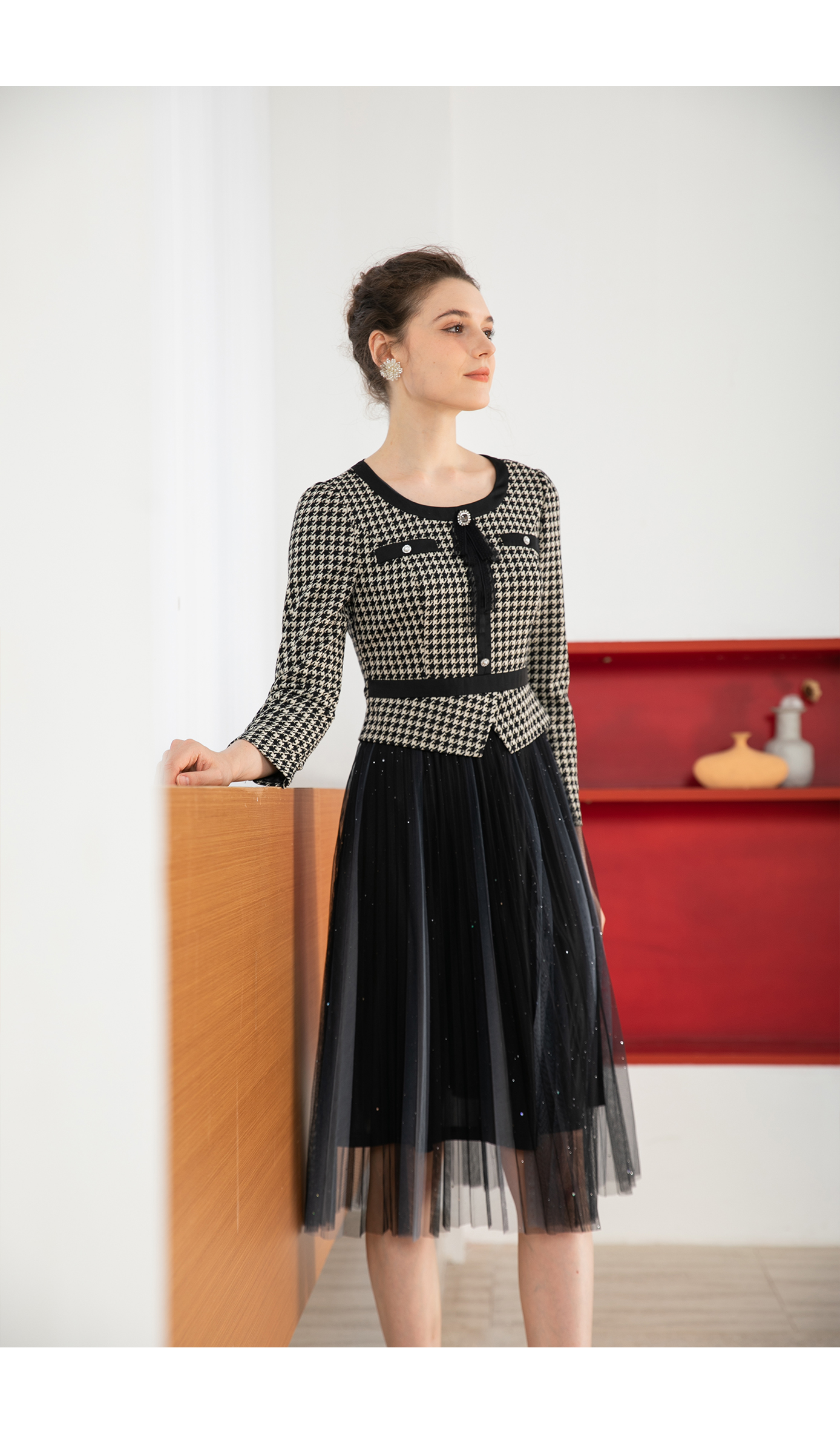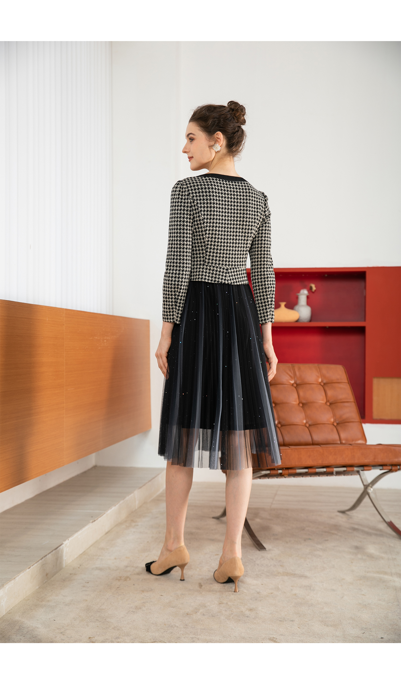 司歌格纹假两件拼网纱连衣裙收腰长袖秋冬A901259X