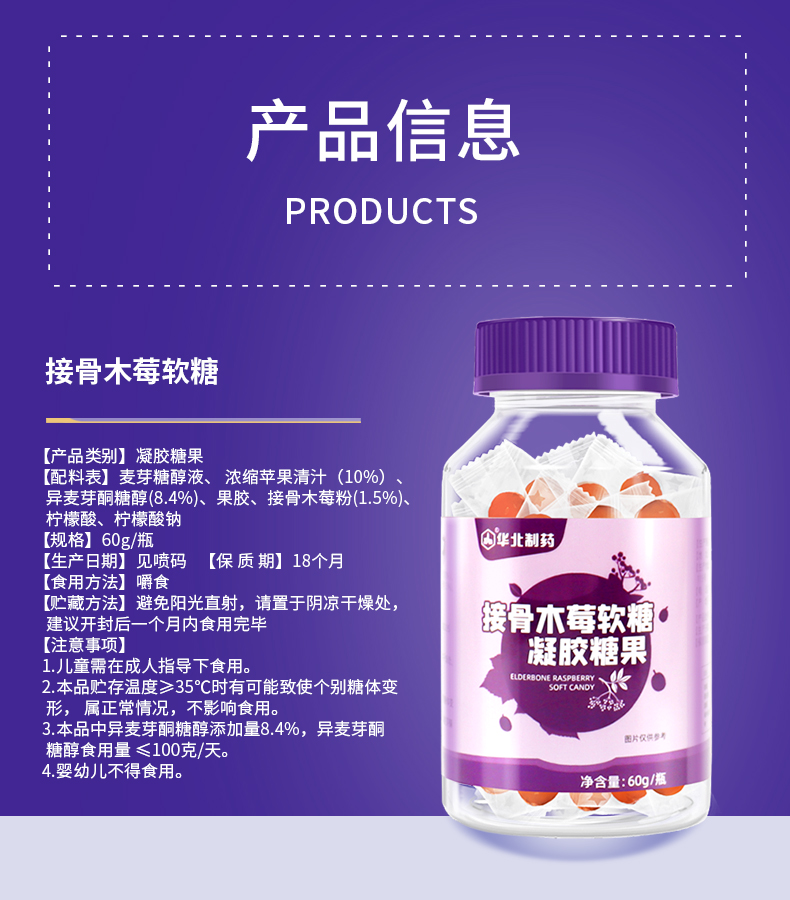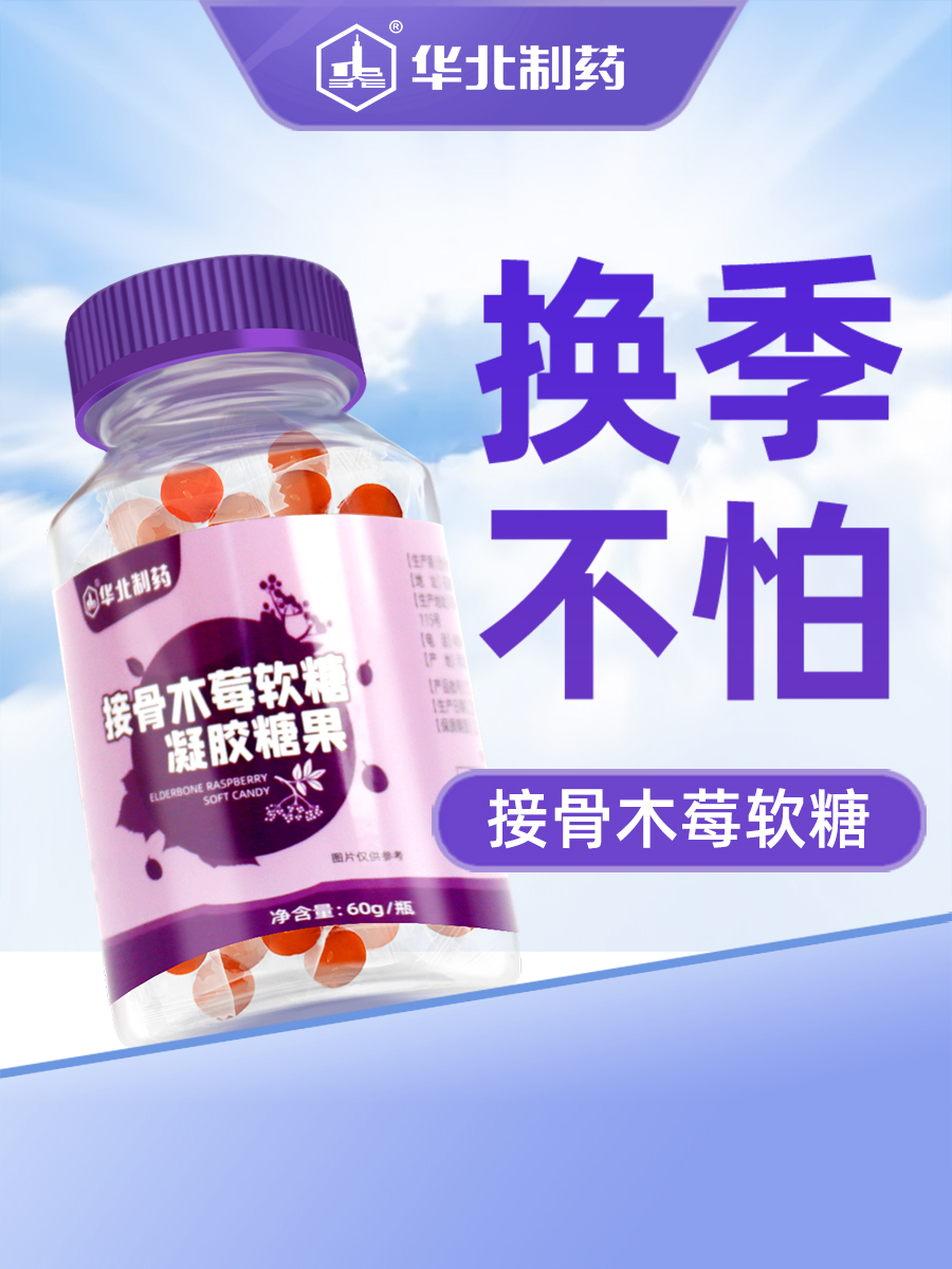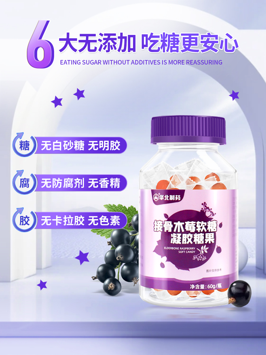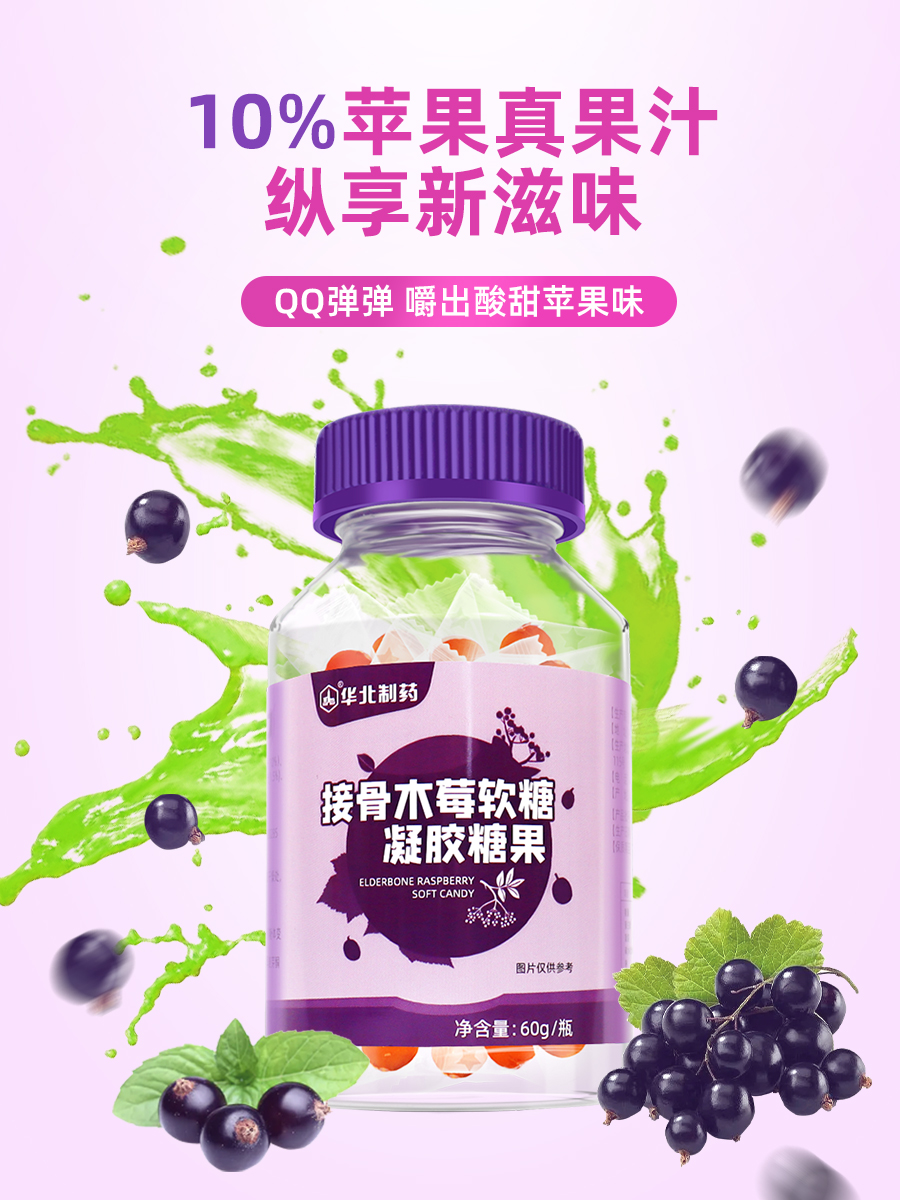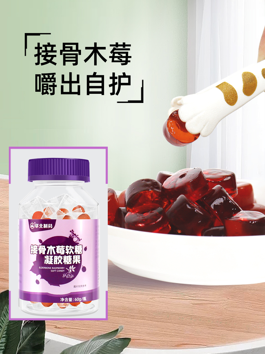【华北制药】买二送三!接骨木、酸枣仁γ氨基丁酸软糖60g/瓶,儿童、成人都可以吃,富含多种维生素,提高免疫力,下单即送2对眼贴,