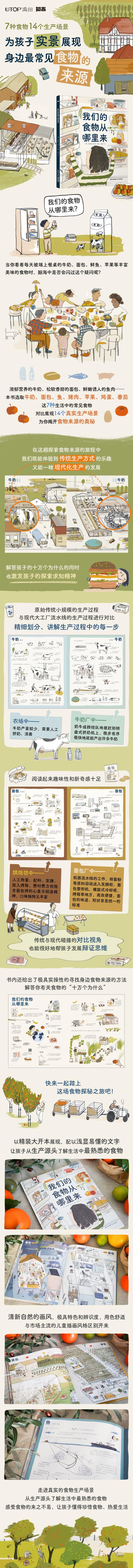 ★7种食物14个生产场景,精细分类的知识内容,为孩子实景展现身边最常见食物的来源★从生产场景全貌图的展现到生产过程细节图的解读,书内蕴含的知识点十分丰富,解答孩子的十万个为什么的同时,也激发孩子的探索求知精神★原始小规模的生产方式与大工厂流水线的生产方式进行对比,让孩子既能体验到原始传统的乐趣,也能一睹现代化生产的发展,认识到技术给我们的生活带来的便利。展现传统与现代碰撞的对比视角也能很好地帮孩子发展辩证思维★本书画风清新自然,极具特色和辨识度,用色舒适,与市场主流的儿童插画风格区别开来,以精装大开本展现,配以浅显易懂的文字,阅读起来趣味性和新奇感十足,让孩子在了解食物来源的同时,感受到食物的来之不易