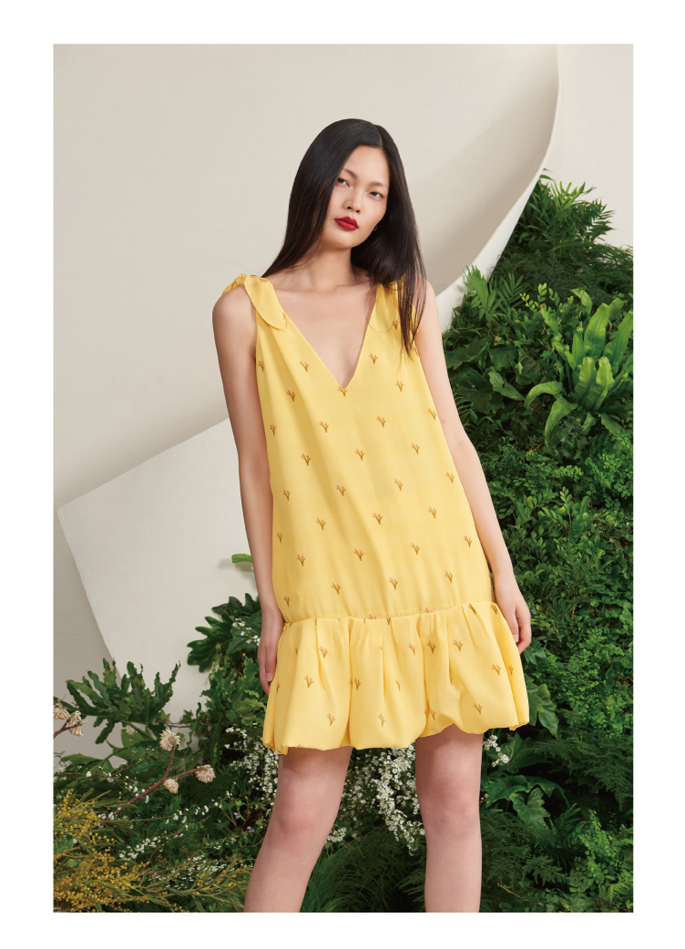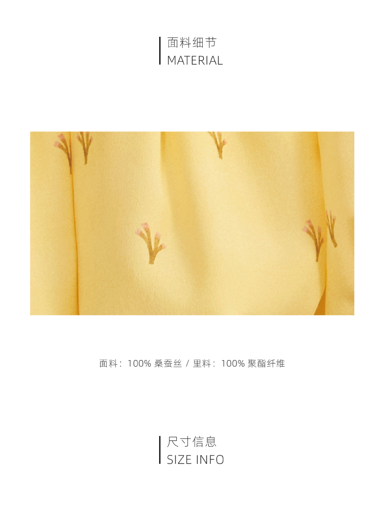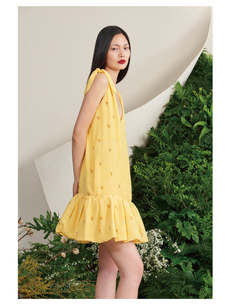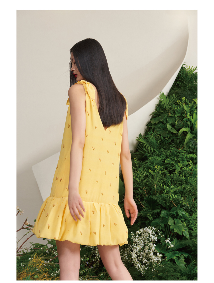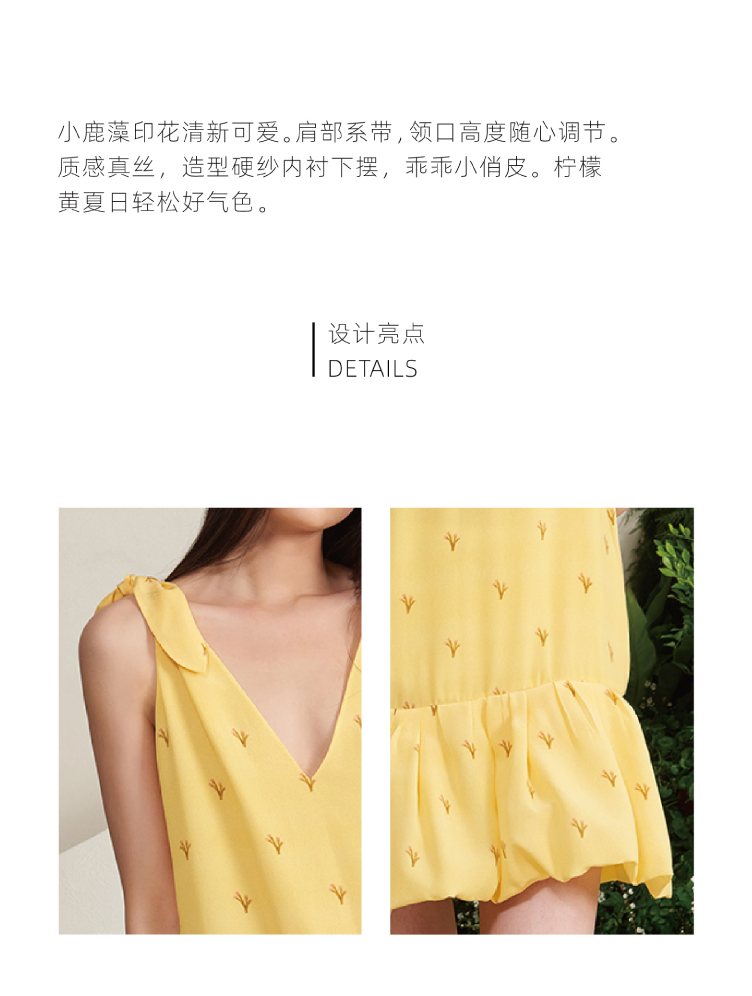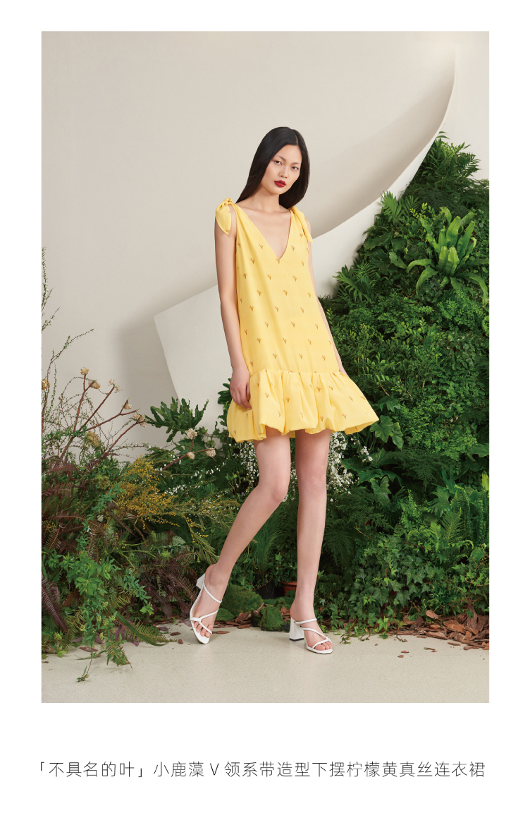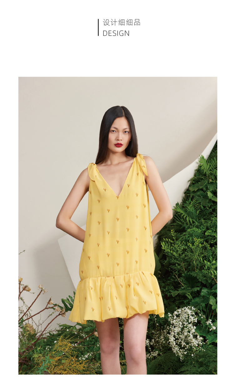 【不具名的叶】小鹿藻V领系带造型下摆柠檬黄真丝连衣裙/0000702G