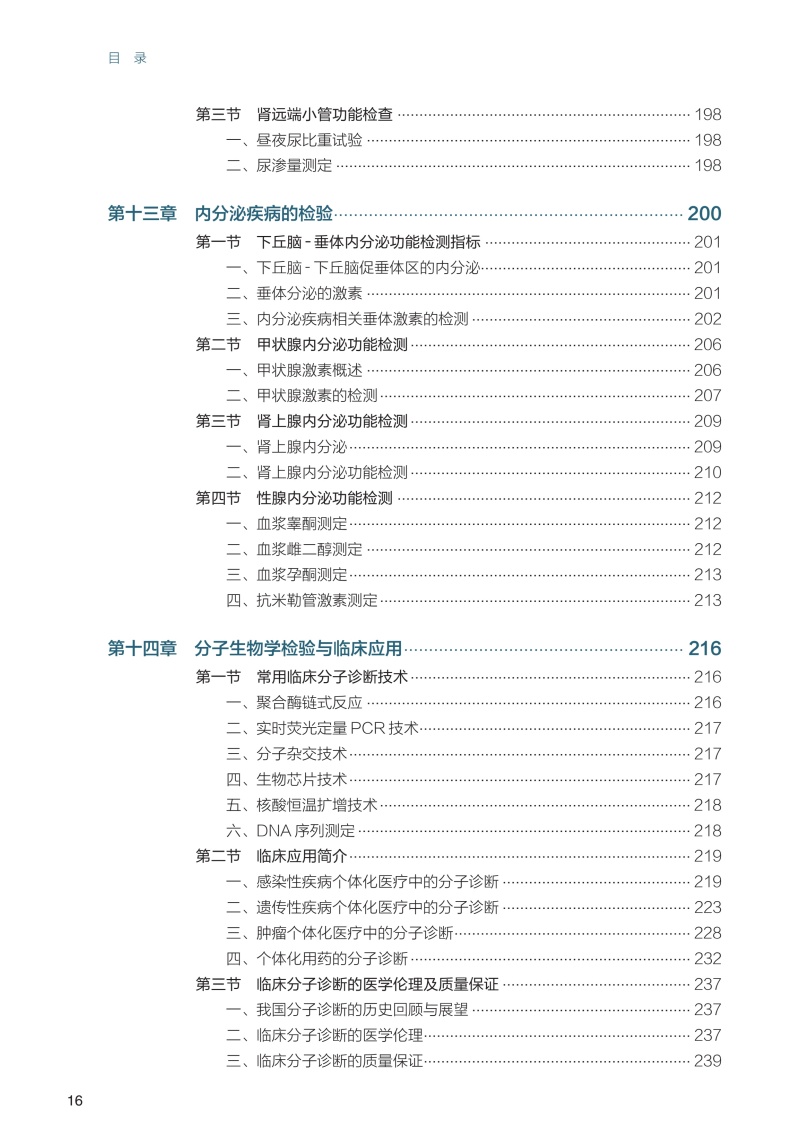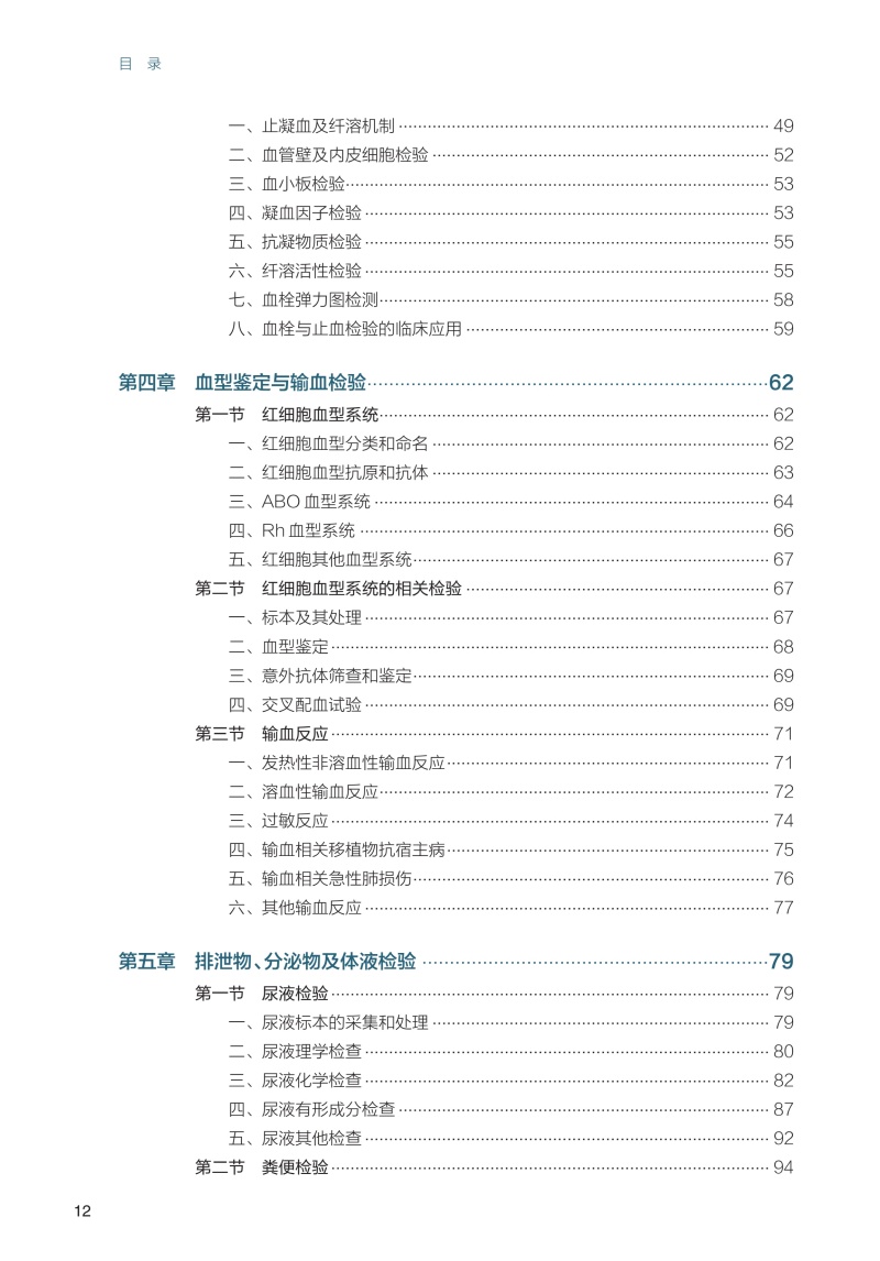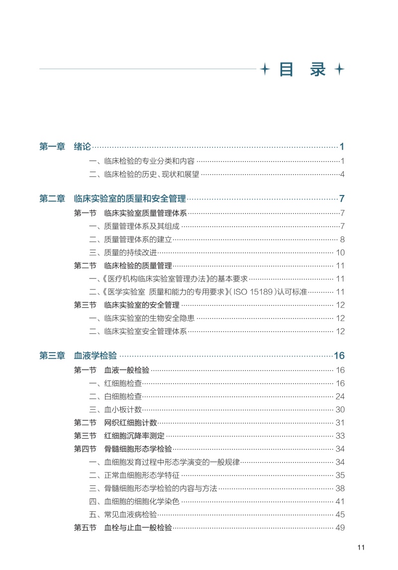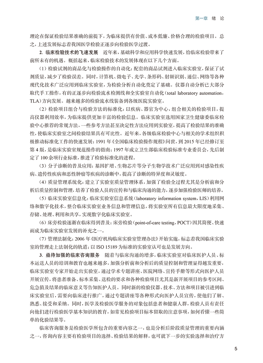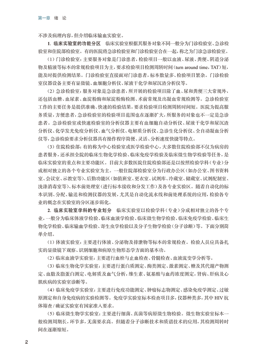第一章 绪论/ 1 一、 临床检验的专业分类和内容/1 二、 临床检验的历史、现状和展望/4 第二章 临床实验室的质量和安全管理/7 第一节 临床实验室质量管理体系/7 一、 质量管理体系及其组成/7 二、 质量管理体系的建立/ 8 三、 质量的持续改进/ 10 第二节 临床检验的质量管理/ 11 一、 《医疗机构临床实验室管理办法》的基本要求/ 11 二、 《医学实验室 质量和能力的专用要求》(ISO 15189)认可标准/ 11 第三节 临床实验室的安全管理/ 12 一、 临床实验室的生物安全隐患/ 12 二、 临床实验室安全管理体系/ 12 第三章 血液学检验/16 第一节 血液一般检验/ 16 一、 红细胞检查/ 16 二、 白细胞检查/ 24 三、 血小板计数/ 30 第二节 网织红细胞计数/ 31 第三节 红细胞沉降率测定/ 33 第四节 骨髓细胞形态学检验/ 34 一、 血细胞发育过程中形态学演变的一般规律/ 34 二、 正常血细胞形态学特征/ 35 三、 骨髓细胞形态学检验的内容与方法/ 38 四、 血细胞的细胞化学染色/ 41 五、 常见血液病检验/ 45 第五节 血栓与止血一般检验/ 49 一、 止凝血及纤溶机制/ 49 二、 血管壁及内皮细胞检验/ 52 三、 血小板检验/ 53 四、 凝血因子检验/ 53 五、 抗凝物质检验/ 55 六、 纤溶活性检验/ 55 七、 血栓弹力图检测/ 58 八、 血栓与止血检验的临床应用/ 59 第四章 血型鉴定与输血检验/62 第一节 红细胞血型系统/ 62 一、 红细胞血型分类和命名/ 62 二、 红细胞血型抗原和抗体/ 63 三、 ABO 血型系统/ 64 四、 Rh 血型系统/ 66 五、 红细胞其他血型系统/ 67 第二节 红细胞血型系统的相关检验/ 67 一、 标本及其处理/ 67 二、 血型鉴定/ 68 三、 意外抗体筛查和鉴定/ 69 四、 交叉配血试验/ 69 第三节 输血反应/ 71 一、 发热性非溶血性输血反应/ 71 二、 溶血性输血反应/ 72 三、 过敏反应/ 74 四、 输血相关移植物抗宿主病/ 75 五、 输血相关急性肺损伤/ 76 六、 其他输血反应/ 77 第五章 排泄物、分泌物及体液检验/79 第一节 尿液检验/ 79 一、 尿液标本的采集和处理/ 79 二、 尿液理学检查/ 80 三、 尿液化学检查/ 82 四、 尿液有形成分检查/ 87 五、 尿液其他检查/ 92 第二节 粪便检验/ 94 一、 粪便标本采集/ 94 二、 粪便理学检查/ 94 三、 粪便化学检查/ 95 四、 粪便有形成分检查/ 96 第三节 浆膜腔积液和脑脊液检验/ 98 一、 浆膜腔积液检验/ 98 二、 脑脊液检验/ 100 第四节 精液和前列腺液的常规检验/ 101 一、 精液检验/ 101 二、 前列腺液检验/ 106 第五节 阴道分泌物常规检验/ 108 一、 标本采集和处理/ 108 二、 阴道分泌物一般检验/ 108 第六章 血清蛋白质检验/113 第一节 概述/ 113 一、 血清蛋白质的组成和性质/ 113 二、 主要血清蛋白质及其功能/ 114 三、 其他血清蛋白质/ 116 第二节 血清蛋白质的测定/ 117 一、 总蛋白质测定/ 117 二、 白蛋白测定/ 118 三、 球蛋白测定/ 119 四、 血清蛋白电泳/ 119 第七章 糖代谢紊乱的检验/122 第一节 糖代谢紊乱/ 122 一、 糖尿病的定义与分型/ 122 二、 糖尿病的诊断标准/ 123 三、 糖尿病的主要代谢紊乱/ 123 第二节 糖代谢紊乱的主要检测项目/ 123 一、 空腹血糖/ 123 二、 餐后2 小时血糖/ 125 三、 葡萄糖耐量试验/ 126 四、 糖化蛋白质/ 127 五、 血糖调节物/ 129 六、 糖尿病并发症相关检测/ 130 第八章 脂质代谢紊乱的检验/ 133 第一节 血浆脂质和脂蛋白代谢及其紊乱/ 133 一、 血浆脂蛋白/ 133 二、 载脂蛋白/ 134 三、 脂蛋白受体/ 135 四、 脂蛋白代谢及其紊乱/ 138 第二节 脂蛋白和脂质代谢紊乱的实验室检测/ 144 一、 血清(浆)脂质测定/ 144 二、 血清(浆)脂蛋白和载脂蛋白检测/ 147 三、 脂蛋白电泳/ 150 第九章 水、电解质与酸碱平衡失调的检验/ 152 第一节 水、电解质平衡的检验/ 152 一、 血清钾测定/ 152 二、 血清钠测定/ 154 三、 血清氯测定/ 155 四、 血清钙测定/ 156 五、 血清磷测定/ 157 六、 血清镁测定/ 158 七、 血浆渗透压测定/ 159 第二节 血气分析与酸碱平衡/ 160 一、 血pH 测定/ 160 二、 血二氧化碳分压测定/ 161 三、 血氧分压测定/ 162 四、 血氧饱和度测定/ 162 五、 肺泡- 动脉氧分压差测定/ 164 六、 实际碳酸氢盐及标准碳酸氢盐测定/ 164 七、 缓冲碱测定/ 165 八、 碱剩余测定/ 165 九、 阴离子间隙测定/ 165 十、 二氧化碳总量测定/ 166 十一、 血气分析的方法评价/ 166 第三节 酸碱平衡紊乱的分析/ 168 一、 单纯性酸碱平衡紊乱/ 168 二、 混合型酸碱平衡紊乱/ 169 第十章 诊断酶学和肝胆胰疾病的检验/171 第一节 诊断酶学/ 171 一、 概述/ 171 二、 酶测定技术/ 172 第二节 肝胆疾病的临床生物化学检验/ 174 一、 概述/ 174 二、 肝胆疾病生物化学检测指标/ 174 第三节 胰腺疾病的临床生物化学检验/ 180 一、 概述/ 180 二、 胰腺疾病生物化学检测指标/ 180 第十一章 心脏疾病的检验/ 183 第一节 心肌缺血及损伤的检测指标/ 183 一、 肌酸激酶检测/ 183 二、 肌酸激酶同工酶检测/ 184 三、 心肌肌钙蛋白T 的检测/ 185 四、 心肌肌钙蛋白I 的检测/ 186 五、 肌红蛋白的检测/ 186 六、 心肌型脂肪酸结合蛋白测定/ 187 第二节 心力衰竭的检测指标/ 188 一、 BNP 的检测/ 188 二、 NT-proBNP 的检测/ 188 三、 非对称二甲基精氨酸的检测/ 189 第十二章 肾脏疾病的检验/191 第一节 肾小球功能检查/ 191 一、 内生肌酐清除率测定/ 191 二、 肾小球滤过率估算/ 192 三、 血清肌酐测定/ 193 四、 血清尿素