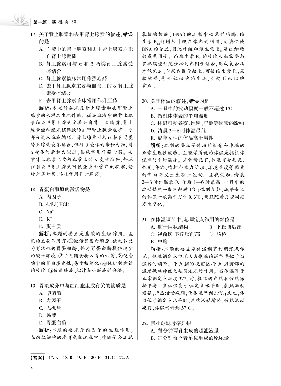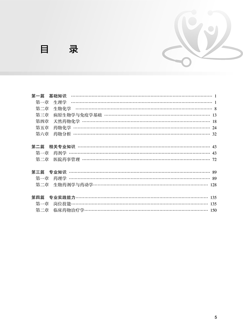 第一篇 基础知识 / 1 第一章 生理学 / 1 第二章 生物化学 / 8 第三章 病原生物学与免疫学基础 / 13 第四章 天然药物化学 / 18 第五章 药物化学 / 24 第六章 药物分析 / 32 第二篇 相关专业知识 / 43 第一章 药剂学 / 43 第二章 医院药事管理 / 72 第三篇 专业知识 / 89 第一章 药理学 / 89 第二章 生物药剂学与药动学/ 128 第四篇 专业实践能力/ 135 第一章 岗位技能/ 135 第二章 临床药物治疗学/ 150