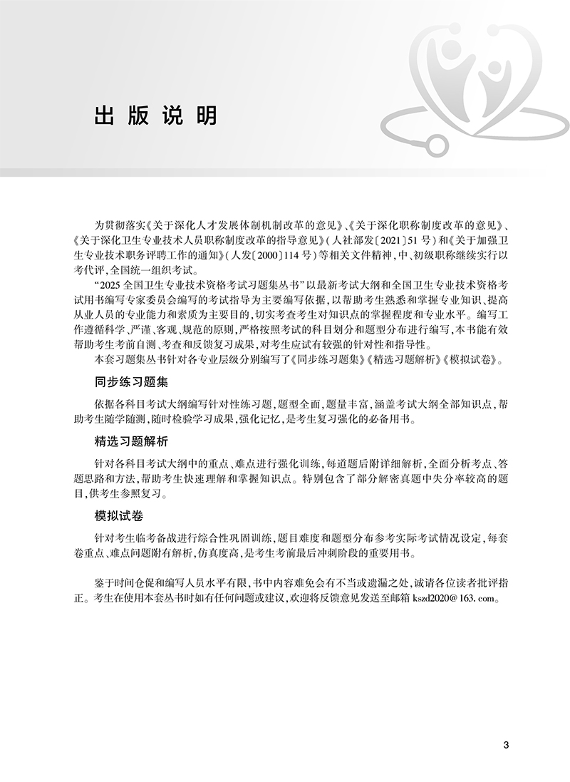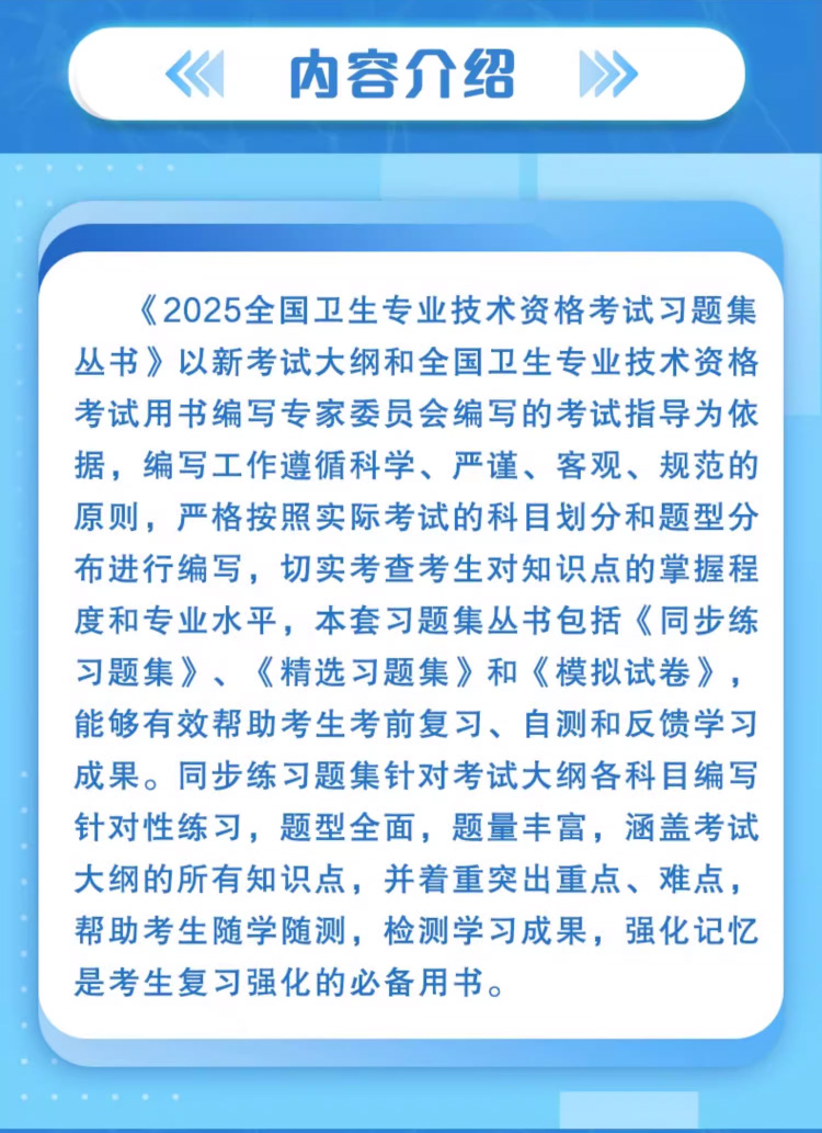 本套丛书以考试大纲和全国卫生专业技术资格考试专家委员会编写的《全国卫生专业技术资格考试指导》为主要编写依据,全面覆盖各类题型,帮助考生在解题的过程中尽快理解和掌握知识点。本套习题集是全国卫生专业技术资格考试专家委员会编写的推荐用书。《2025全国卫生专业技术资格考试习题集丛书》以最新考试大纲和全国卫生专业技术资格考试用书编写专家委员会编写的考试指导为依据,编写工作遵循科学、严谨、客观、规范的原则,严格按照实际考试的科目划分和题型分布进行编写,切实考查考生对知识点的掌握程度和专业水平,本套习题集丛书包括《同步练习题集》(《练习题集》)、《精选习题集》和《模拟试卷》,能够有效帮助考生考前复习、自测和反馈学习成果。精选习题解析针对各学科考试大纲中的重点难点进行强化训练,每题后附详细解析,全面分析考点、答题思路和方法,帮助考生尽快理解和掌握知识点。特别包含了部分解密真题中失分率较高的题目,供考生参照复习。