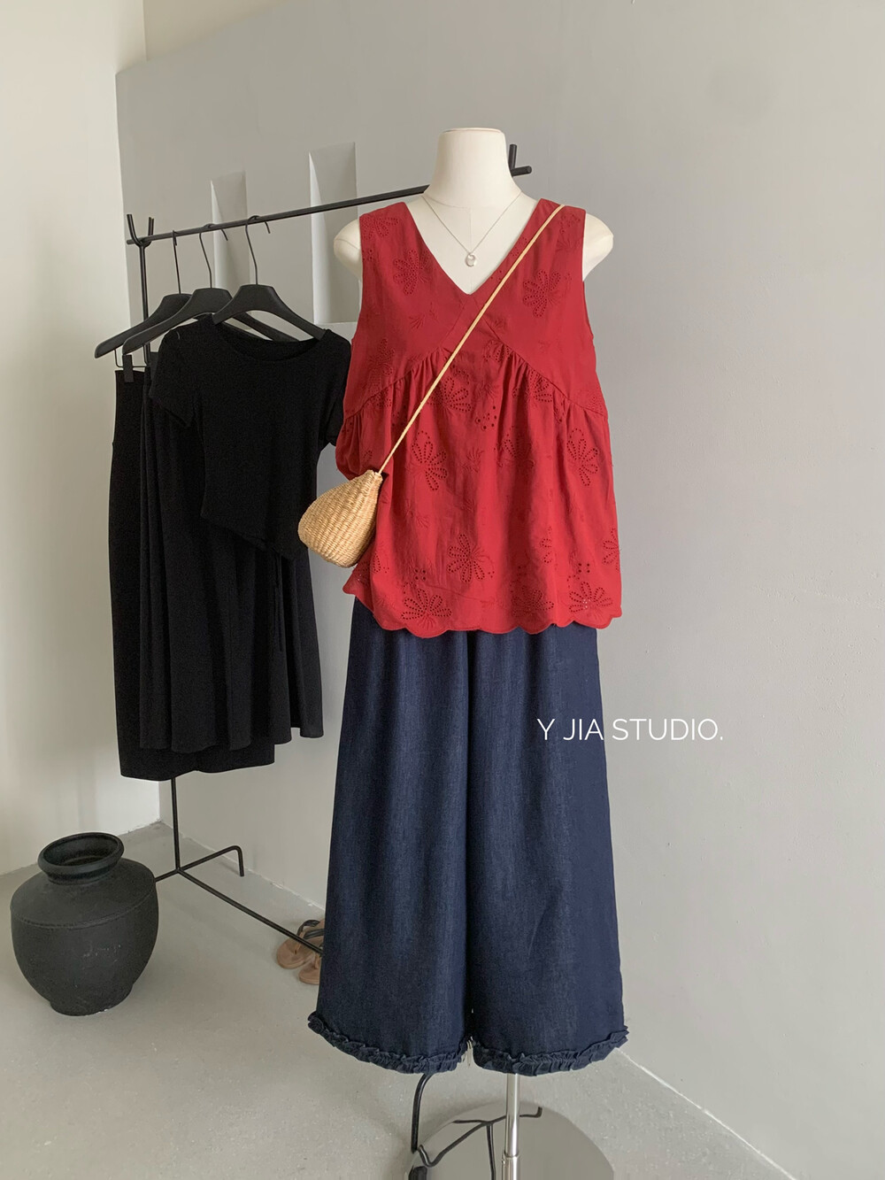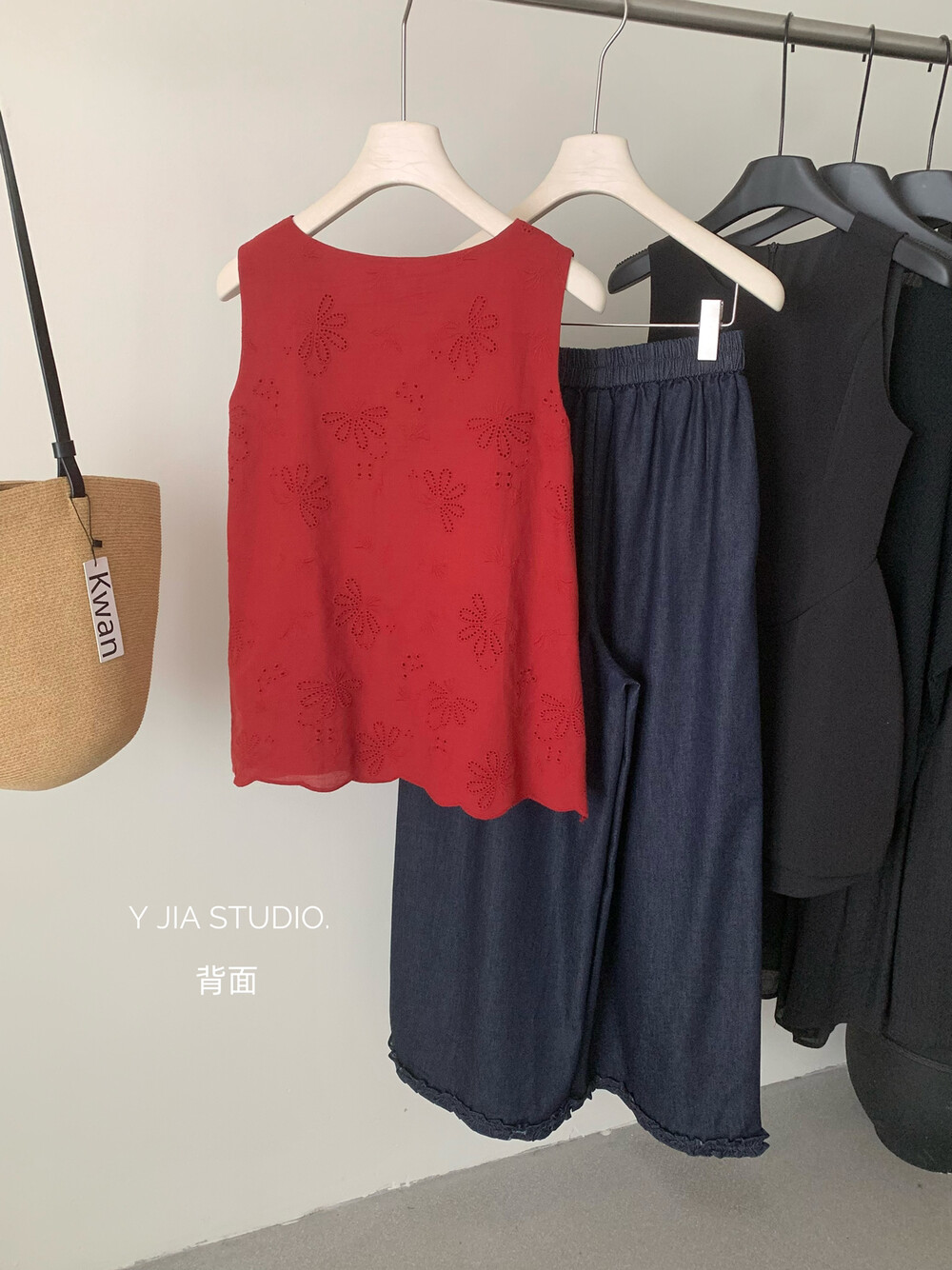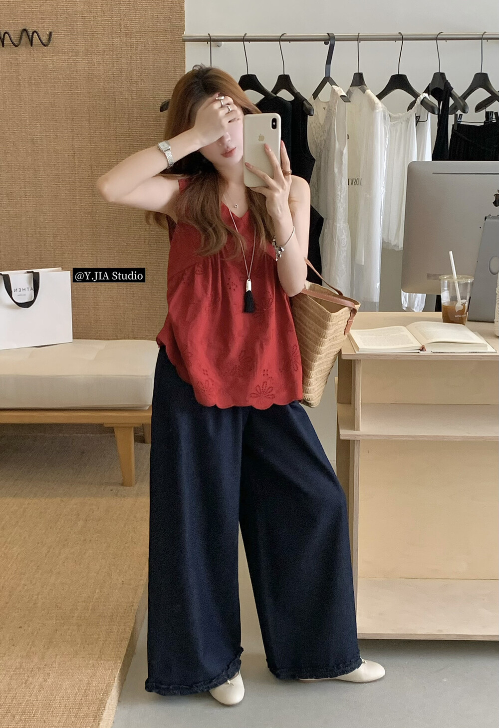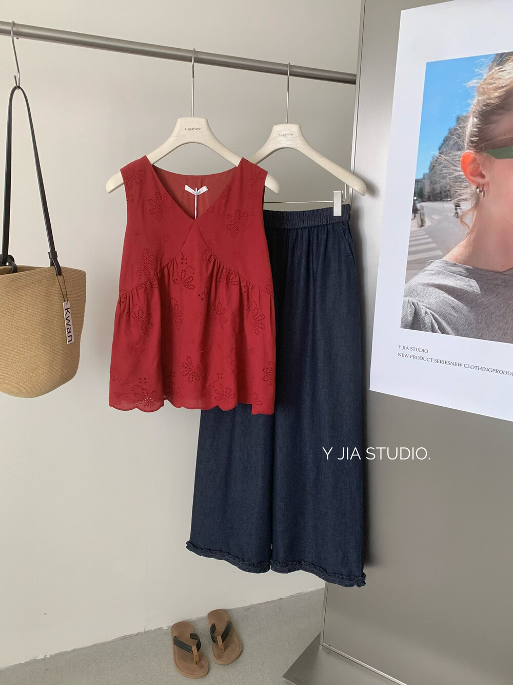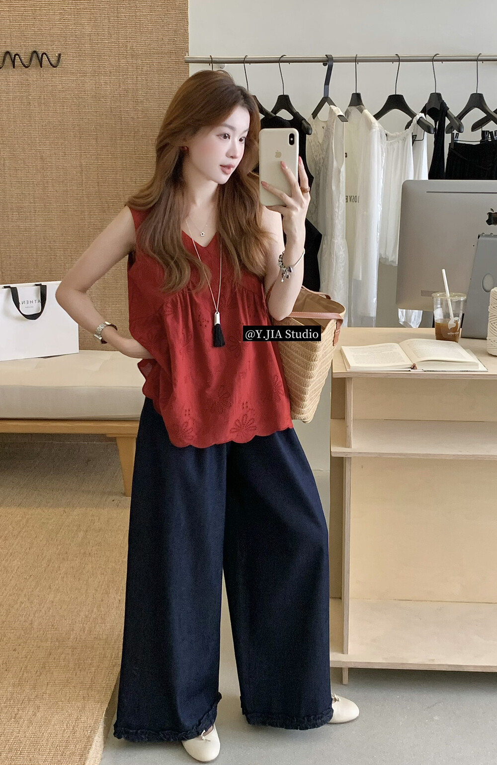 【GZ】无忧购【莉莉安】v领宽松简约显白无袖背心+休闲直筒木耳边牛仔裤套装6021(截单后7天发货)