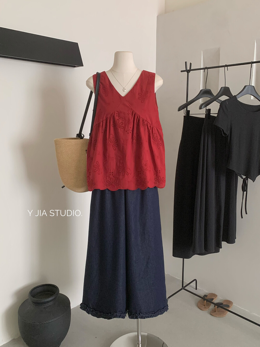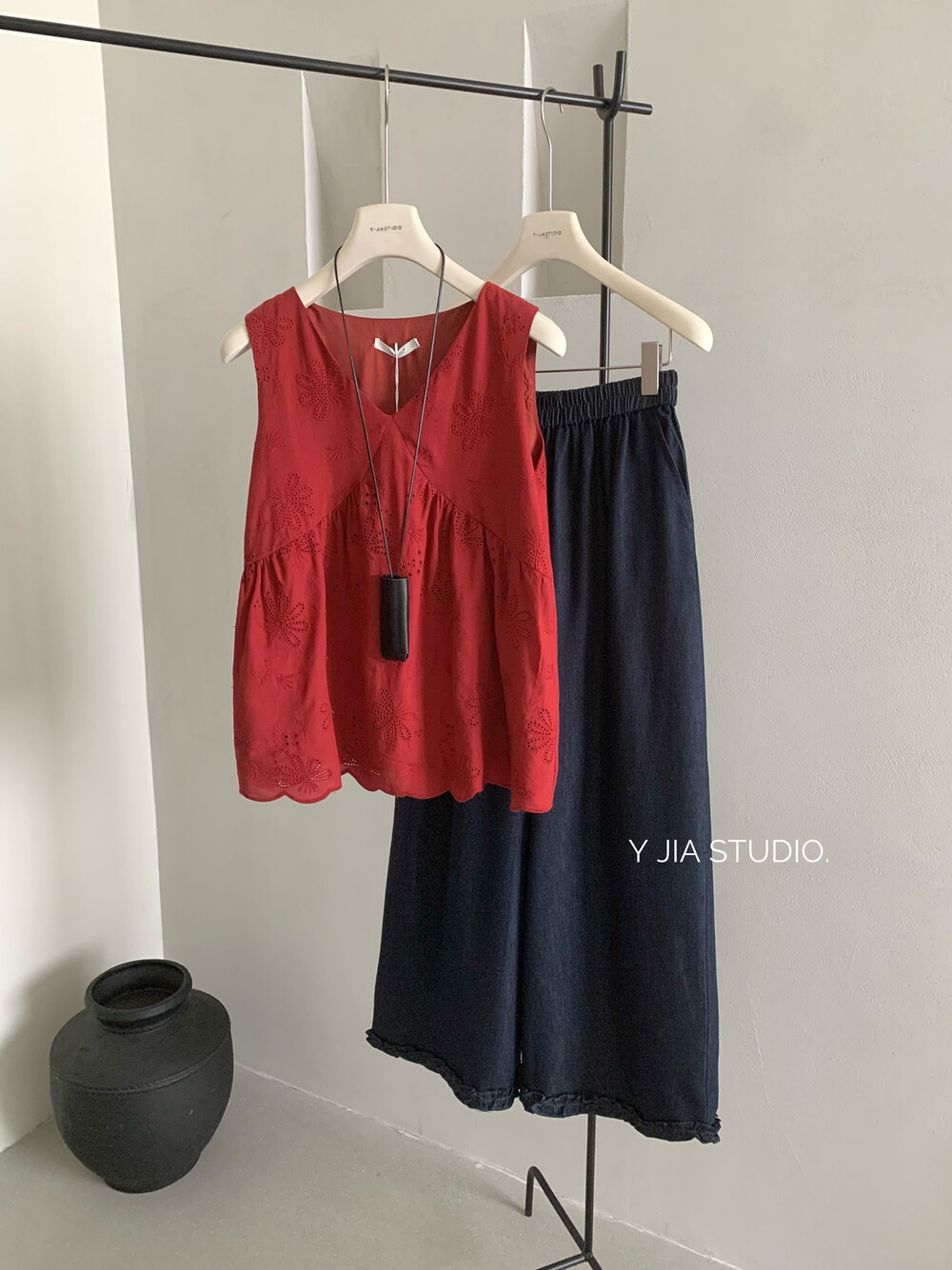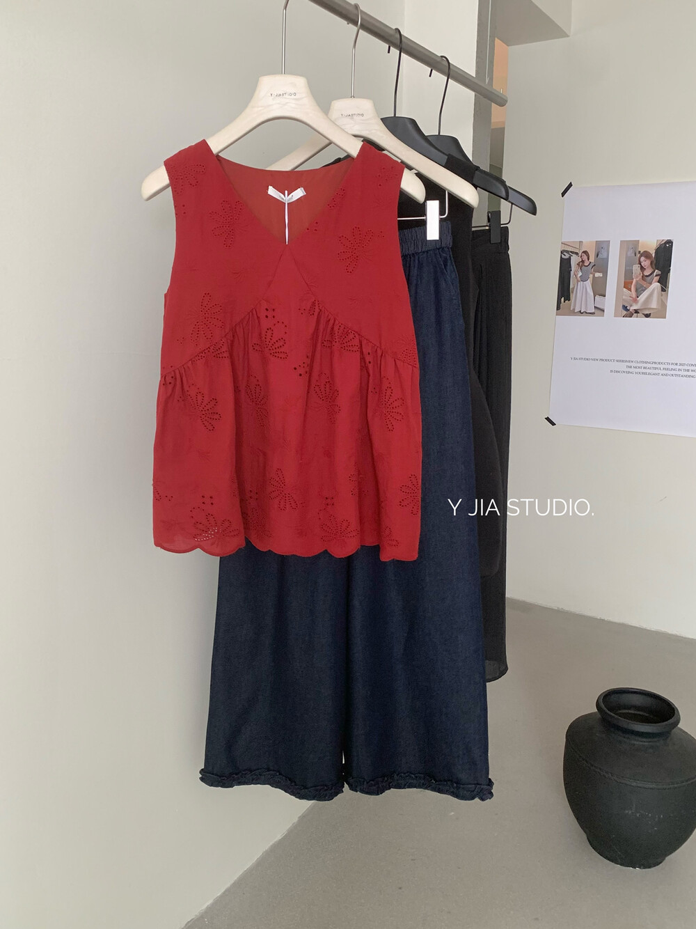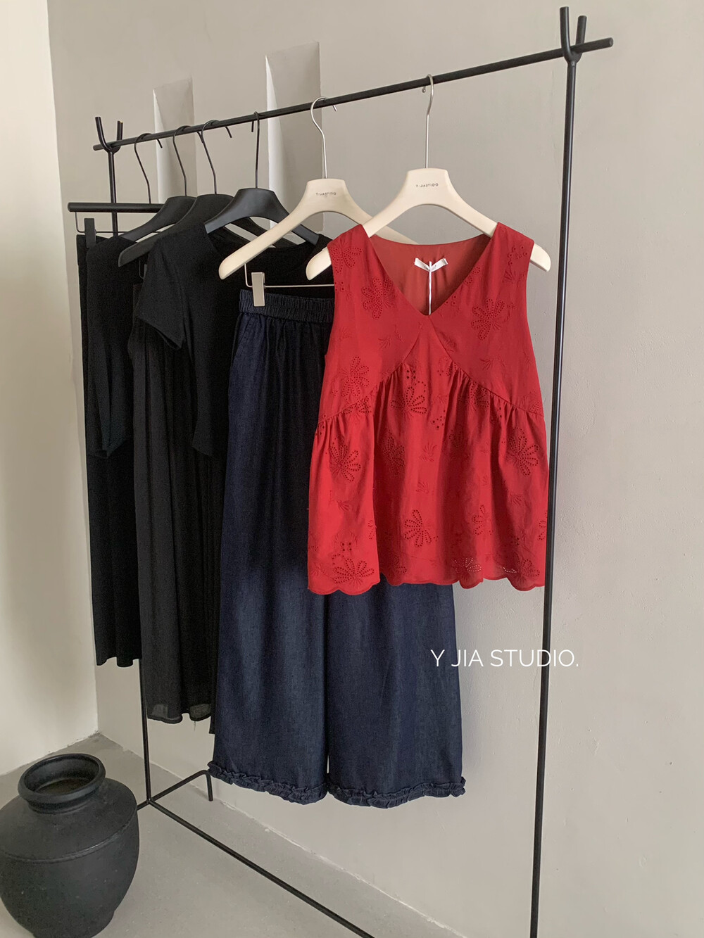 【GZ】无忧购【莉莉安】v领宽松简约显白无袖背心+休闲直筒木耳边牛仔裤套装6021(截单后7天发货)