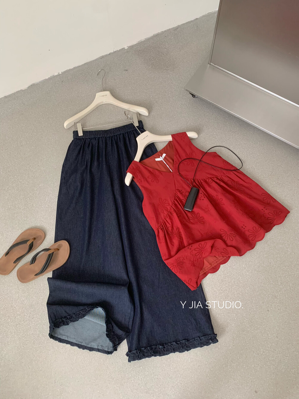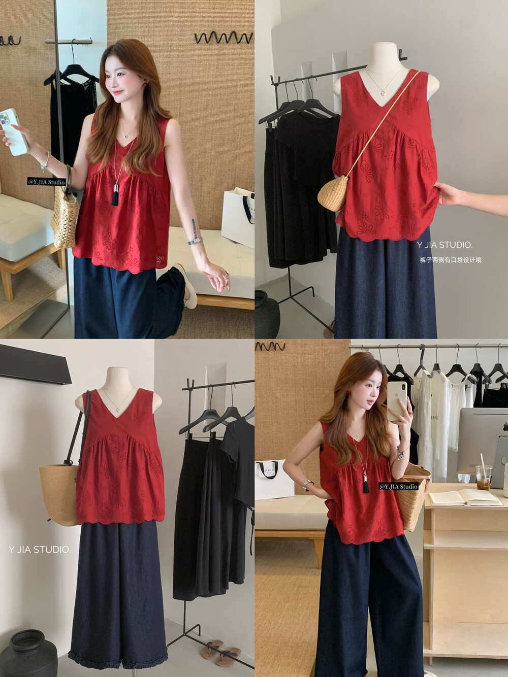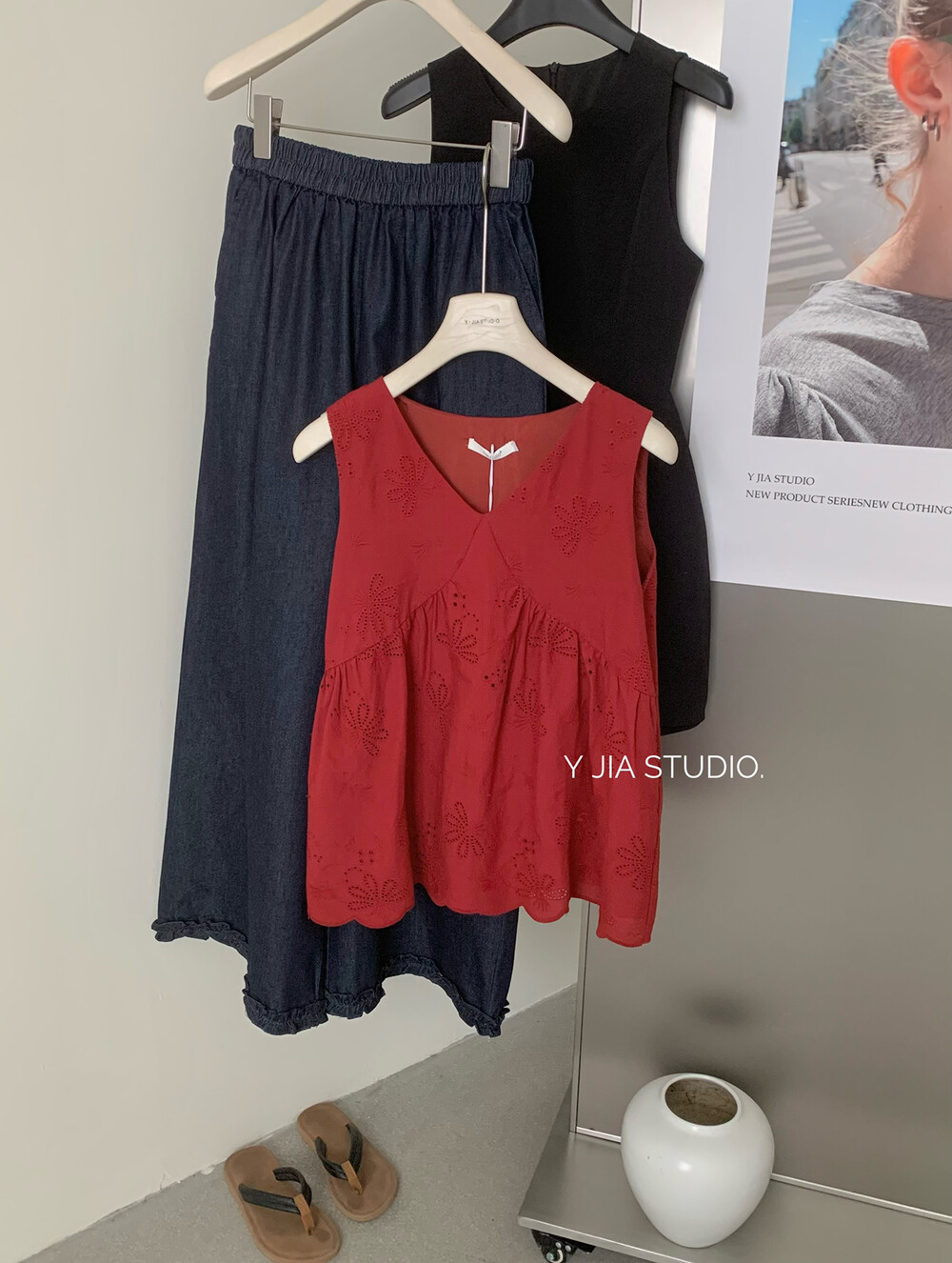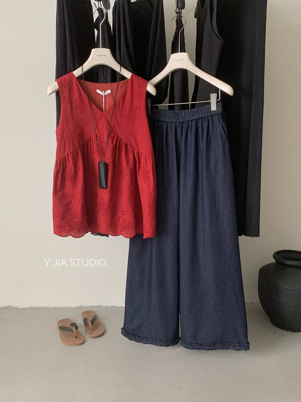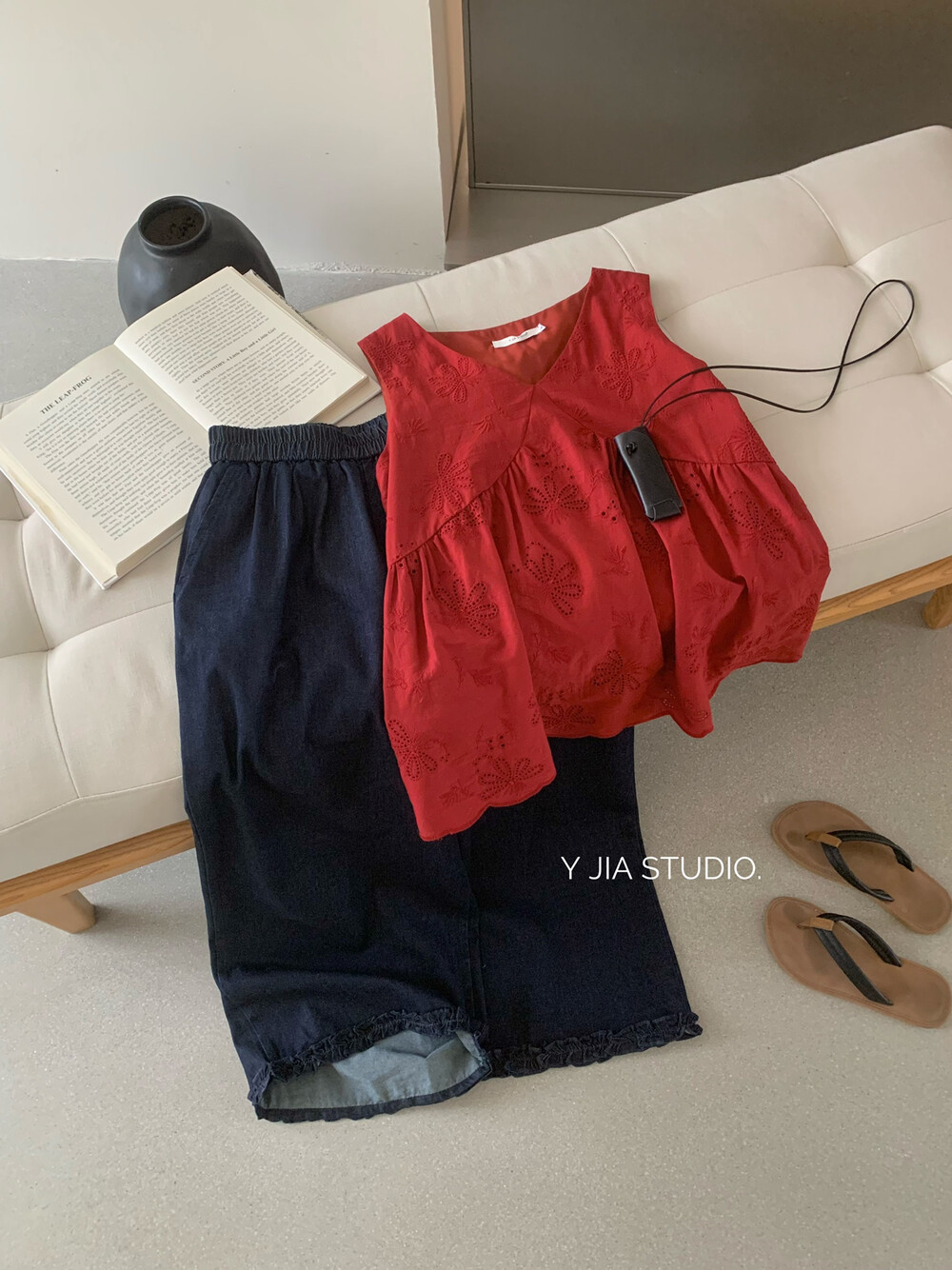 【GZ】无忧购【莉莉安】v领宽松简约显白无袖背心+休闲直筒木耳边牛仔裤套装6021(截单后7天发货)