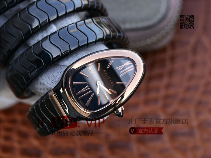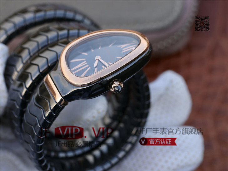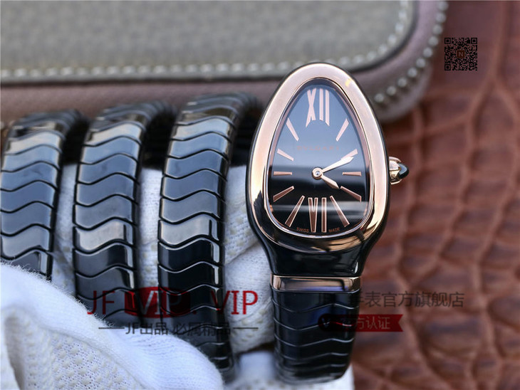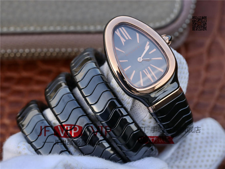 BV宝格丽SERPENTI系列白色陶瓷与黑陶瓷腕表以精美蛇形向众人展现时尚奢华之美。表圈处镶嵌切割美钻,精美奢华。腕表精致奢华,精美蛇形腕表缠绕于腕间,亮丽时尚。BV厂永远让爱美的你走时尚路线,配送专柜全套礼盒。
