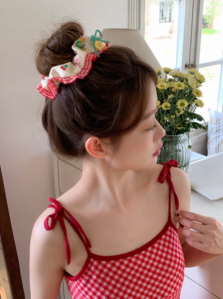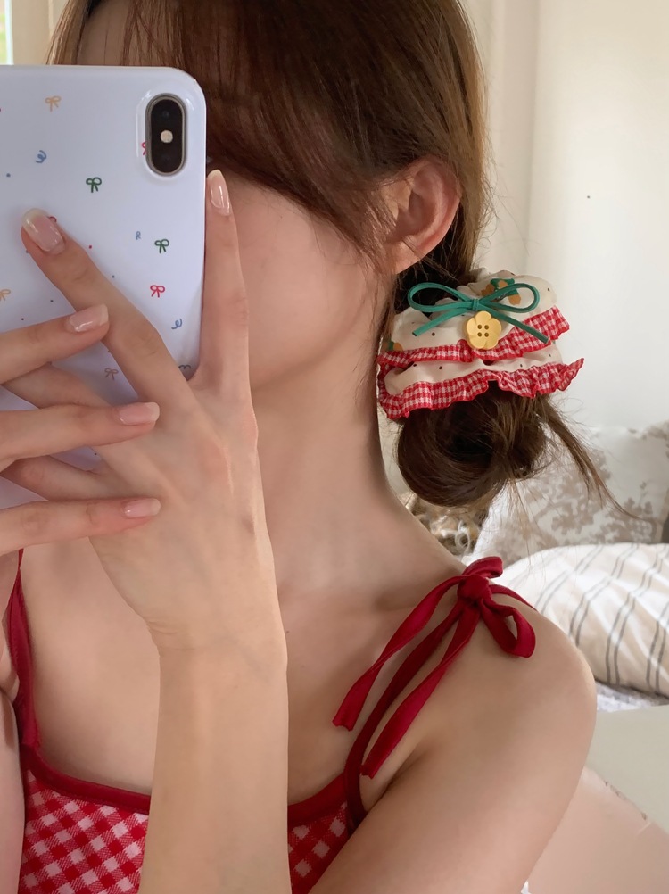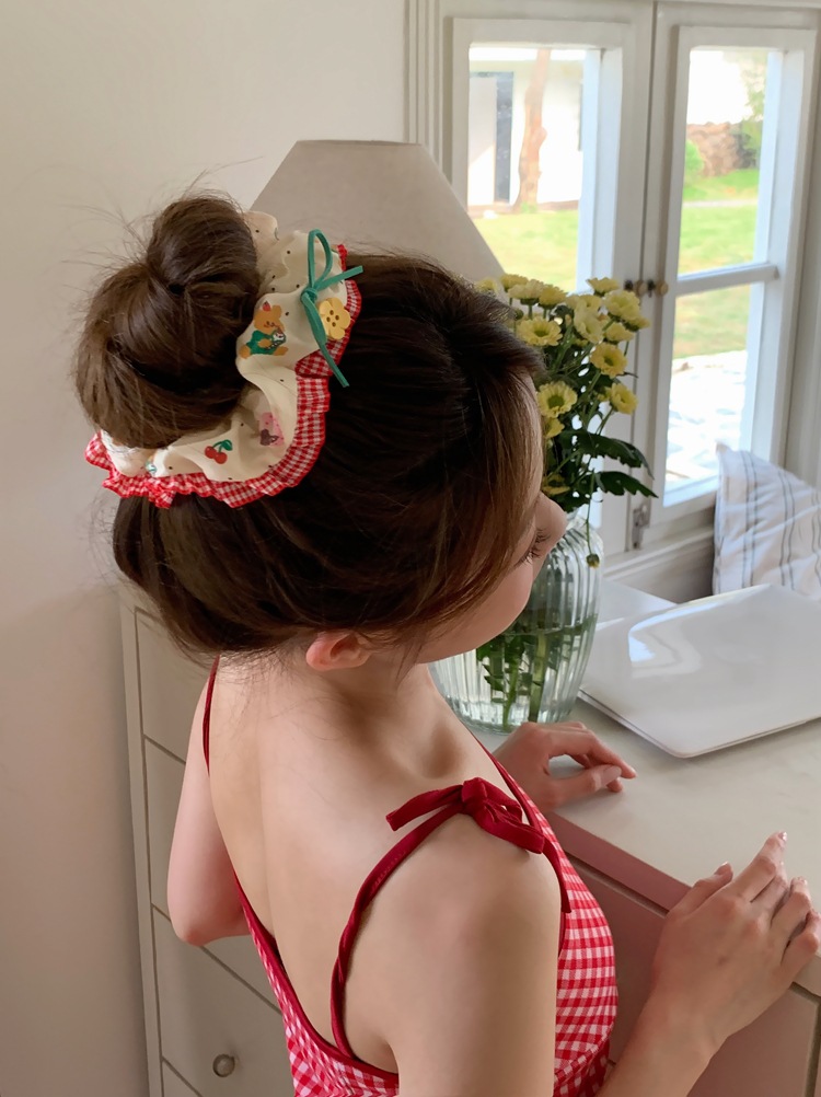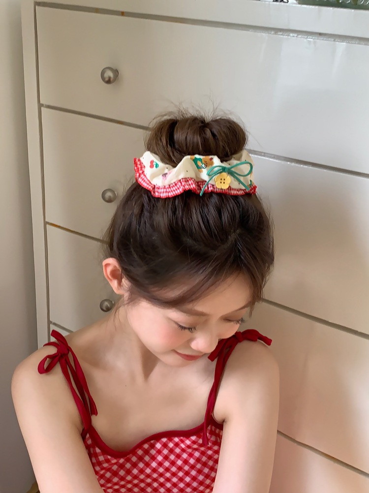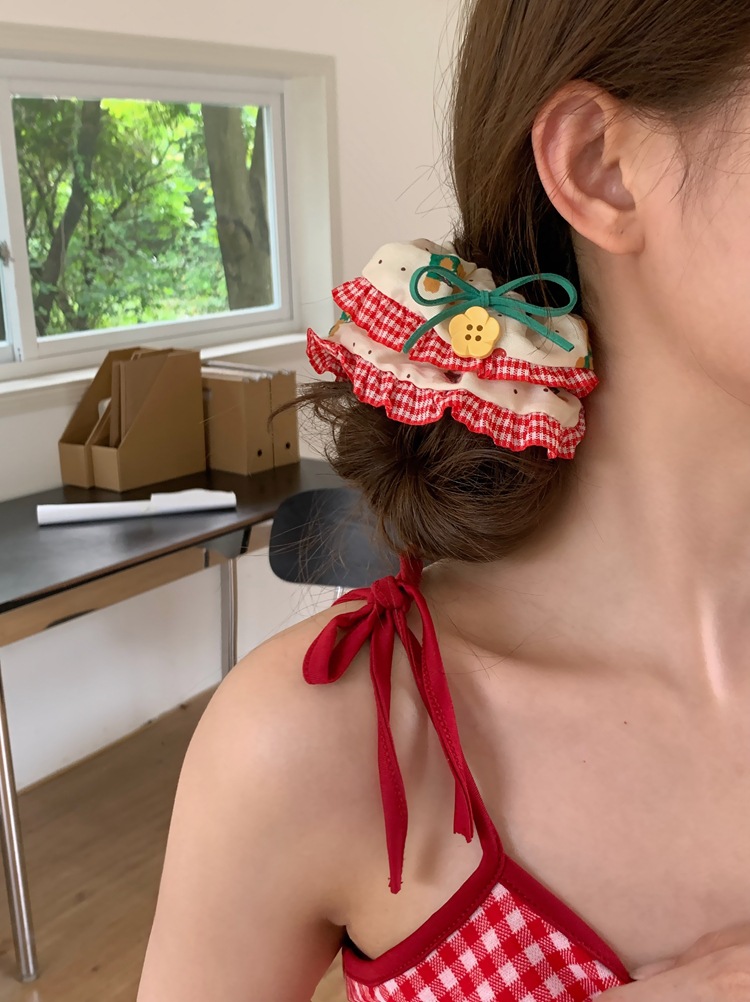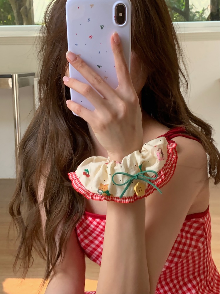 「樱桃小熊款」森系花朵纽扣蕾丝边大肠发圈 手作发饰红色发绳头饰发饰配饰