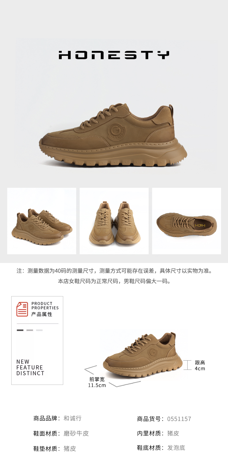 和诚行 2024秋冬新款厚底百搭增高男士真皮透气休闲运动鞋0551157
