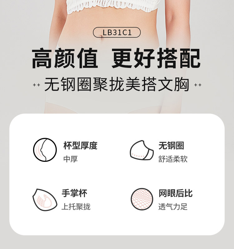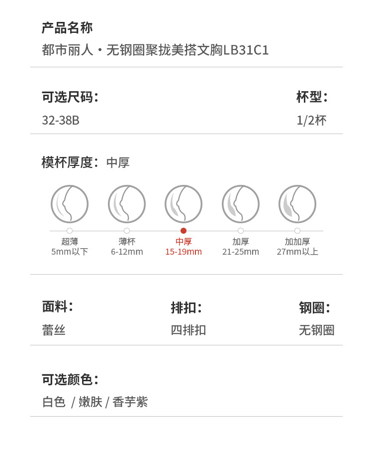 都市丽人聚拢升杯常规内衣B中厚1/2杯蕾丝文胸四排无钢圈LB31C1