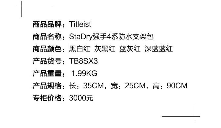 Titleist 高尔夫球包StaDry防水支架包 轻便耐用 2018新款 TB8SX3