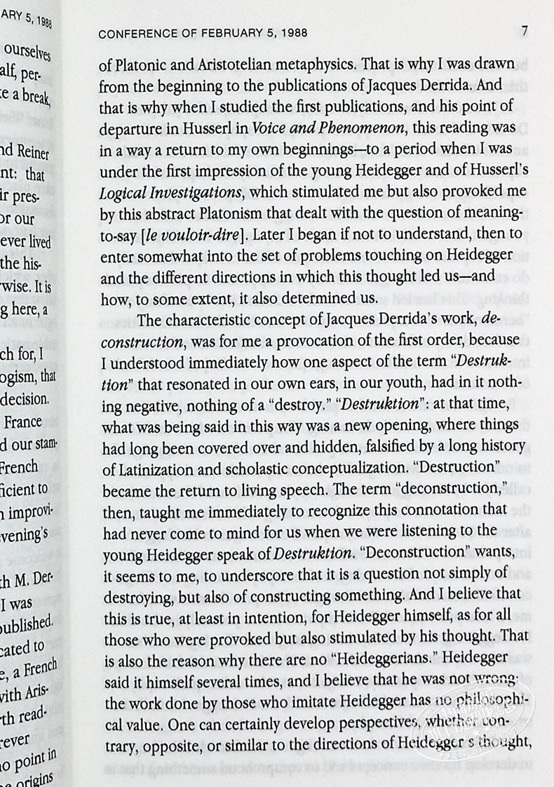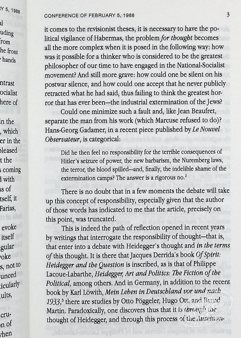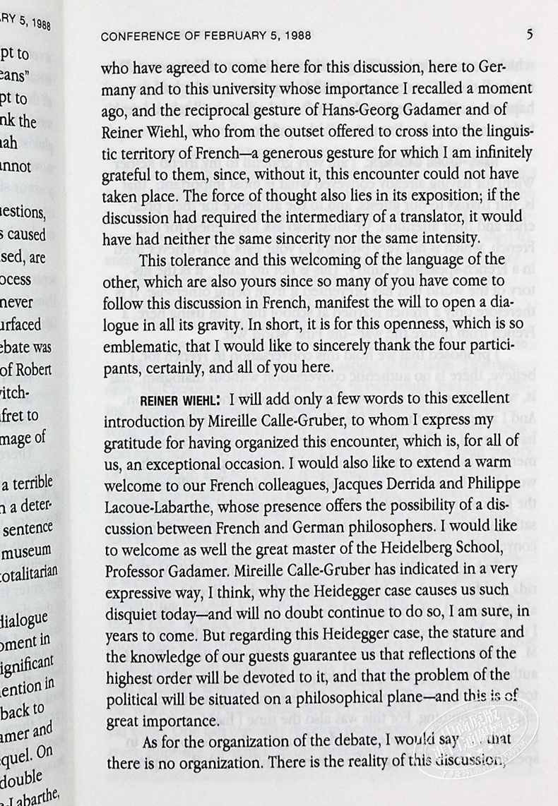 1988年2月,哲学家雅克·德里达、汉斯·格奥尔格·伽达默尔和菲利普·拉古-拉巴特齐聚海德堡,当着一大批观众的面讨论海德格尔思想的哲学和政治含义。这一事件就发生在五十多年前,海德格尔作为弗莱堡大学校长和纳粹党成员发表题为“新帝国大学”的演讲的圆形剧场里。海德格尔卷入纳粹主义一直是,并将继续是一个不可磨灭的丑闻,但它与他的工作和思想的真正关系是什么?那些阅读这本书,分析和阐述这一思想的人,他们的责任是什么?反过来说,对这位二十世纪重要但妥协的哲学家的全盘否定又有什么利害关系呢?1988年,随着维克多·法里亚斯的《海德格尔与纳粹主义》的出版,以及随之而来的激烈辩论,这些问题变得比以往任何时候都更加紧迫。由三个著名的海德格尔读者提出的反思,用法语即兴创作,并在此抄录,是试图在广大公众面前解决这些问题,但要有深度的知识和对问题的复杂认识,这些问题是新闻界经常缺乏的。