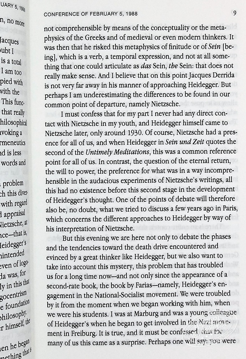 In February 1988, philosophers Jacques Derrida, Hans-Georg Gadamer, and Philippe Lacoue-Labarthe came together in Heidelberg before a large audience to discuss the philosophical and political implications of Martin Heidegger's thought. This event took place in the very amphitheater in which, more than fifty years earlier, Heidegger, as rector of the University of Freiburg and a member of the Nazi Party, had given a speech entitled "The University in the New Reich." Heidegger's involvement in Nazism has always been, and will remain, an indelible scandal, but what is its real relation to his work and thought? And what are the responsibilities of those who read this work, who analyze and elaborate this thought? Conversely, what is at stake in the wholesale dismissal of this important but compromised twentieth-century philosopher?In 1988, in the wake of the recent publication of Victor Farias's Heidegger and Nazism, and of the heated debates that ensued, these questions had become more pressing than ever. The reflections presented by three of the most prominent of Heidegger's readers, improvised in French and transcribed here, were an attempt to approach these questions before a broad public, but with a depth of knowledge and a complex sense of the questions at issue that have been often lacking in the press.
