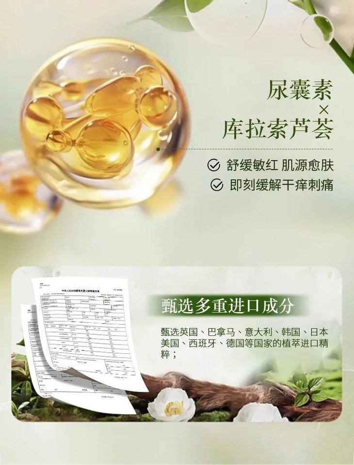 其中包含了丁二醇、甘油、库拉索芦荟 马齿苋提取物、尿囊素、金黄洋甘菊提取物 香叶天竺葵花/叶/茎提取物、β-葡聚糖 田野薄荷叶提取物、透明质酸钠、苦参根提取物 等十几样保湿舒缓植物成分。 主打一个强力舒缓+高效保湿 让肌肤瞬间喝饱了水,丝毫不紧绷~