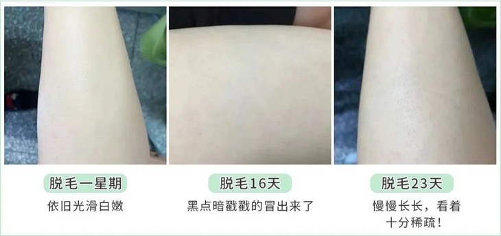 用了这款后,长得很慢 且毛毛都变柔顺了很多。 为了测试效果我把不同时间段毛发生长记了下来: ✅脱毛一星期依旧光滑白嫩 ✅脱毛16天,黑点暗戳戳的冒出来了 ✅脱毛23天慢慢长长,看着十分稀疏!