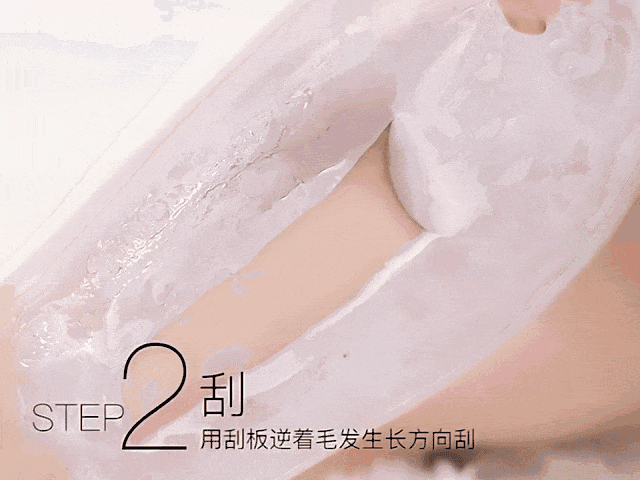 使用方法超简单! 先用热毛巾软化毛质,懒的人将脱毛膏 直接涂抹于需要脱毛的肌肤上: 在肌肤上停留5至8分钟之后 用面巾纸将脱毛膏及毛发拭去即可 你看,轻轻一刮就完事了,比喝水还简单!