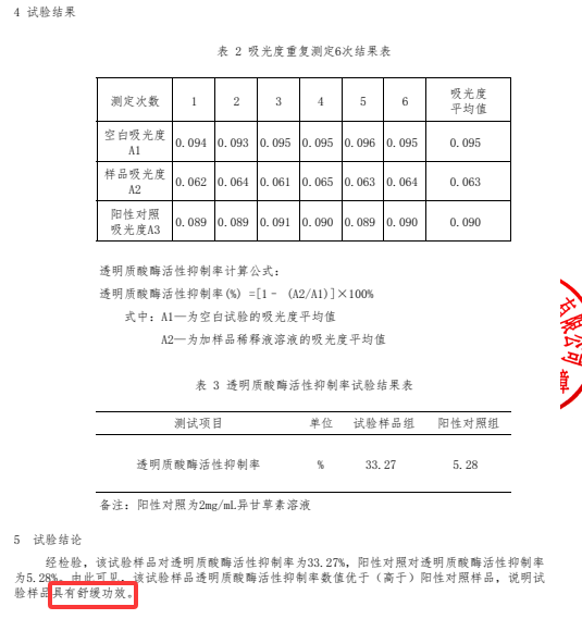 有舒缓效果也不是说说而已 咱们看quan威的质检报告即可知晓: 试验样品具有舒缓功效