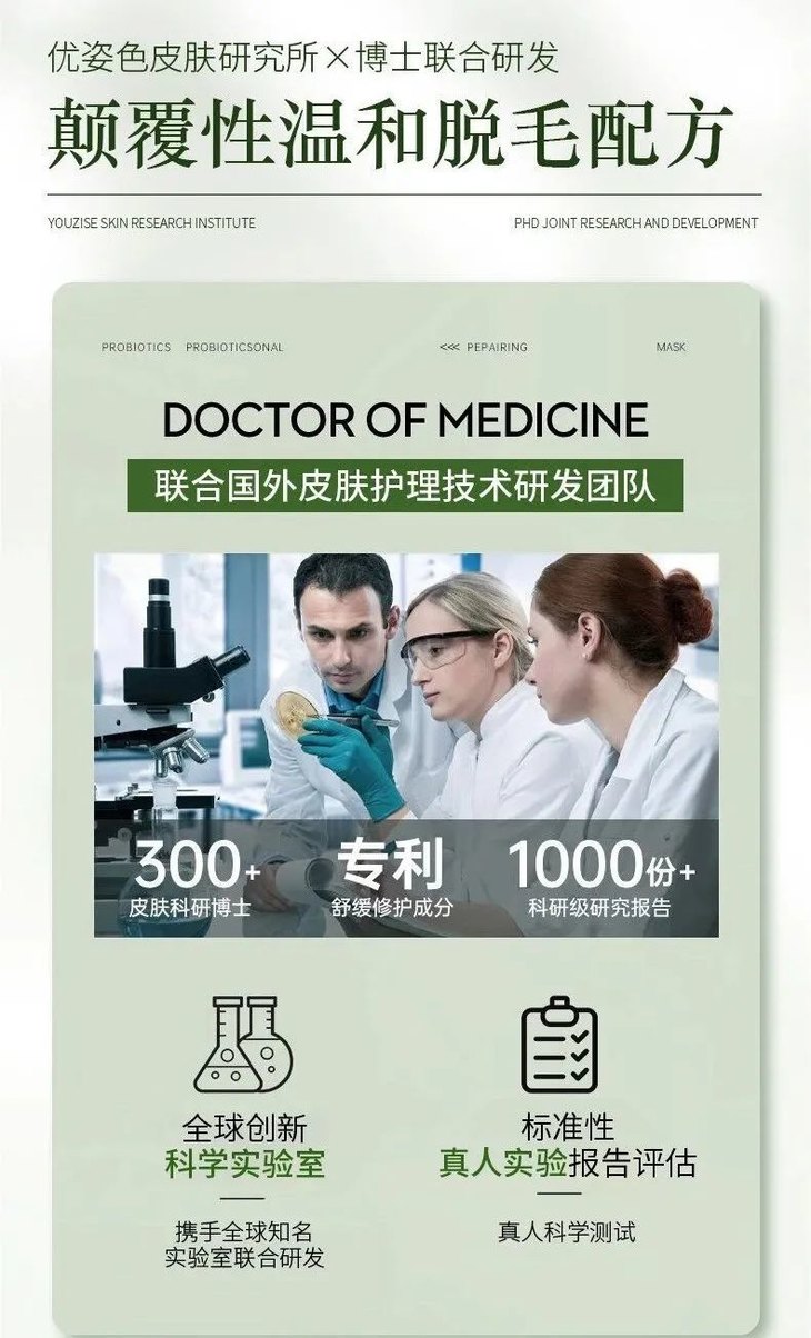 真的神了啊!了解下来才知道 【YOUZISE优姿色】原来是一个国货品牌。 优姿色皮肤联合国外皮肤护理技术研发团队 众多皮肤博士共同研发了颠覆性的温和脱毛配方