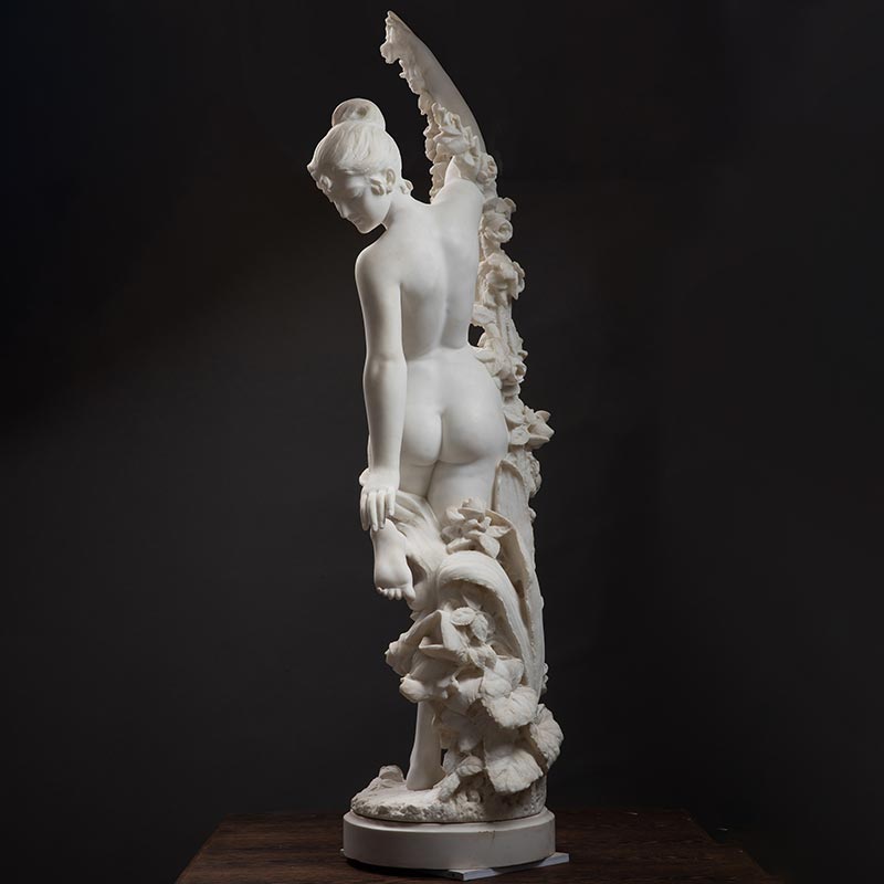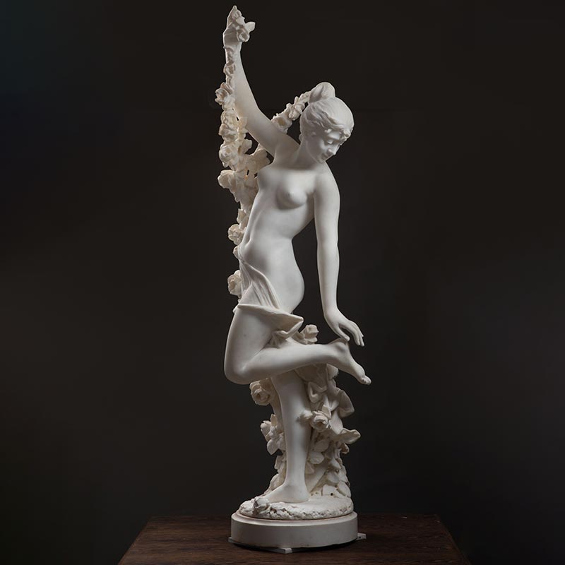 1880年代意大利雕塑家Cesare Lapini签名出品卡拉拉大理石雕塑《手持花环的少女》