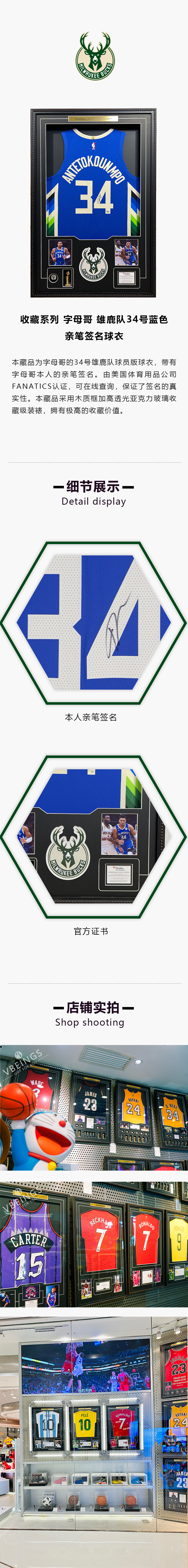收藏系列 字母哥 雄鹿队34号蓝色 亲笔签名球衣