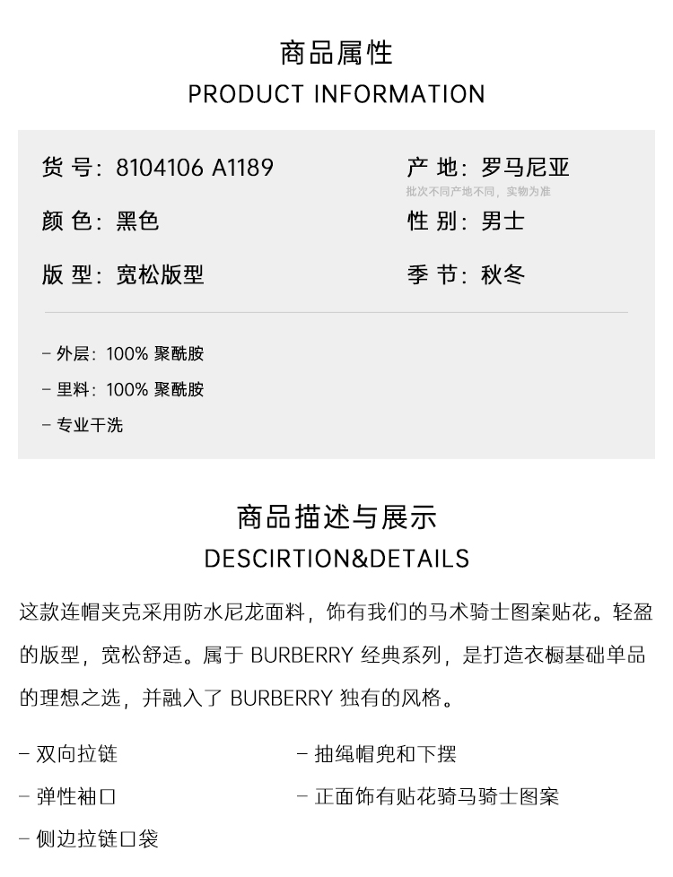 【一】BURBERRY 巴宝莉 男士马术骑士徽标连帽外套 黑色 8104106 A1189
