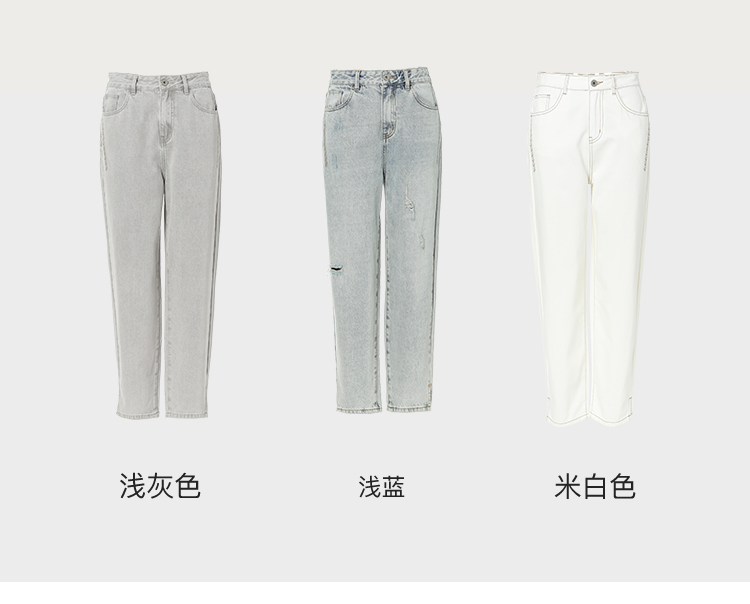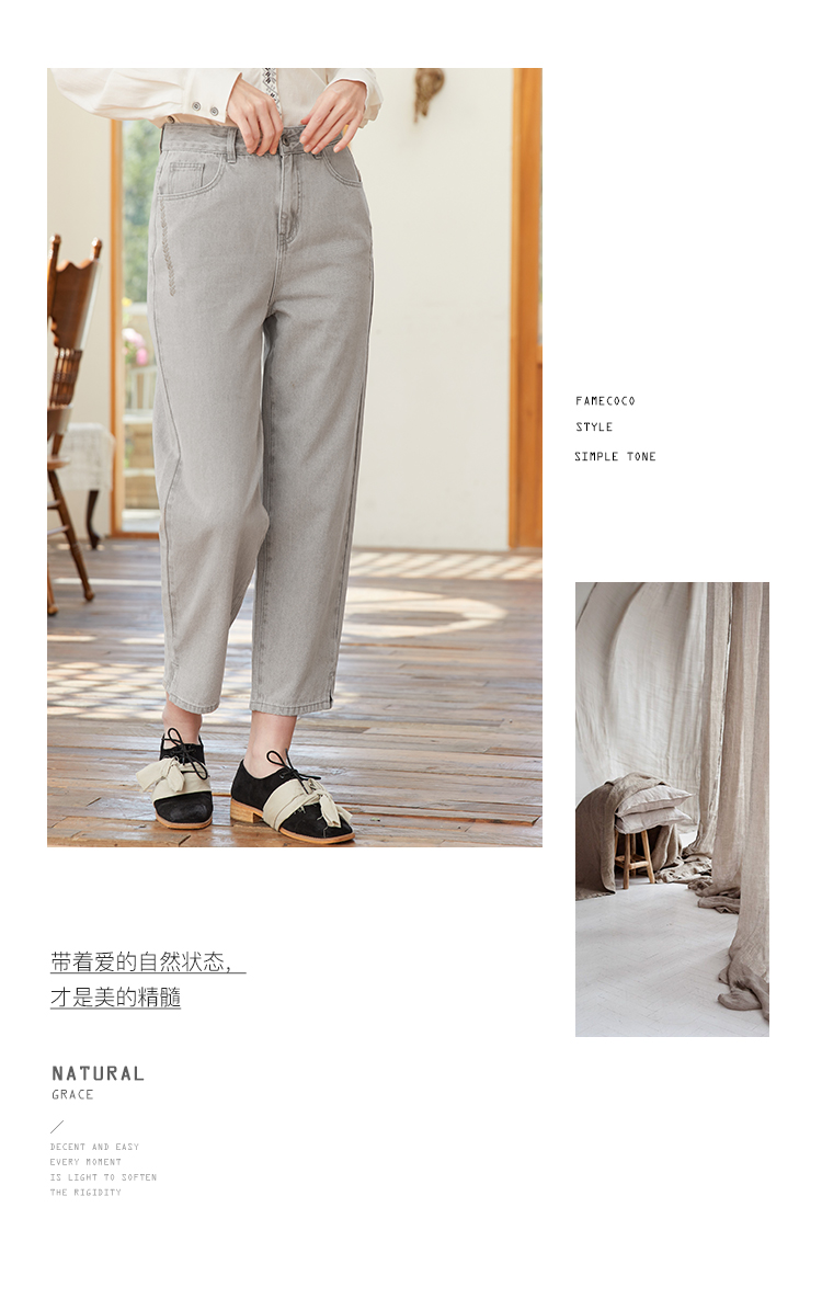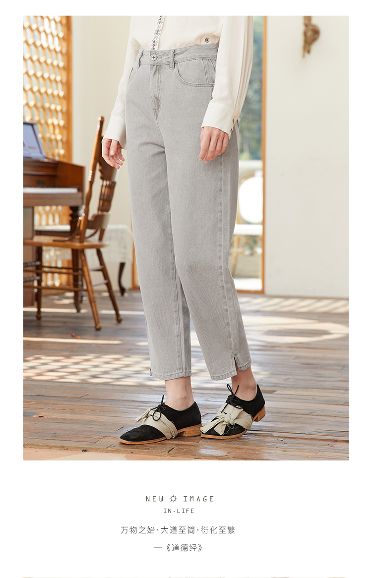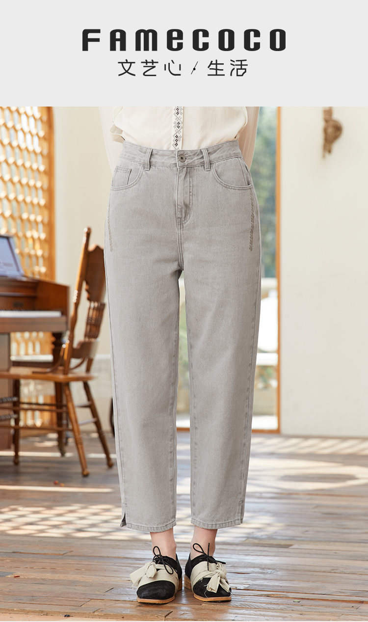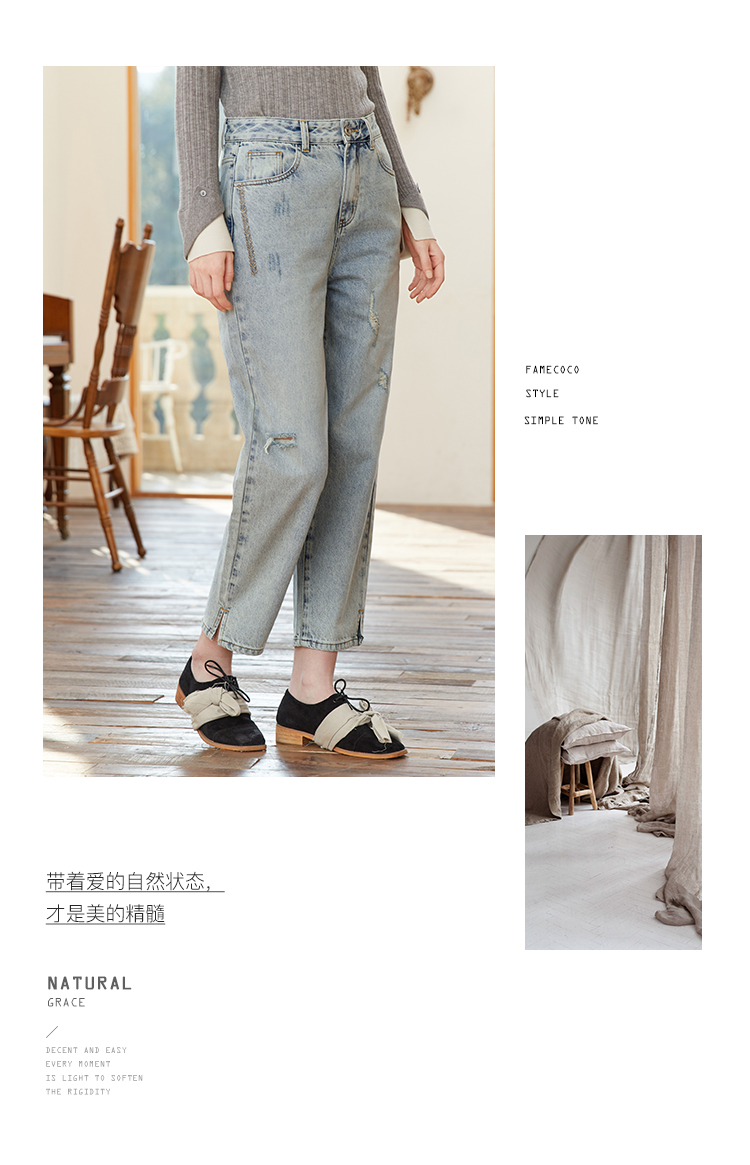 famecoco范可儿裤脚开叉牛仔裤女浅色春季百搭宽松直筒裤FAB1GA009