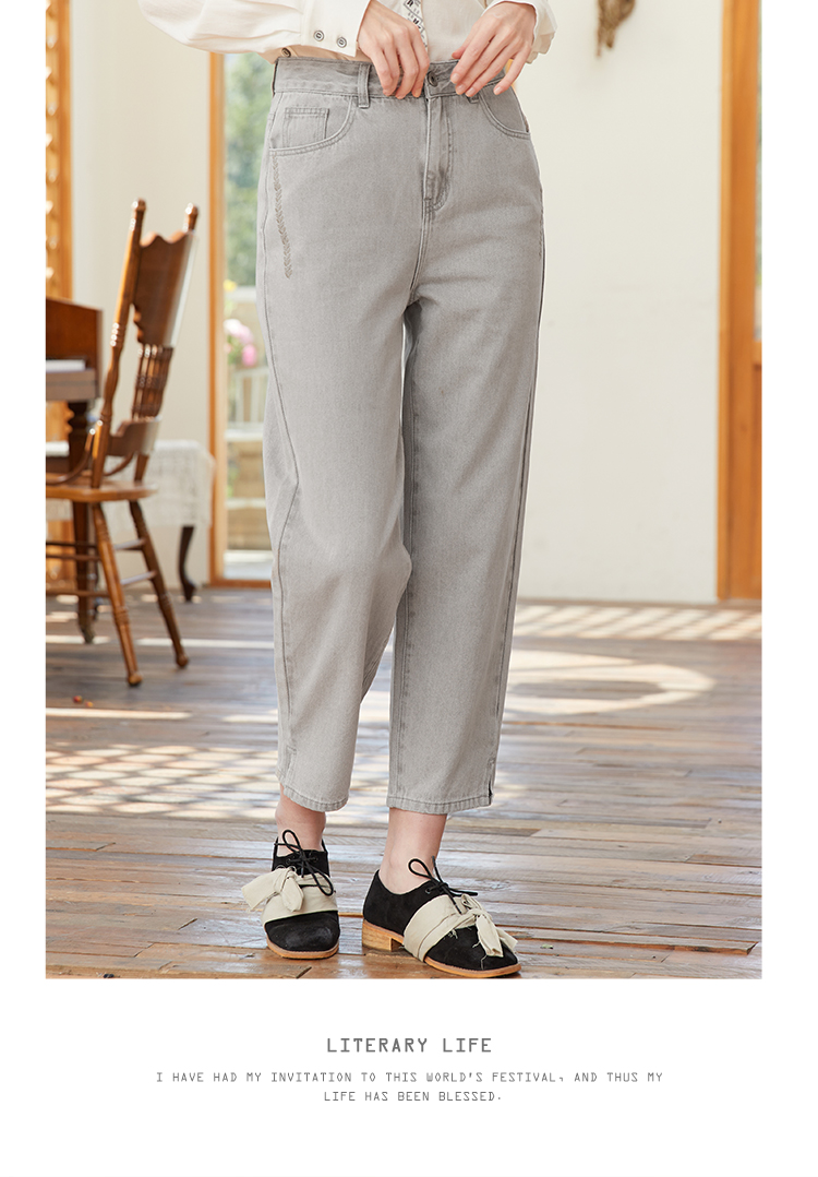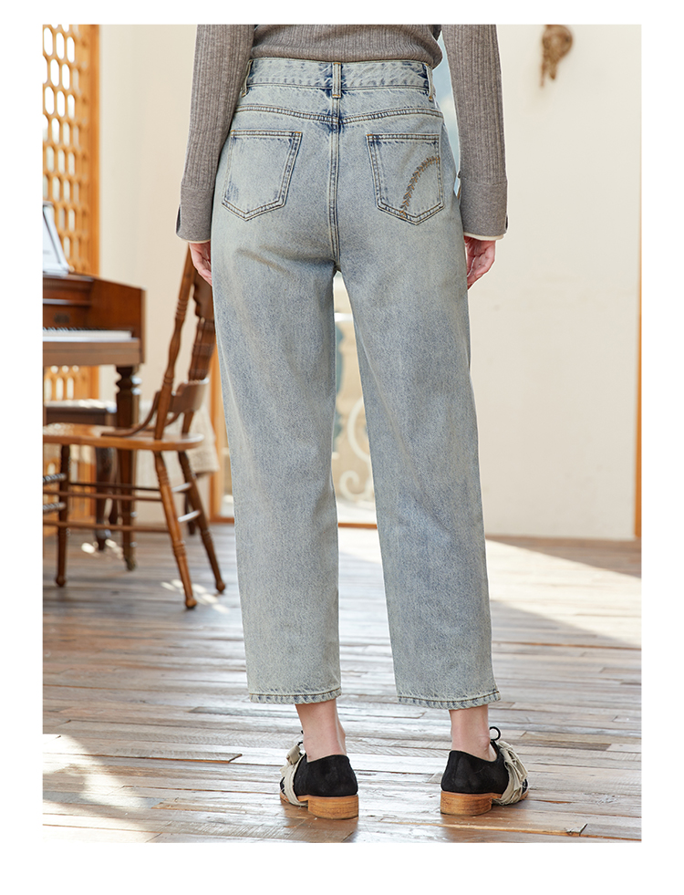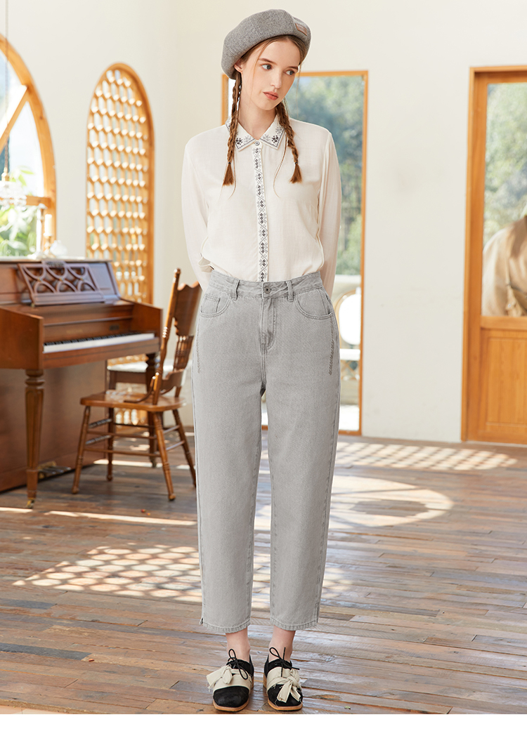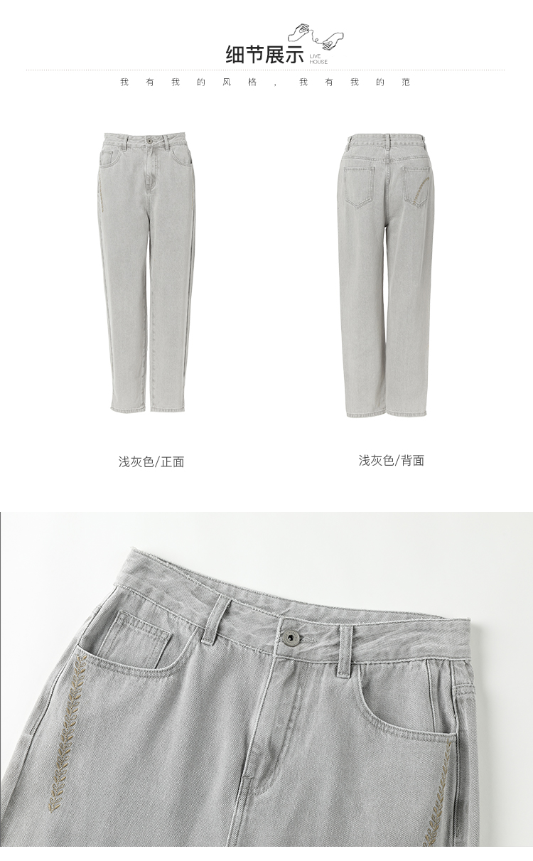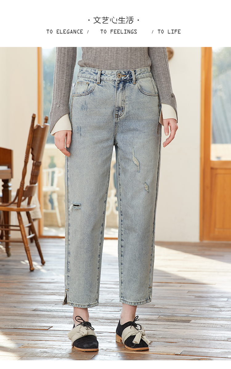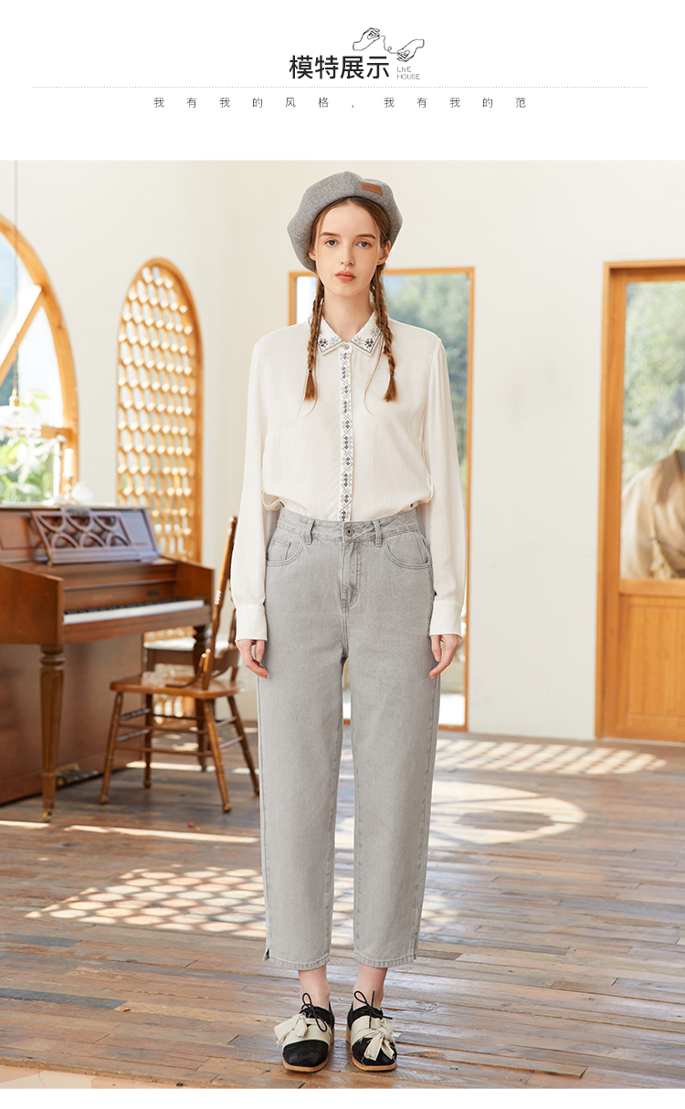 famecoco范可儿裤脚开叉牛仔裤女浅色春季百搭宽松直筒裤FAB1GA009