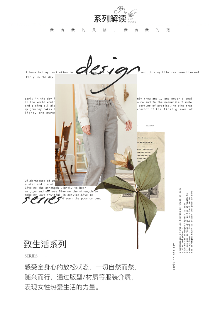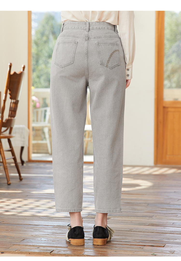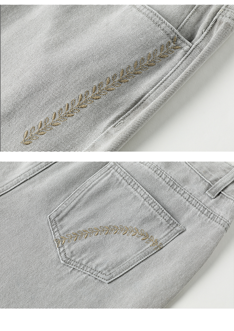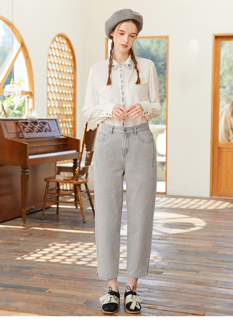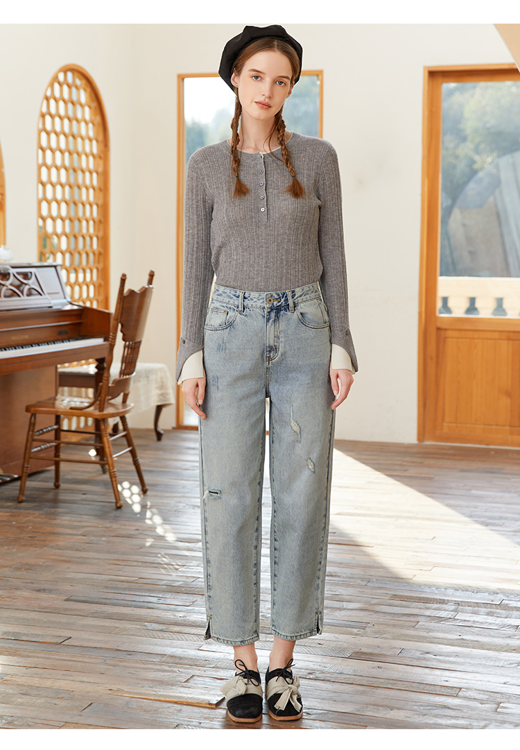famecoco范可儿裤脚开叉牛仔裤女浅色春季百搭宽松直筒裤FAB1GA009