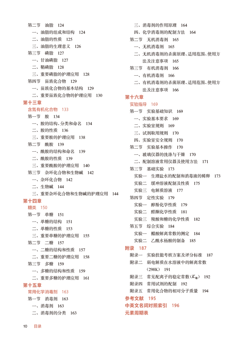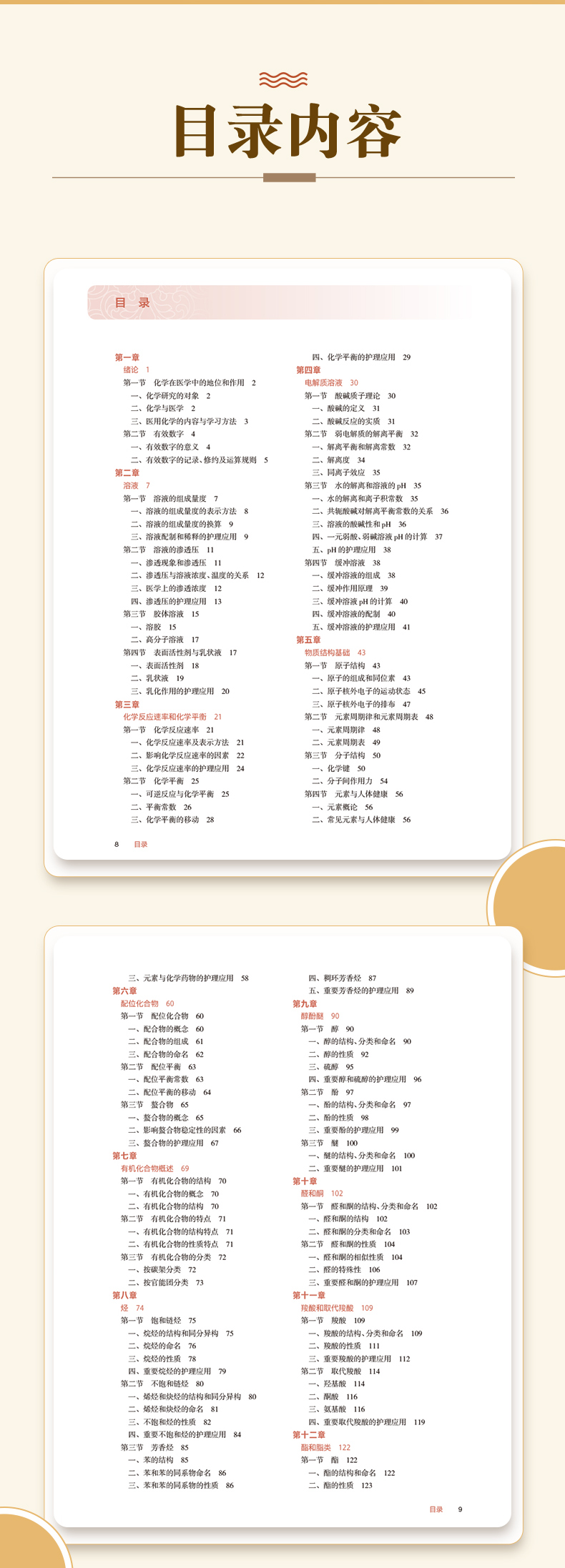 此为国家卫生健康委员会“十四五”高等职业教育专科护理类专业规划教材之一。选择了护理专业必需的化学基本原理、基础知识和基本技能。包含四个方面:无机化学(**章至第六章)、有机化学(第七章至第十四章)、常用化学消毒剂(第十五章)、实验指导(第十六章);无机部分包括了溶液、电解质溶液、化学反应速率和化学平衡、物质结构基础、配位化合物;有机部分包括了烃、醇酚醚、醛酮、羧酸和取代羧酸、脂类、含氮有机化合物、糖类;化学消毒剂主要包括无机消毒剂和有机消毒剂;实验指导依据护理岗位需求,精选了溶液的配制等10个实验,包括基础知识、基本操作、定性实验、综合性实验4部分。