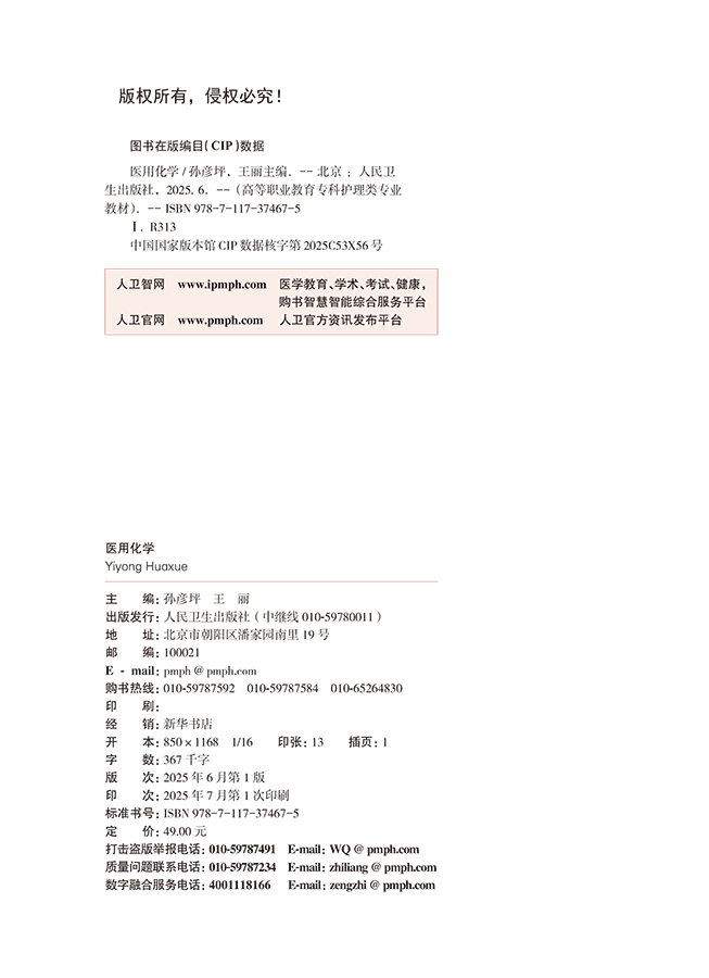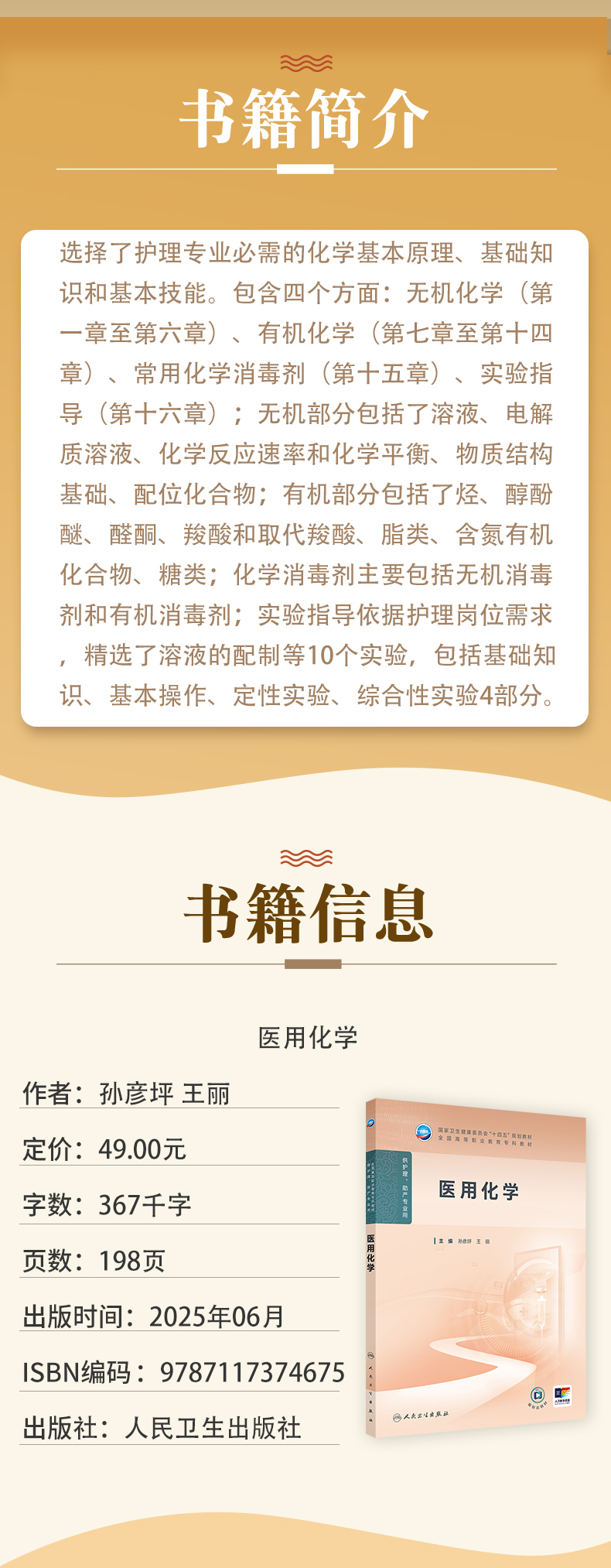 医用化学 十四五规划教材 全国高等职业教育专科教材 孙彦坪 王丽 主编 高职高专 护理 供护理 助产专业用 人民卫生出版社