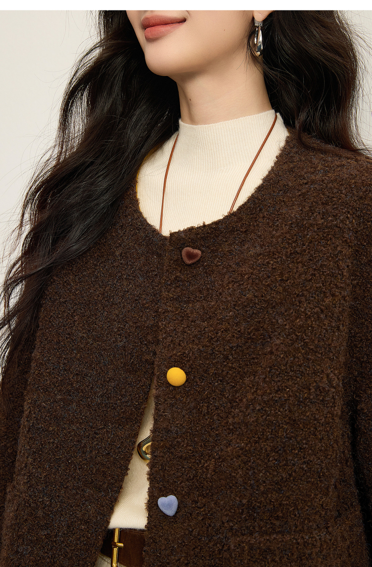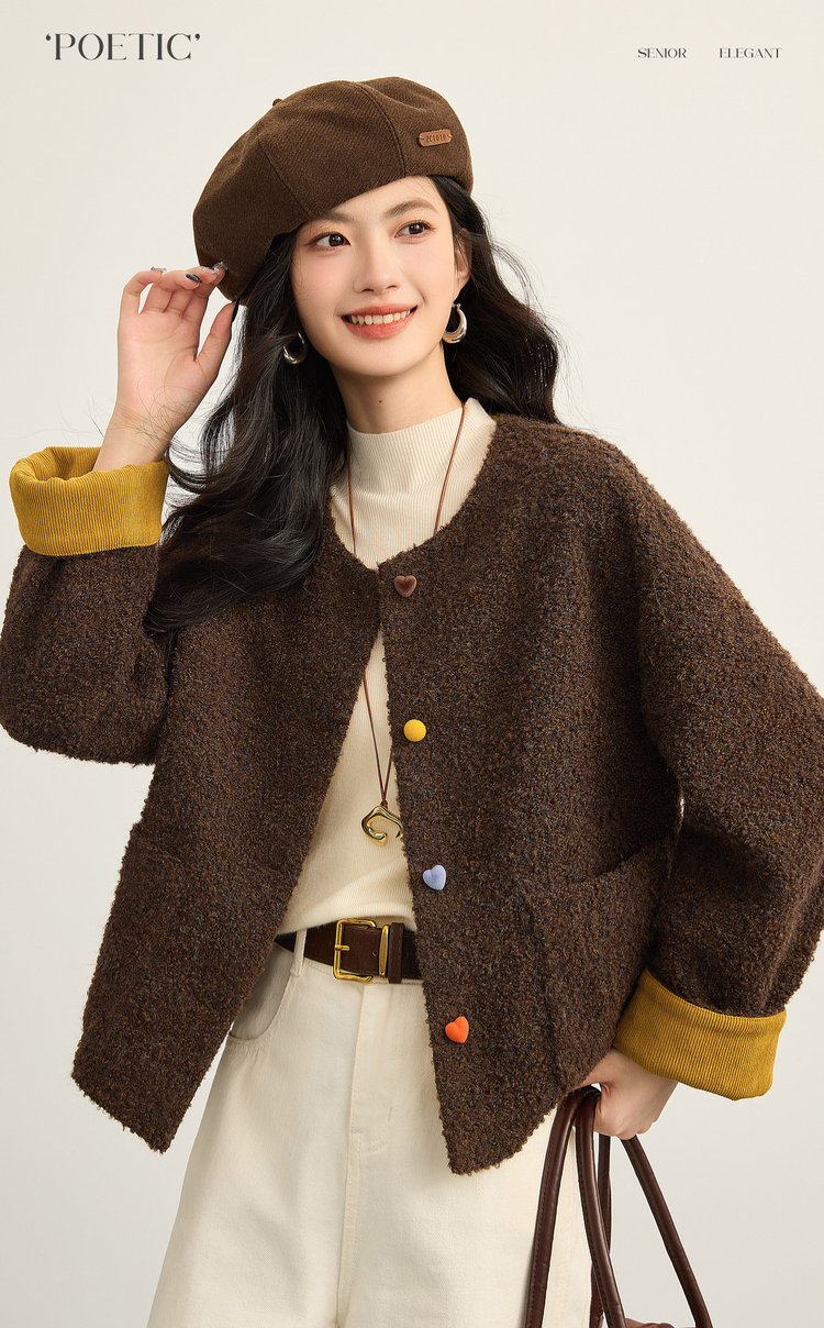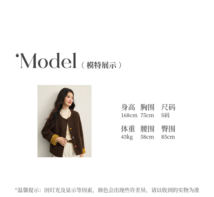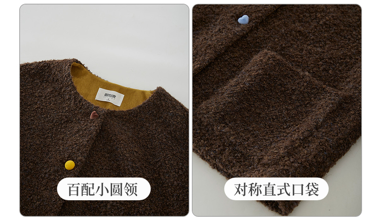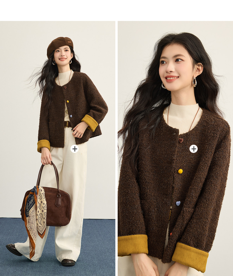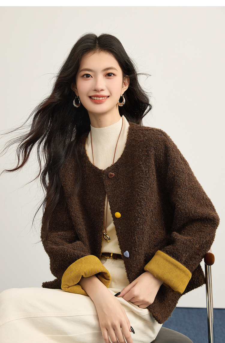 【12/17新品】熙世界韩系小香风羊毛短外套女2025冬季新款气质圆领毛绒开衫上衣