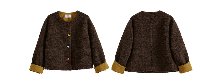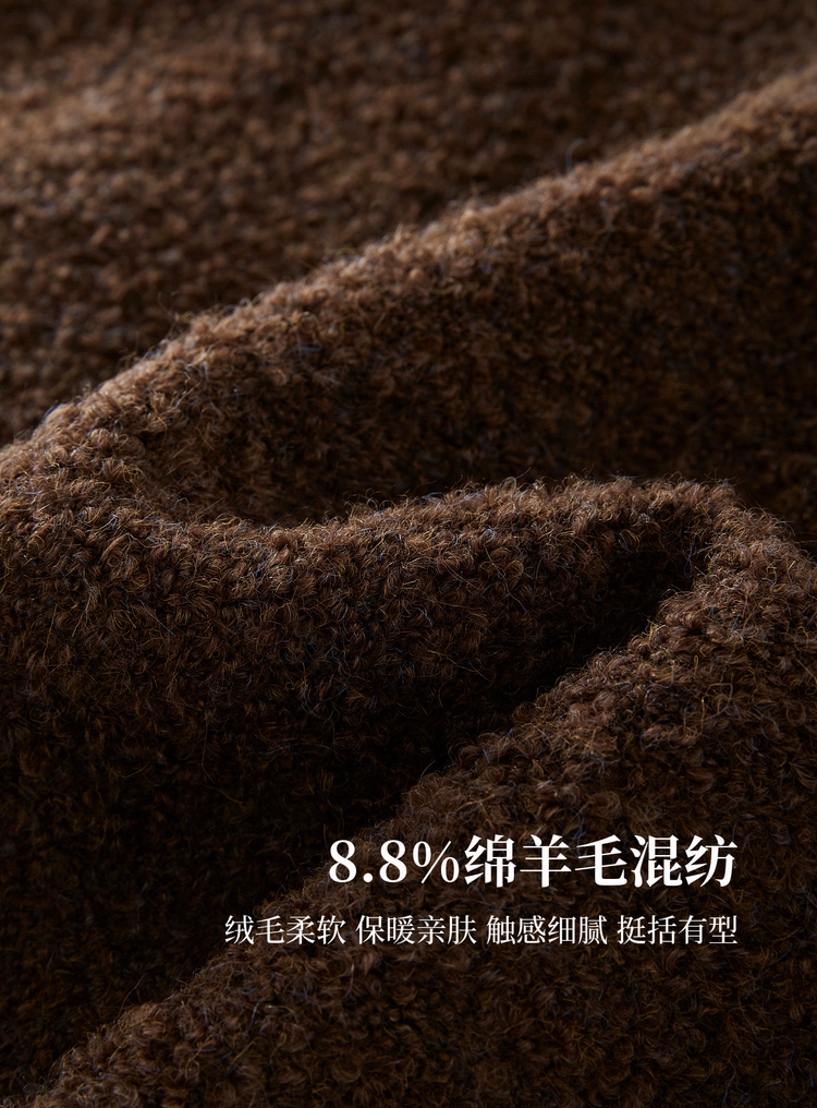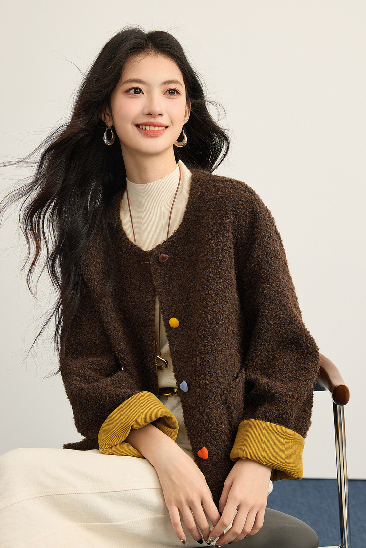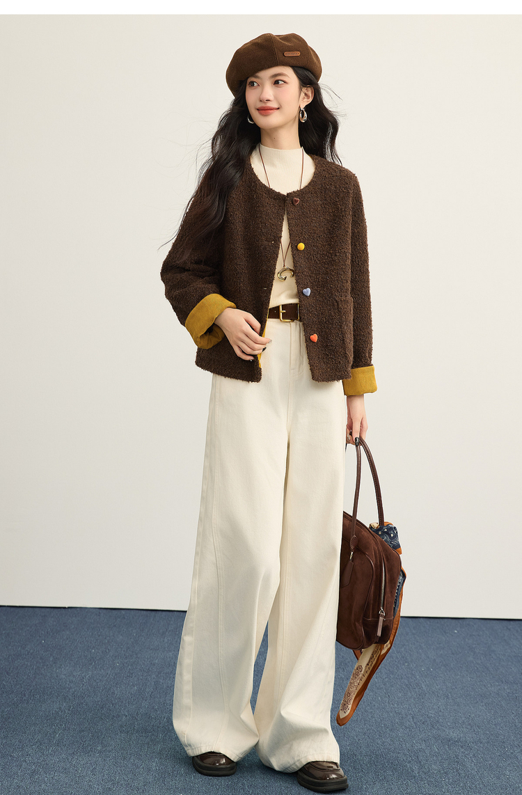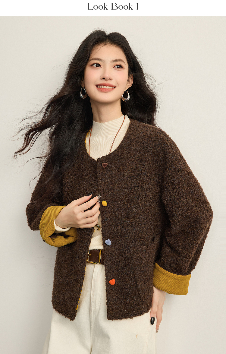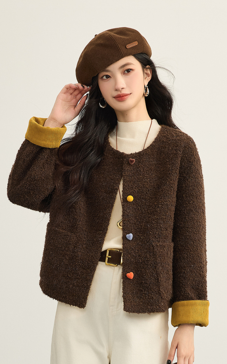 【12/17新品】熙世界韩系小香风羊毛短外套女2025冬季新款气质圆领毛绒开衫上衣