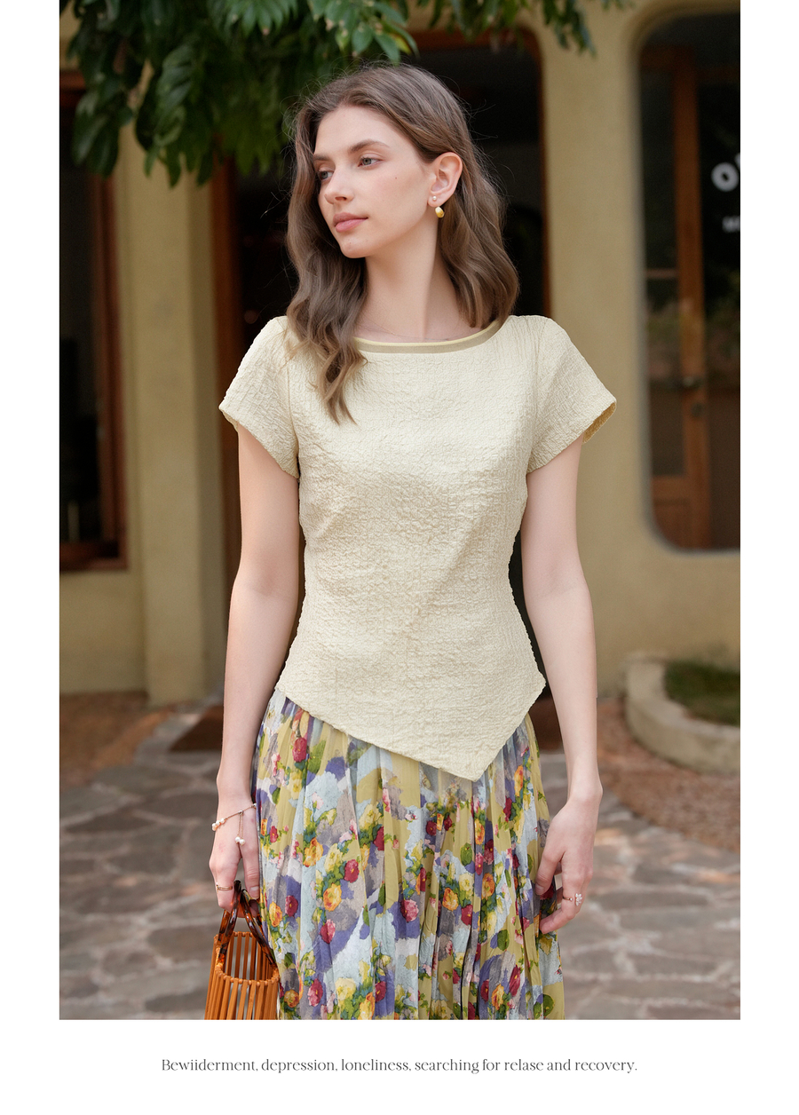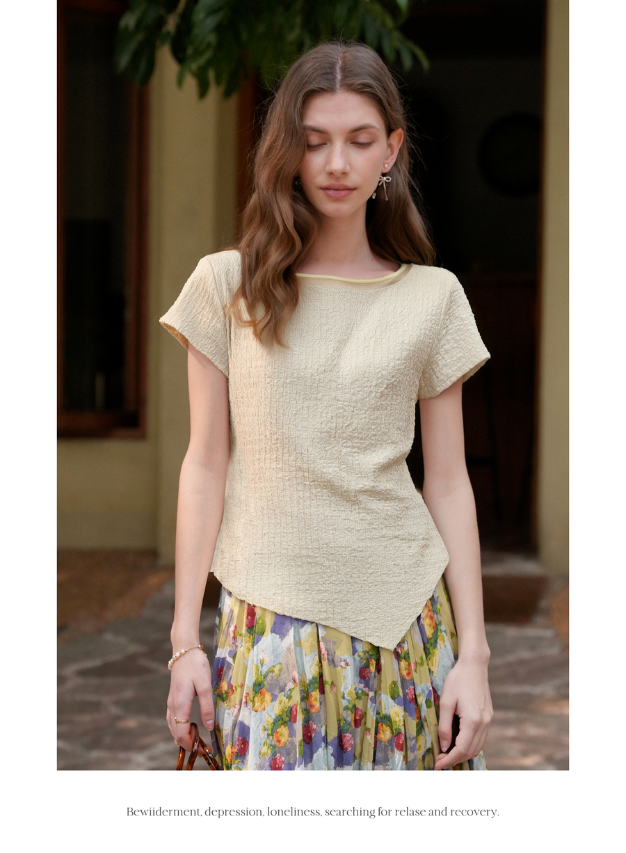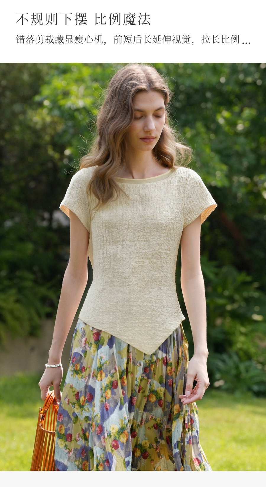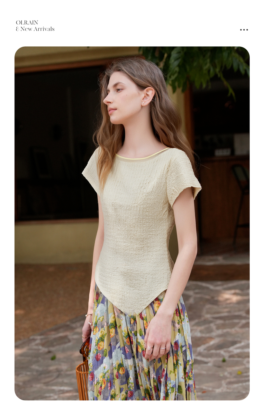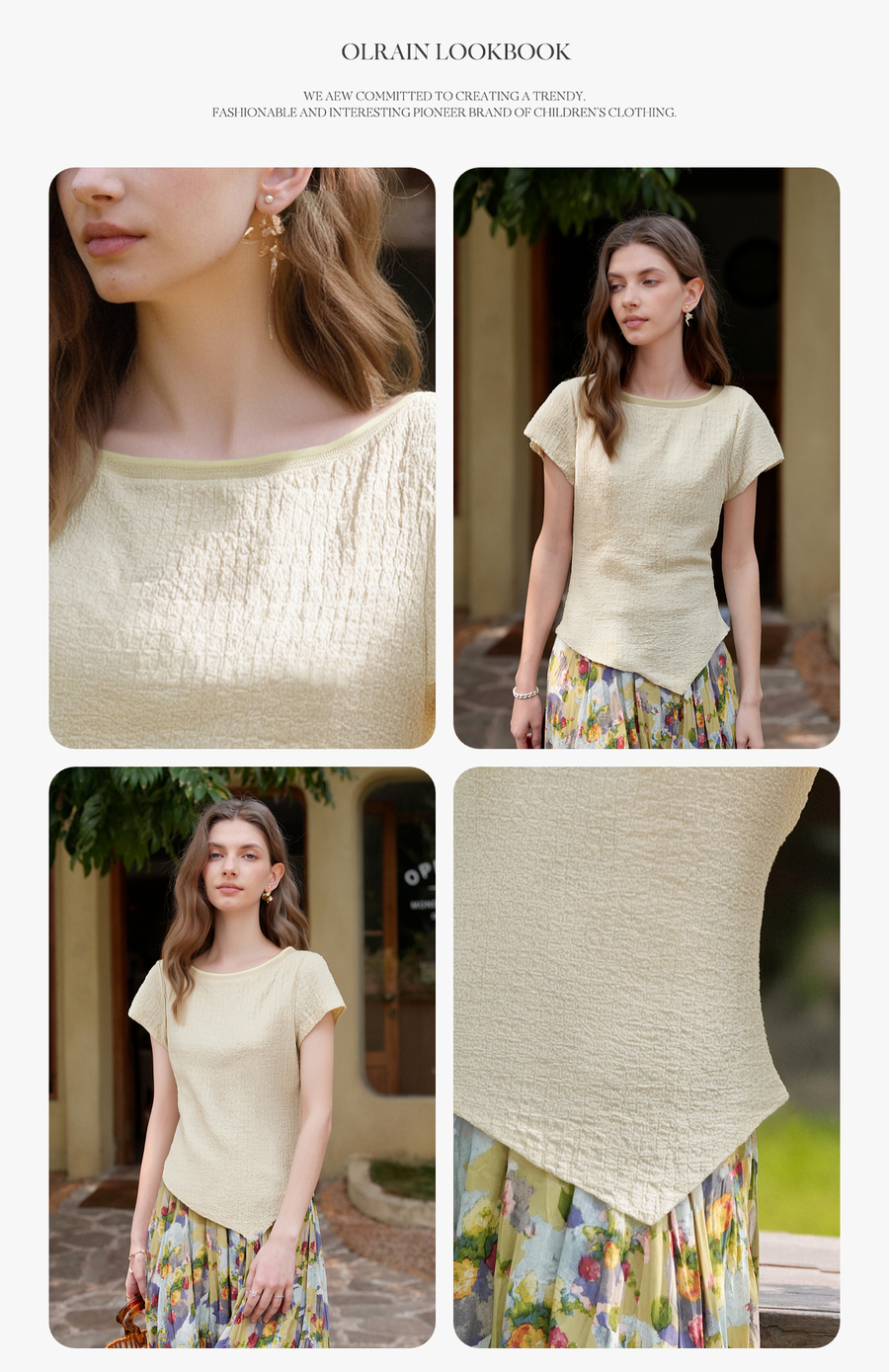 OLrain欧芮儿一字领法式肌理感T恤女夏季2025新款不规则短袖上衣