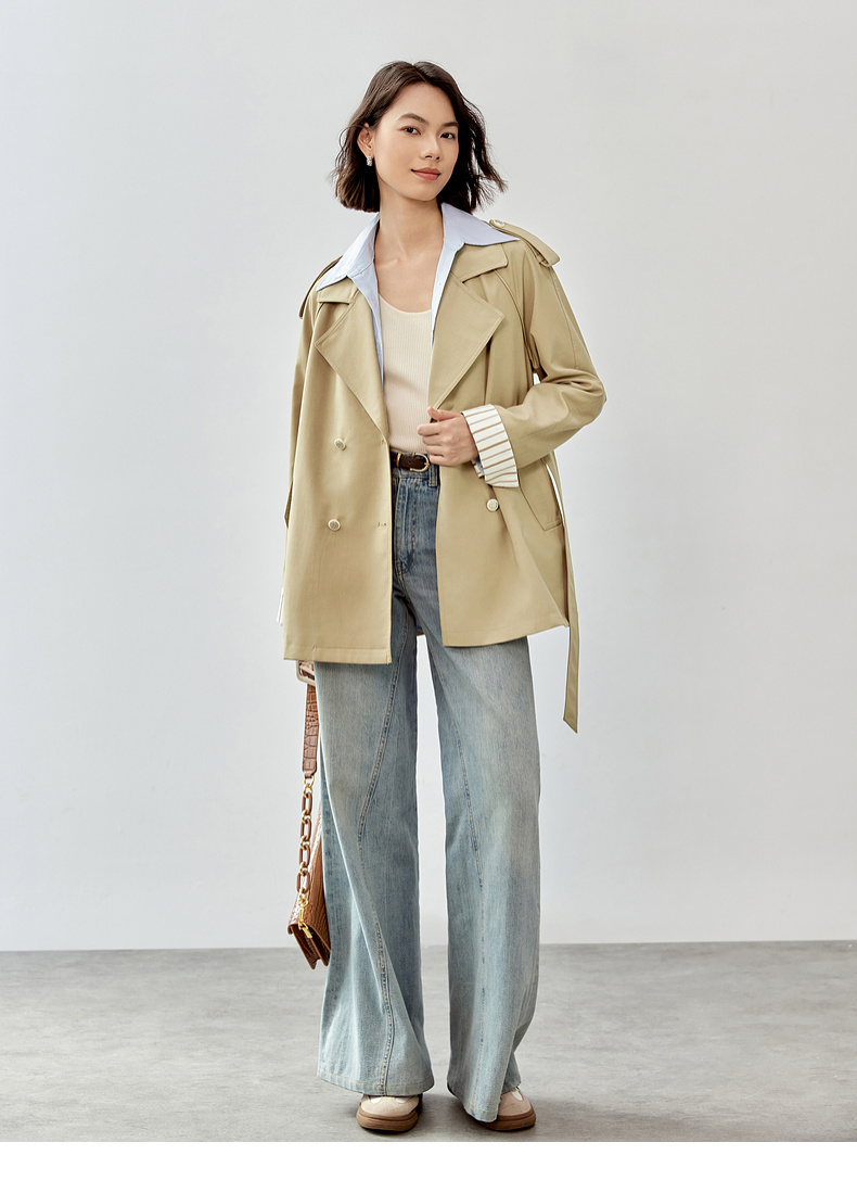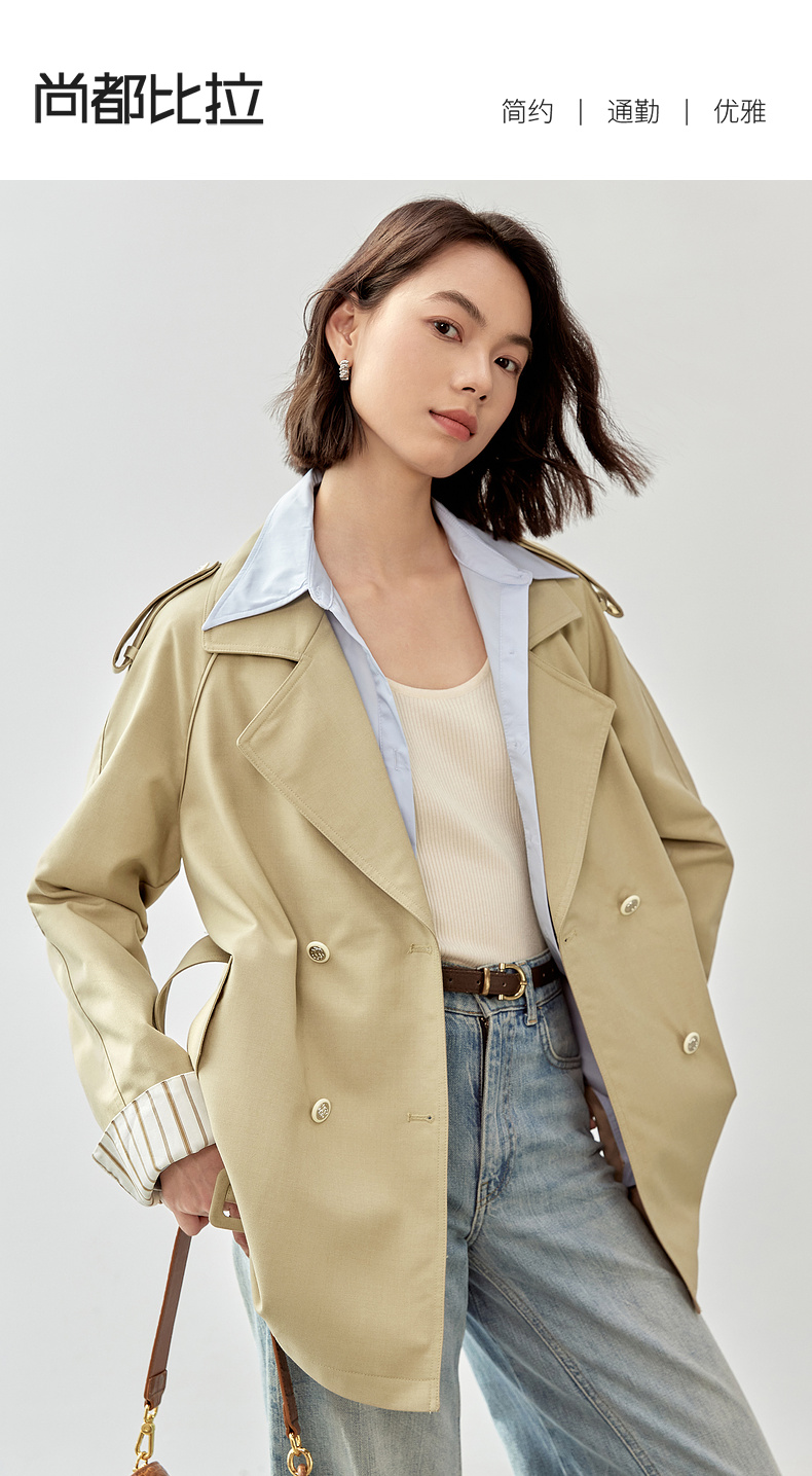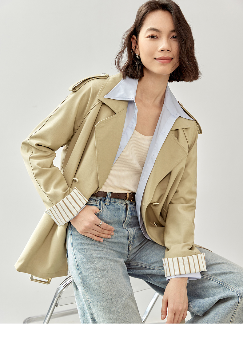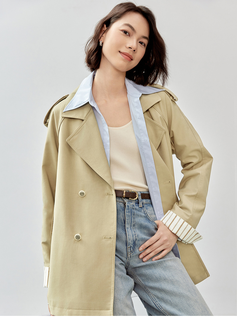 【内购】气质通勤经典翻领插肩袖双排扣翻折撞色袖口配可拆卸肩带宽松风衣-153FB3591X