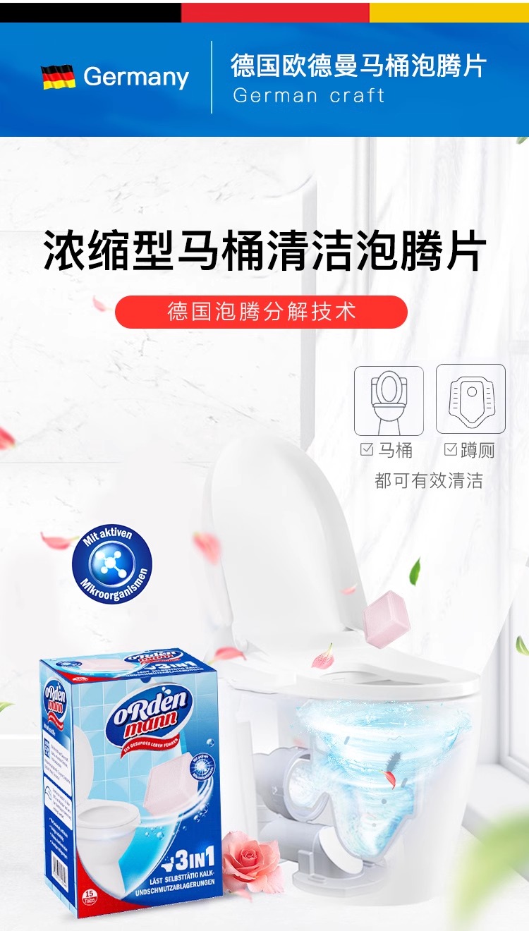 【夏日马桶除味推荐】德国欧德曼浓缩型马桶清洁泡腾片玫瑰花香除垢尿渍除臭去味15克*16片/盒【中欧班列精选】