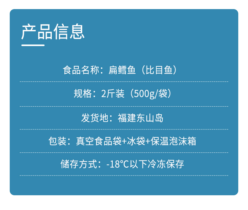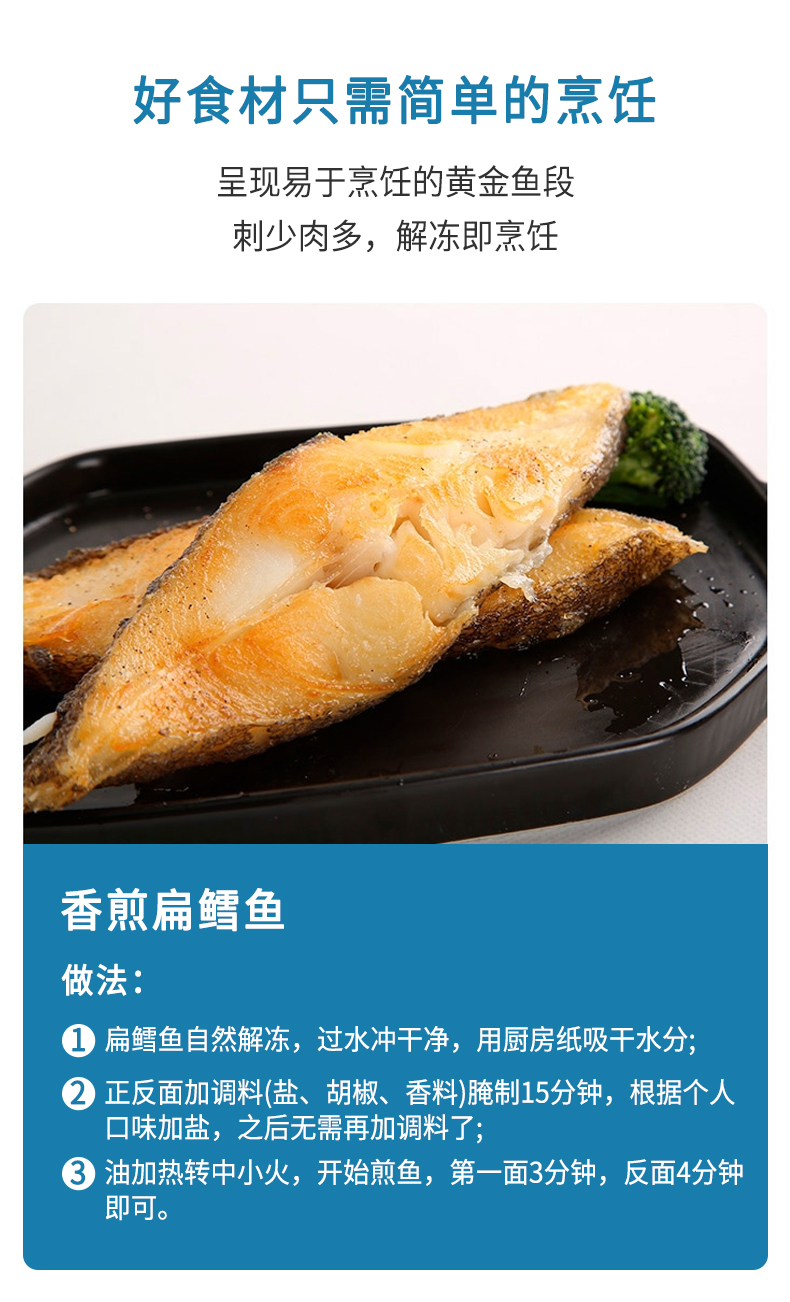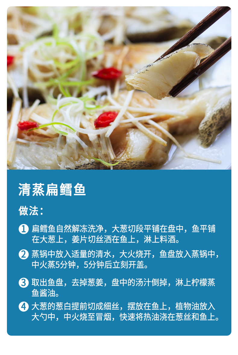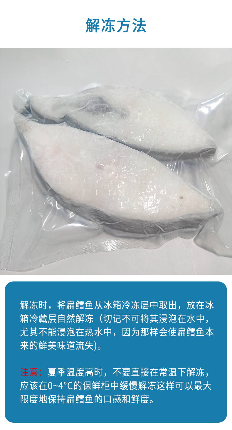 注意:夏季温度高时,请不要直接在常温下解冻,应该在0~4°C的保鲜柜中缓慢解冻这样可以最大限度地保持扁鳕鱼的口感和鲜度。