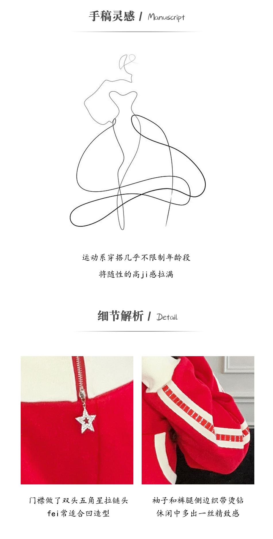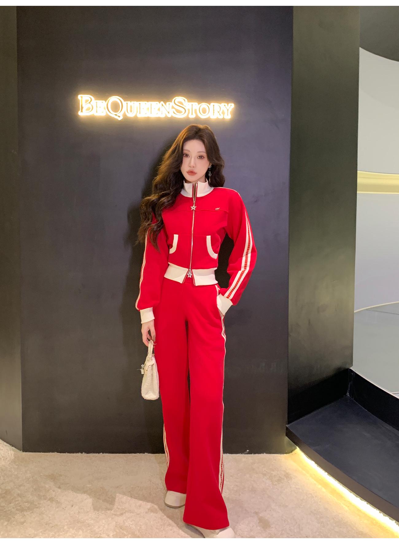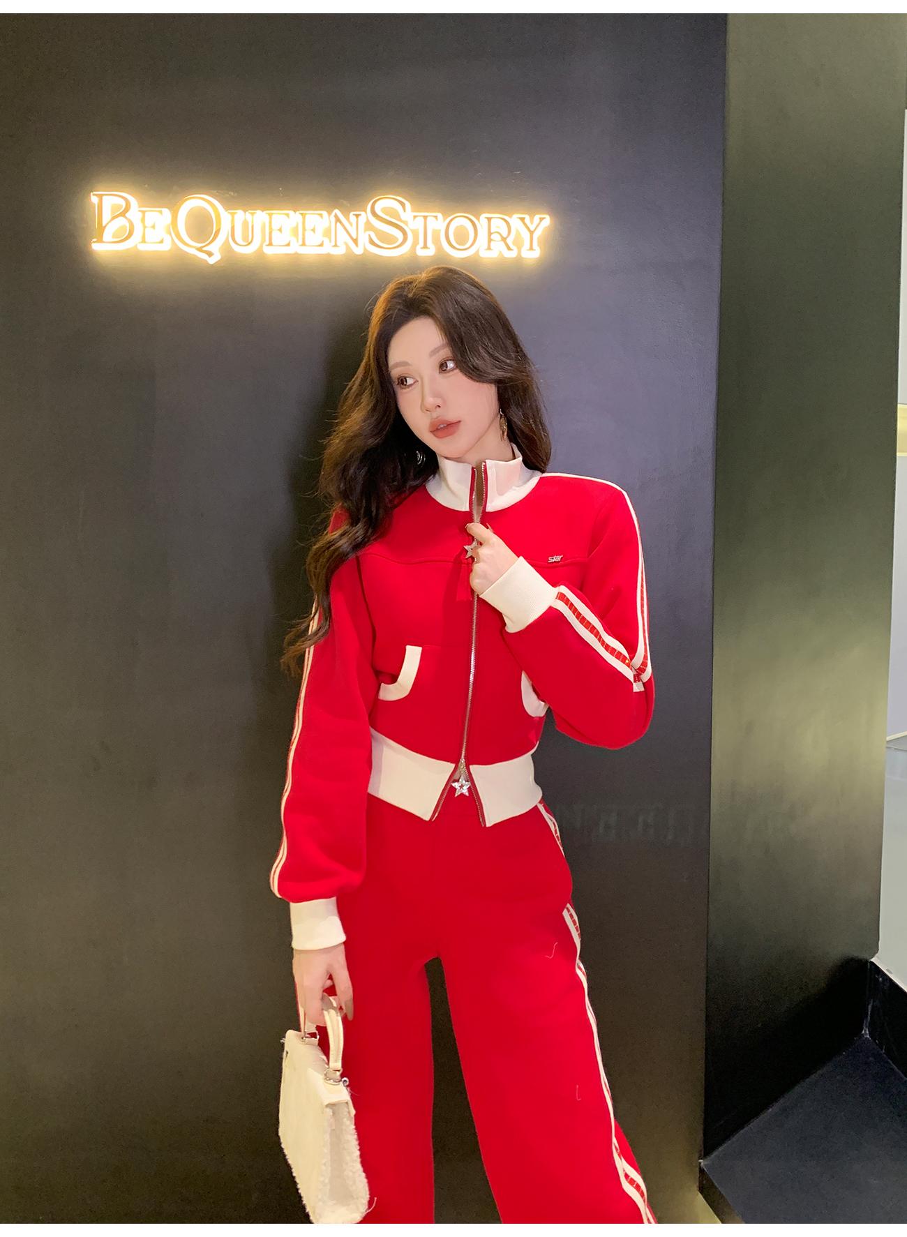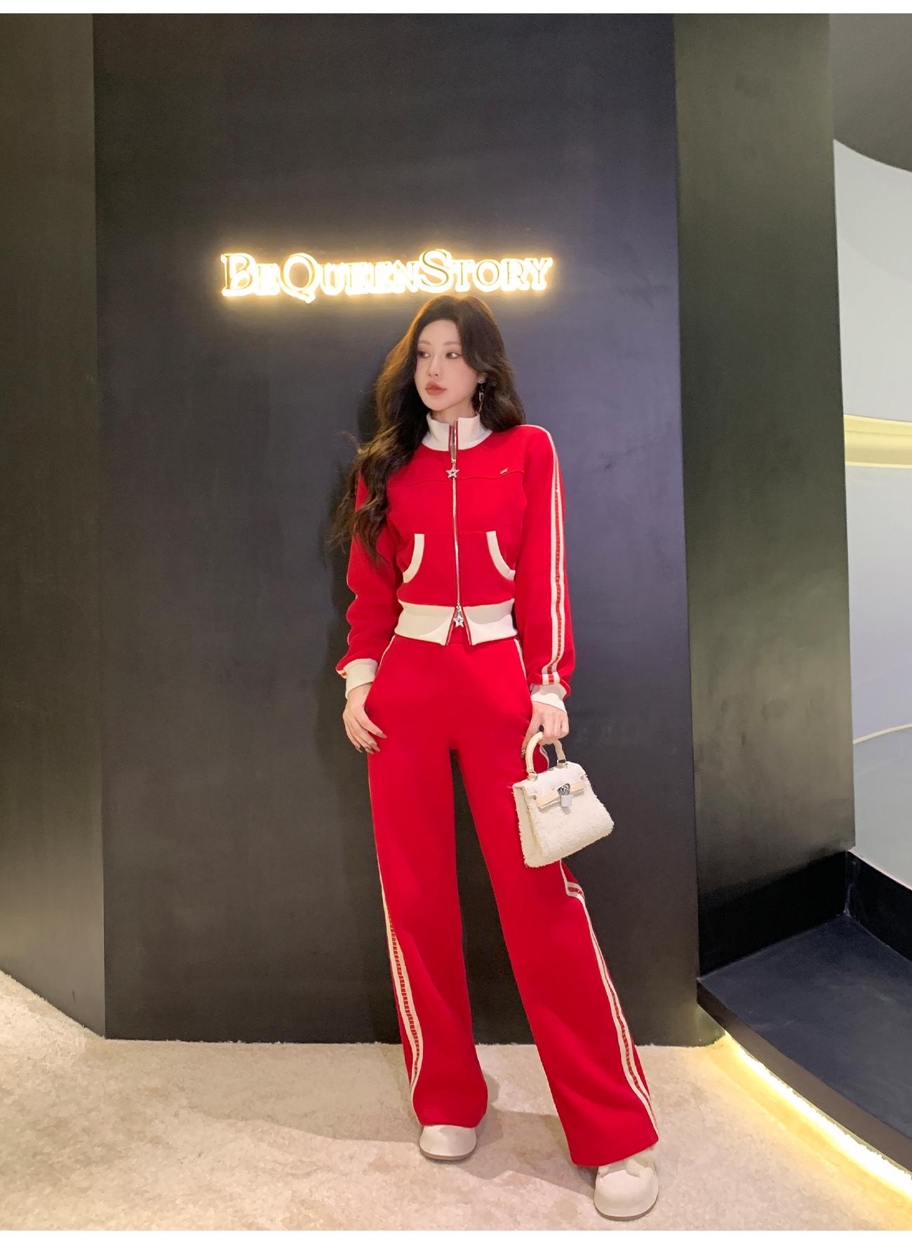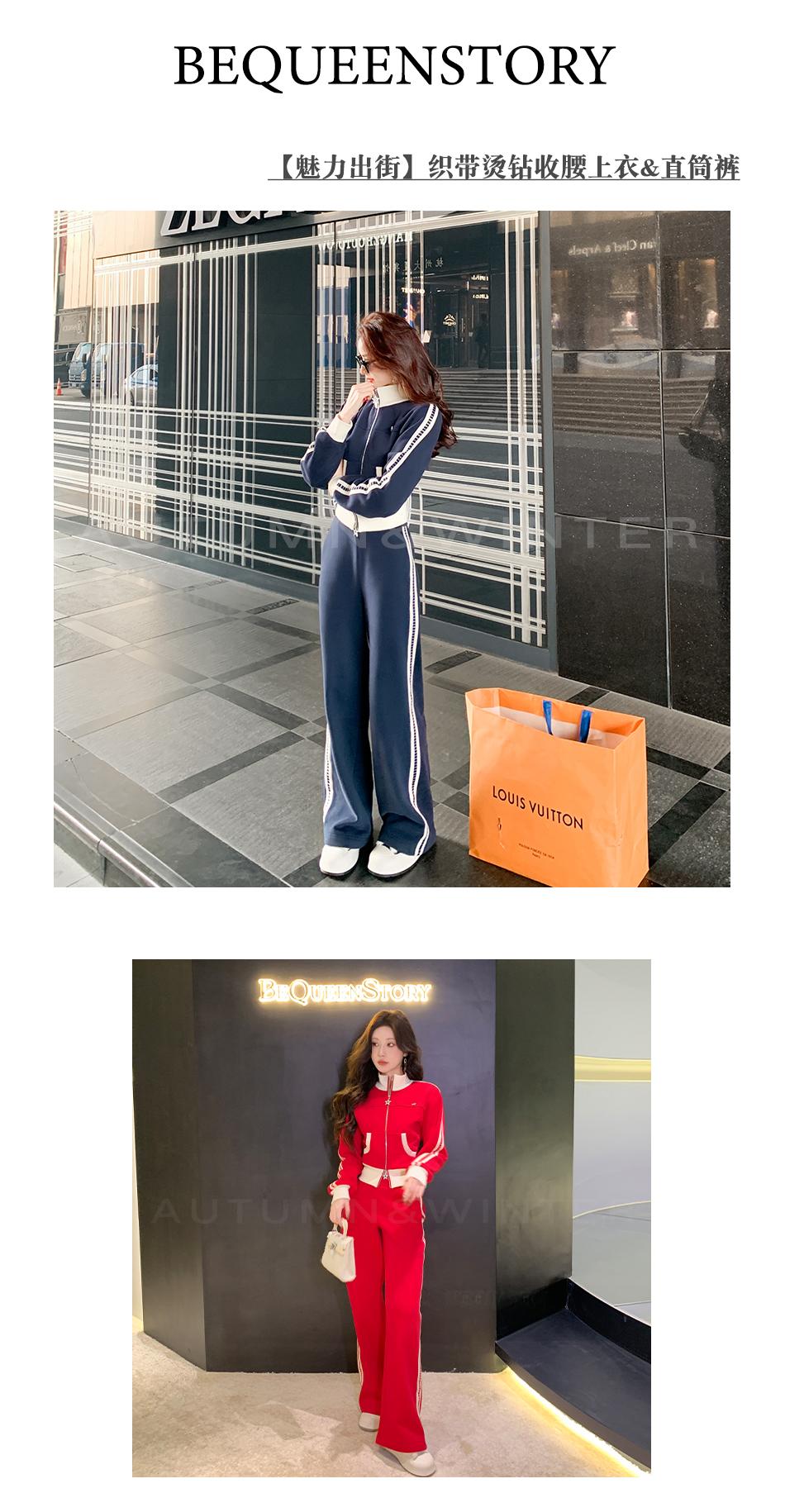 BeQueenStory【魅力出街】320g加绒烫钻撞色收腰直筒裤休闲显瘦套装