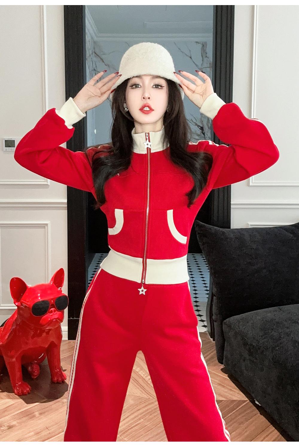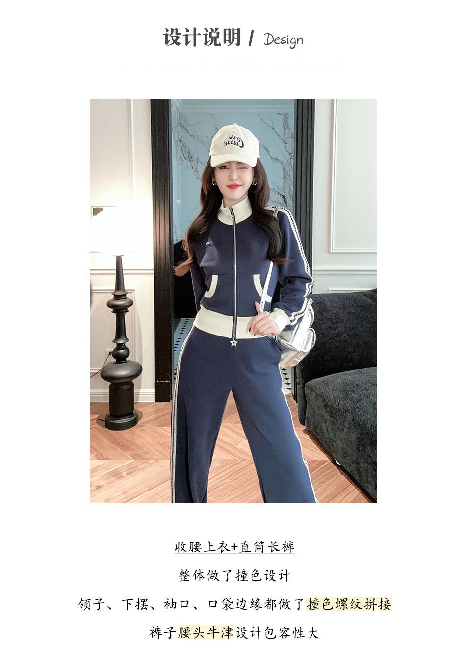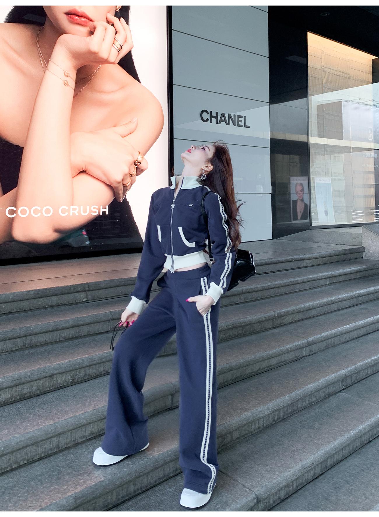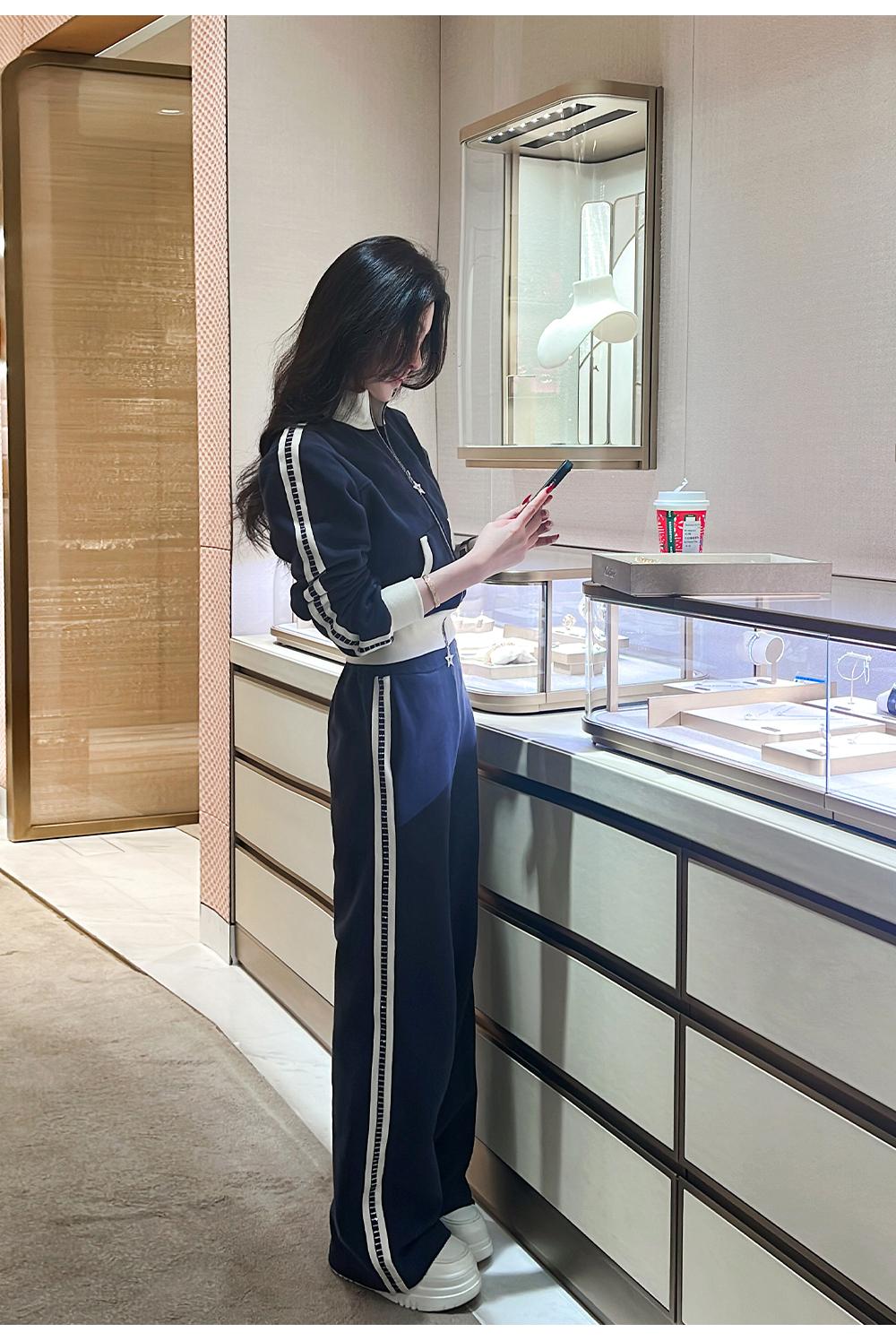 BeQueenStory【魅力出街】320g加绒烫钻撞色收腰直筒裤休闲显瘦套装