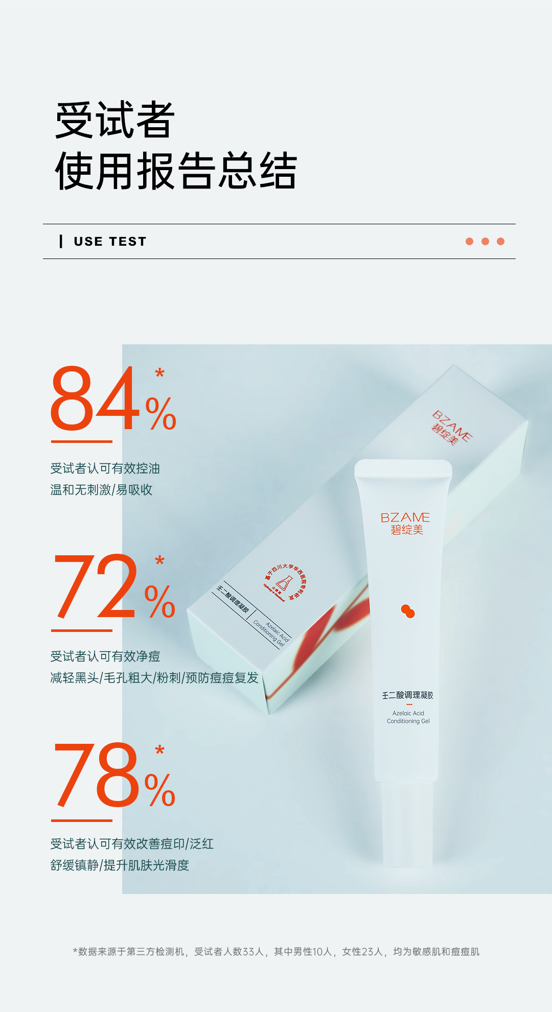 1、碧绽美壬二酸调理凝胶,每周夜间使用2-3次,点涂在(玫瑰)痤疮、黑头、粉刺的部位;需建立耐受,首次使用观察3-5分钟,有无泛红或者刺辣(有刺辣即刻冲洗,涂修复膏),逐渐延长至10-20分钟,再冲洗,涂修复凝胶;以此类推,逐渐延长至1-2小时无不适,再冲洗;