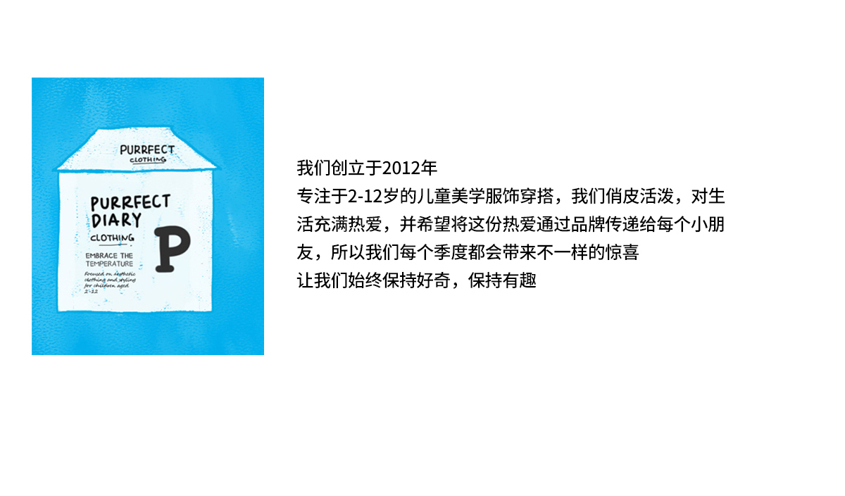 - Purrfect-Diary专注于贴近自然随性的穿着概念,轻奢平价的童装文化传播,在产品设计上更加注重婴童穿着的舒适性、安全性、更出众的国际化品牌,将欧美的育婴文化在中国进行深入的传播与推广。