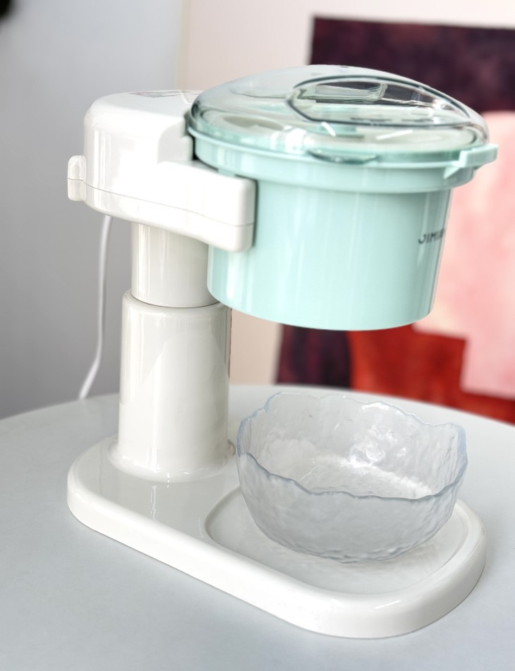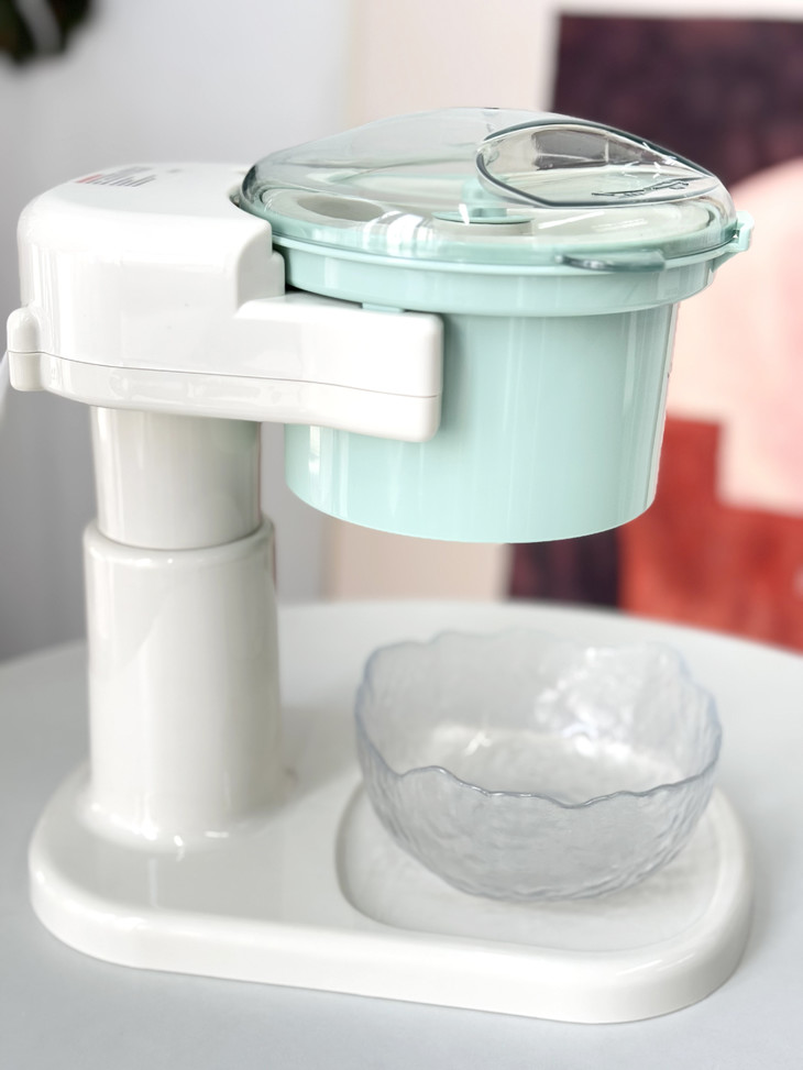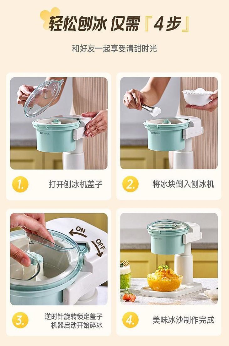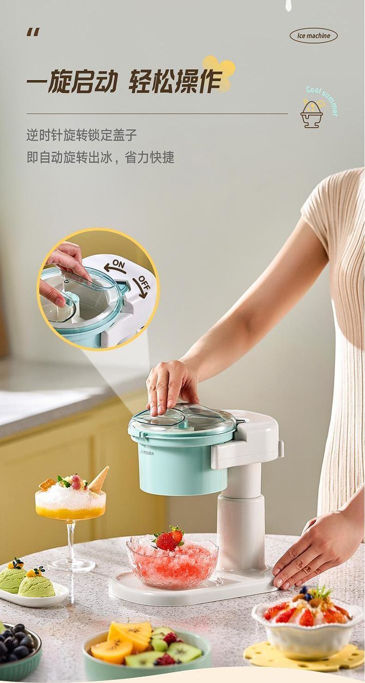 仿佛回到小时候放假过家家 操作巨巨巨巨巨简单 插上电源 逆时针旋转锁定盖子 就会自动旋转出冰哦 省力又快捷 🔺然后把冻好的冰倒进去 🔺转转转!绵绵密密的冰沙雪一样落下 分分钟就能得到一碗冰冰凉凉的绵绵冰! 🍨冰爽口感~香甜味道~健康又美味 让人瞬间忘却炎热的烦恼~~