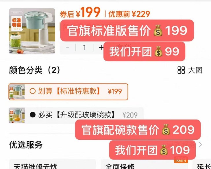 先来看看我们的价格 官旗标准版售价199,我们开团99元 官旗升级配玻璃碗款售价209,我们开团99-109,整整便宜了100