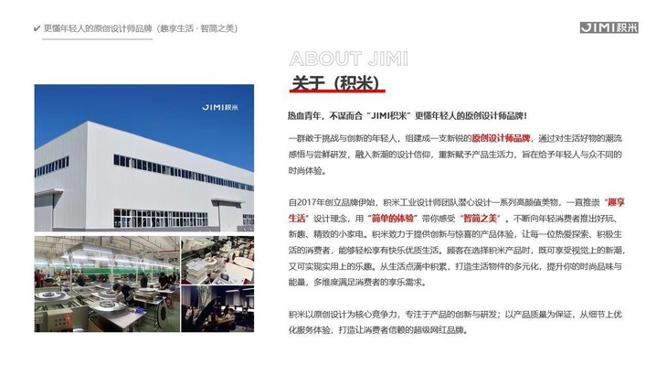 【关于品牌】 新锐原创设计品牌,通过对生活好物的潮流感悟与尝鲜研发,融入新潮的设计信仰,重新赋予产品生活力,旨在给予年轻人与众不同的时尚体验。 自2017年创立品牌伊始,积米工业设计师团队潜心设计一系列高颜值美物 一直推崇“趣生活”设计理念,用“简单的体验”带你感受“智简之美”。不断向年轻消费者推出好玩、新趣、精致的小家电。 积米致力于提供创新与惊喜的产品体验,让每一位热爱探索、积极生活的消费者,能够轻松享有快乐优质生活。 顾客在选择积米产品时,既可享受视觉上的新潮又可实现实用上的乐趣。 从生活点滴中积累,打造生活物件的多元化,提升你的时尚品味与能量,多维度满足消费者的享乐需求。 积米以原创设计为核心竞争力,专注于产品的创新与研发,以产品质量为保证,从细节上优化服务体验,打造让消费者信赖的超级网红品牌。