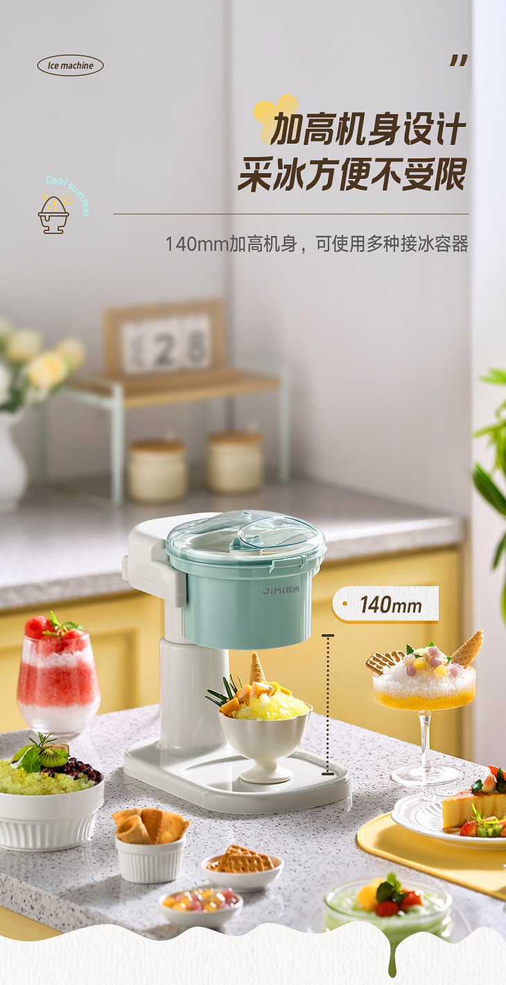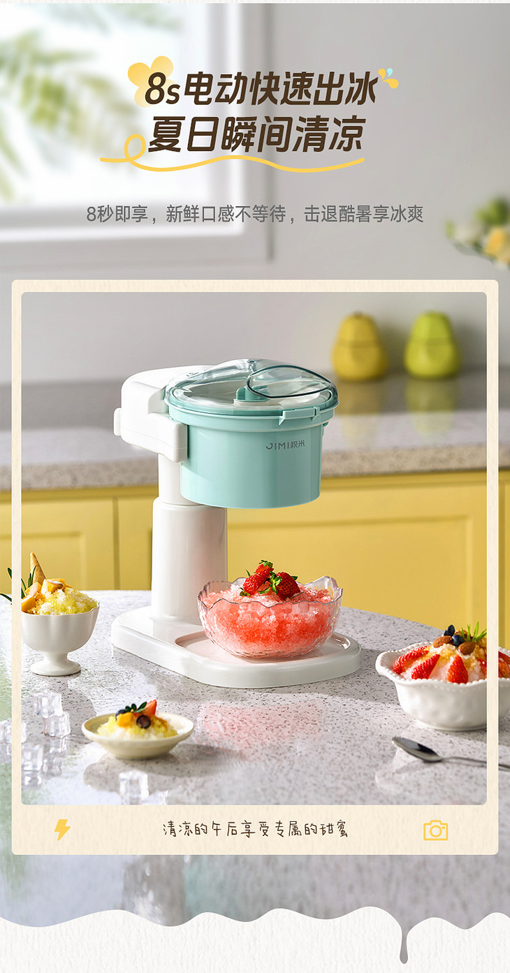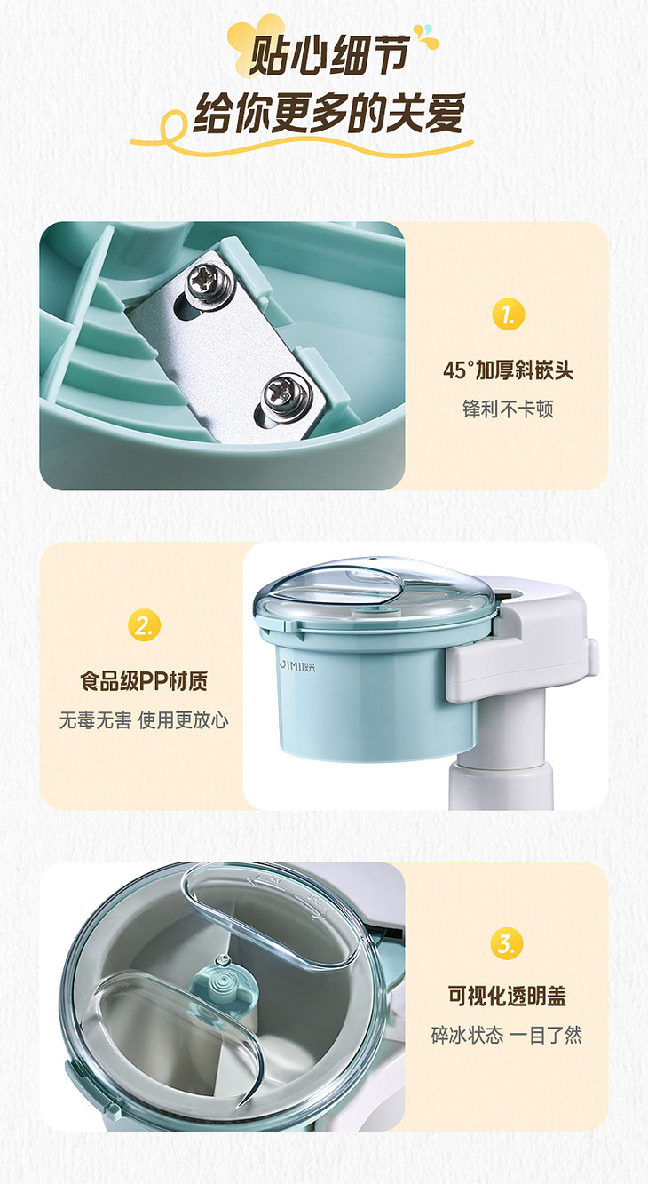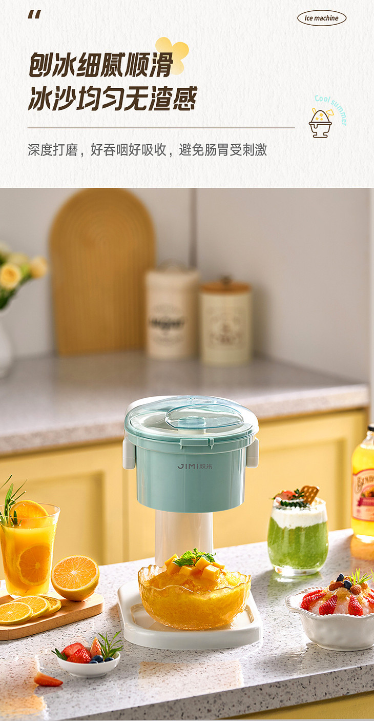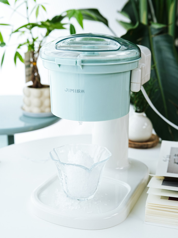 ● 积米家用全自动刨冰机电动碎冰机(核心卖点): ❶、8秒冰沙速度磨,新鲜口感不等待 ❷、细腻顺滑,冰沙均匀无渣感 ❸、120mm大口径碎冰,硬软碎冰都能刨 ❹、一旋启动,简单操作不复杂 ❺、320mm加高机身设计,采冰更方便,适用多种接冰容器 ❻、可拆卸清洗,怒藏污纳垢 ❼、加厚45°斜嵌刀,高韧度不锈钢刀头 ❽、高硬度食品级PP材质,无有害物质,放心使用 ❾、可视化可视化透明盖,碎冰状态一目了然