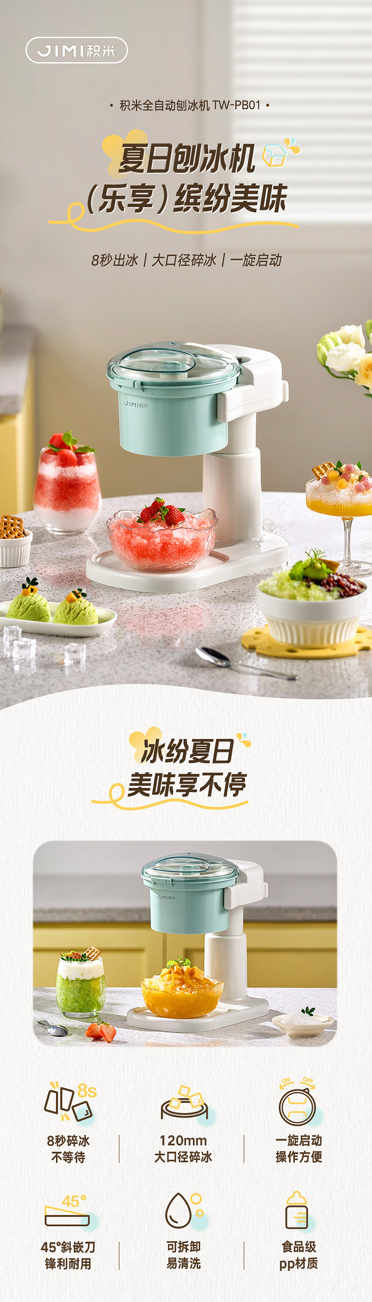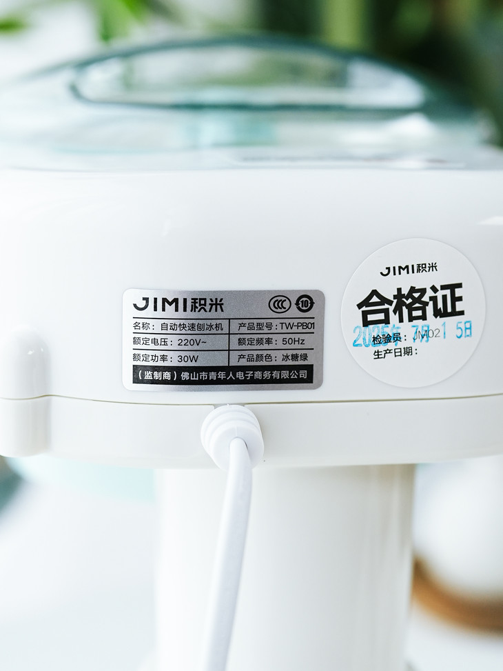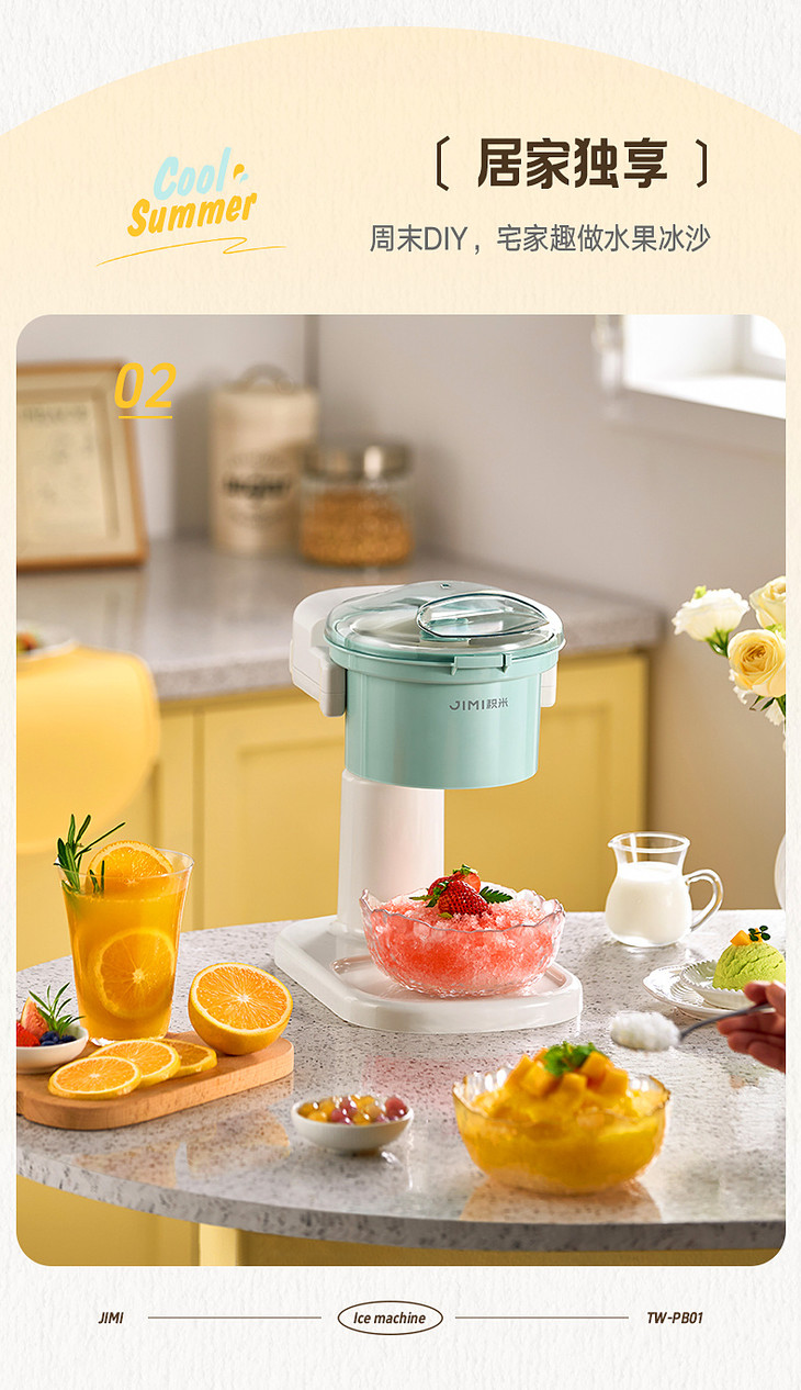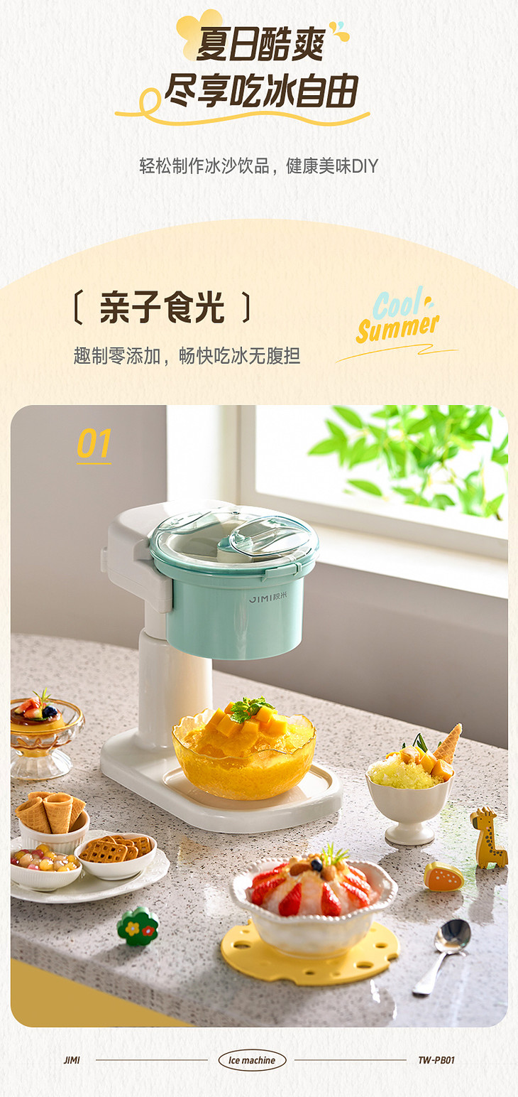 ● 积米家用全自动刨冰机电动碎冰机(核心卖点): ❶、8秒冰沙速度磨,新鲜口感不等待 ❷、细腻顺滑,冰沙均匀无渣感 ❸、120mm大口径碎冰,硬软碎冰都能刨 ❹、一旋启动,简单操作不复杂 ❺、320mm加高机身设计,采冰更方便,适用多种接冰容器 ❻、可拆卸清洗,怒藏污纳垢 ❼、加厚45°斜嵌刀,高韧度不锈钢刀头 ❽、高硬度食品级PP材质,无有害物质,放心使用 ❾、可视化可视化透明盖,碎冰状态一目了然