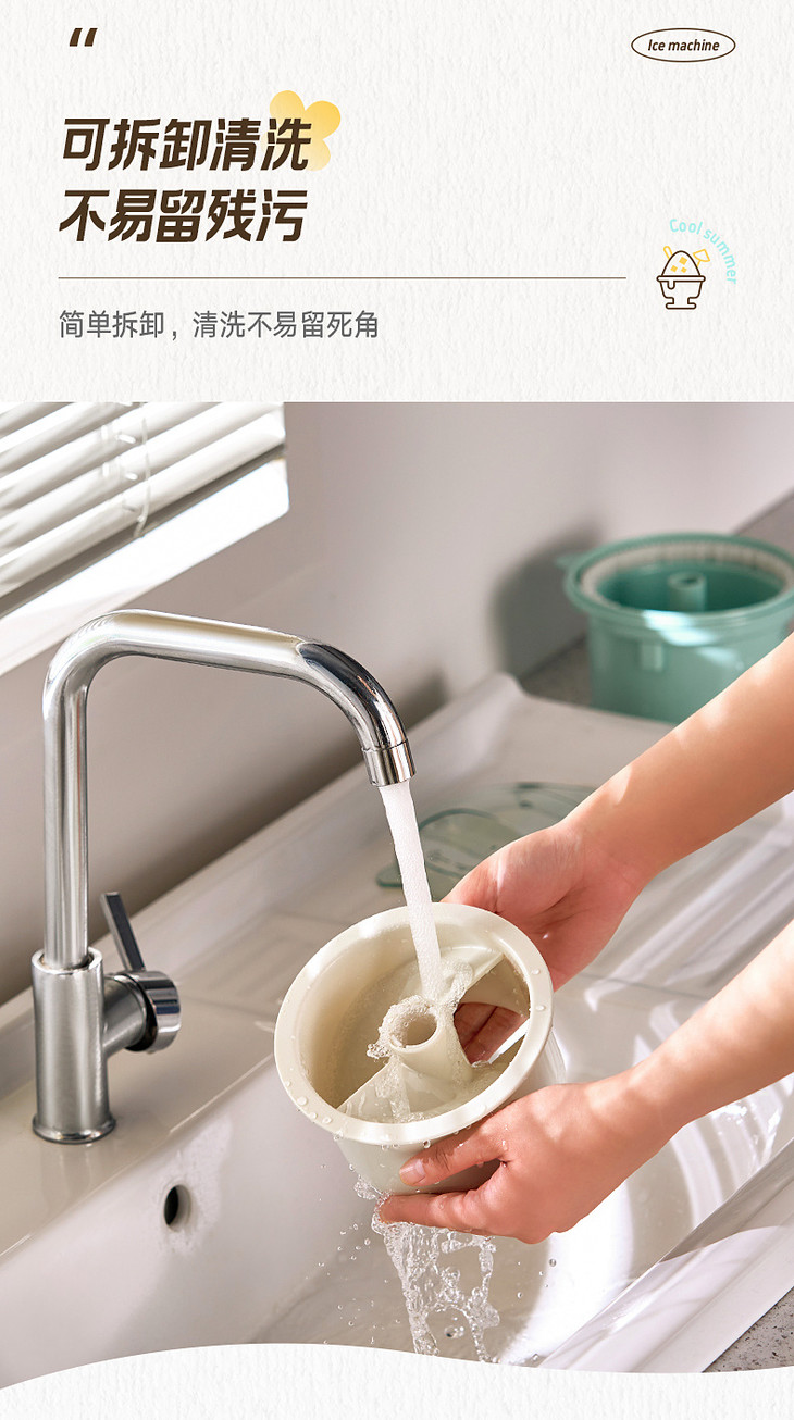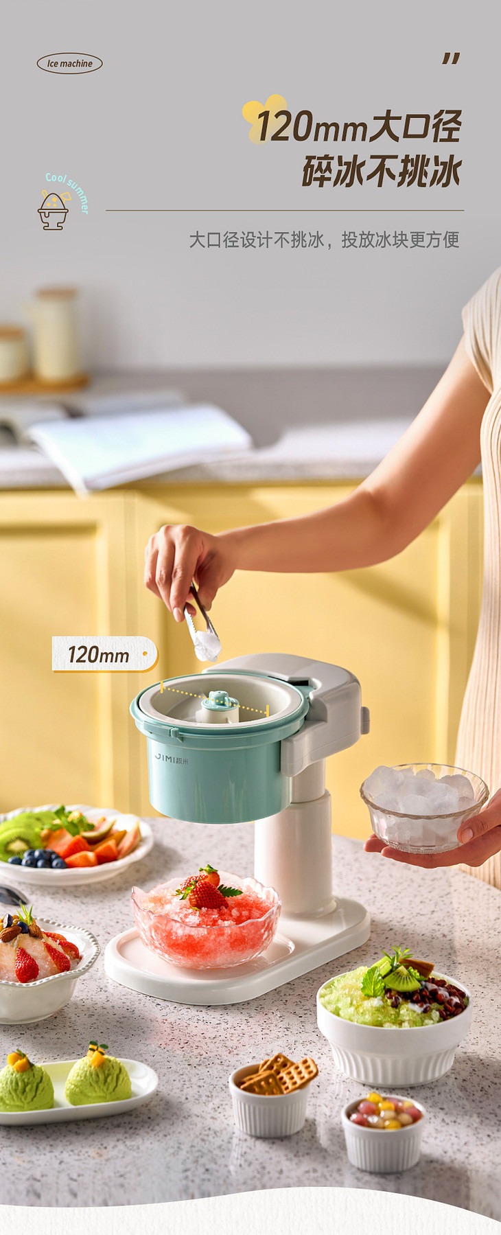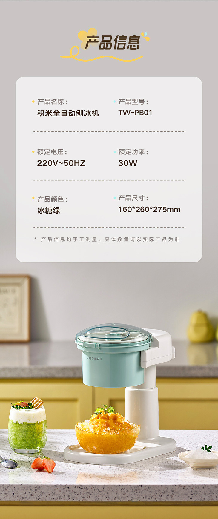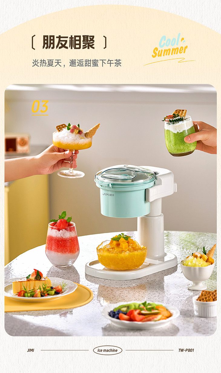 ● 积米家用全自动刨冰机电动碎冰机(核心卖点): ❶、8秒冰沙速度磨,新鲜口感不等待 ❷、细腻顺滑,冰沙均匀无渣感 ❸、120mm大口径碎冰,硬软碎冰都能刨 ❹、一旋启动,简单操作不复杂 ❺、320mm加高机身设计,采冰更方便,适用多种接冰容器 ❻、可拆卸清洗,怒藏污纳垢 ❼、加厚45°斜嵌刀,高韧度不锈钢刀头 ❽、高硬度食品级PP材质,无有害物质,放心使用 ❾、可视化可视化透明盖,碎冰状态一目了然