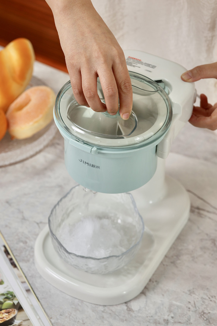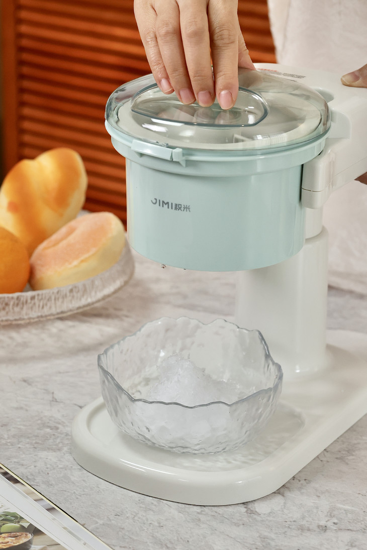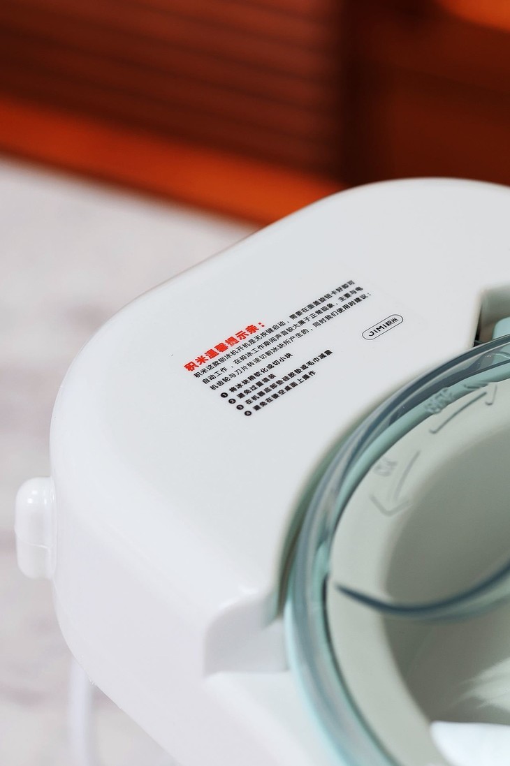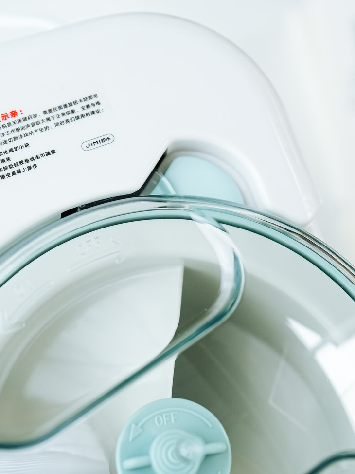 积米这款刨冰机开机是无按键启动,需要在面盖旋钮卡好即可自动工作 ,在碎冰工作期间声音较大属于正常现象,主要与电机齿轮与刀片转速切割冰块所产生的,同时我们使用时建议: